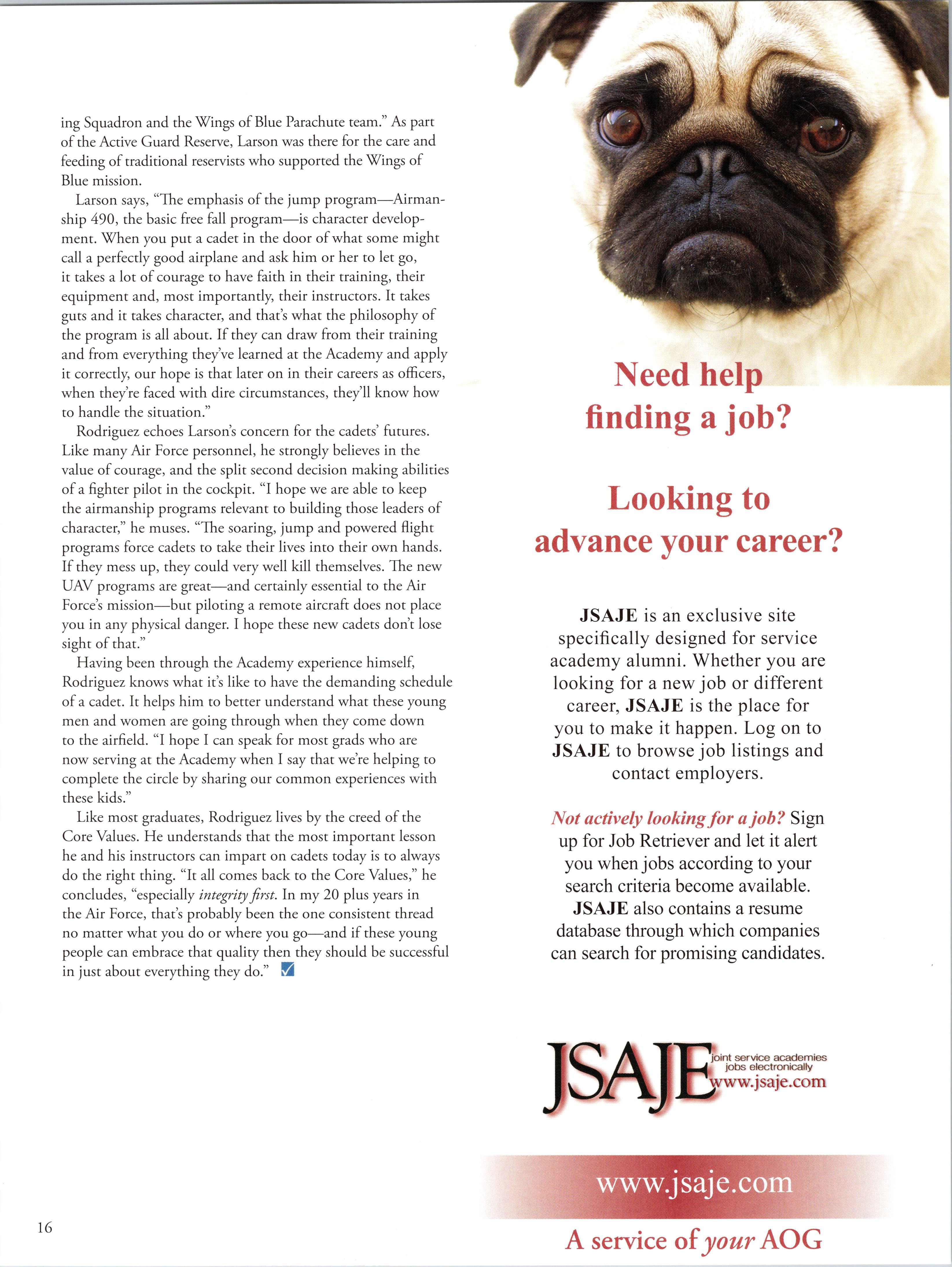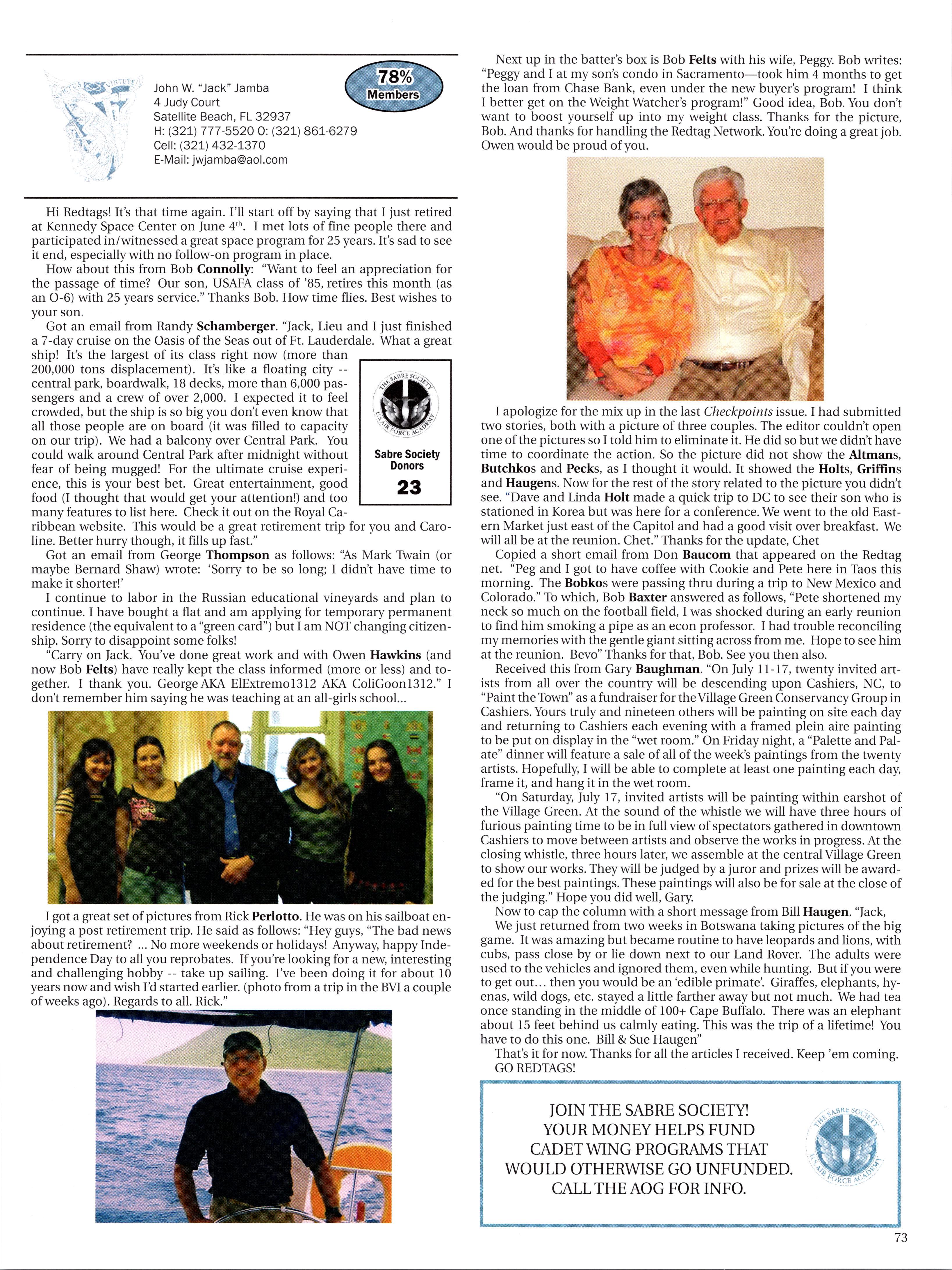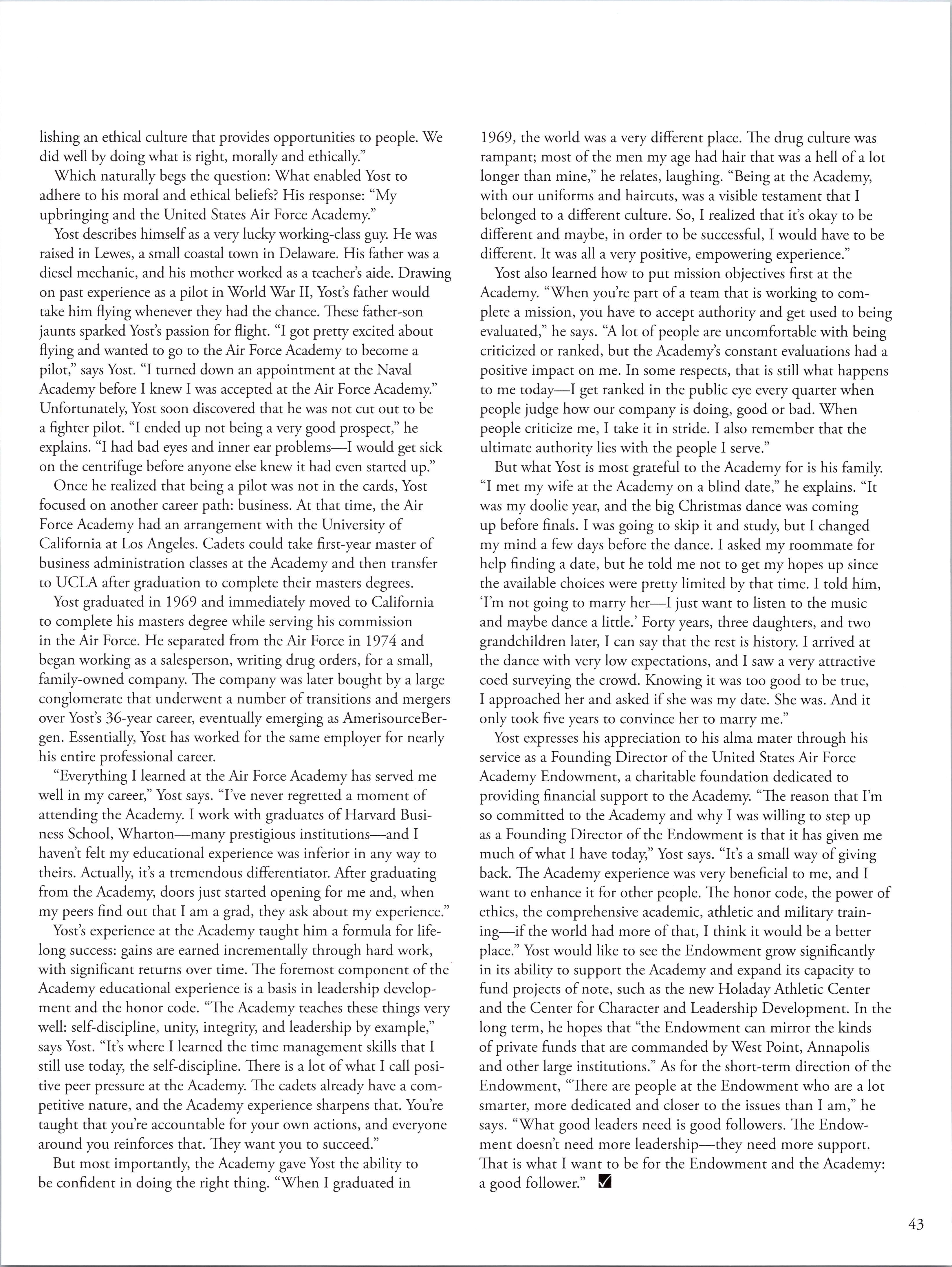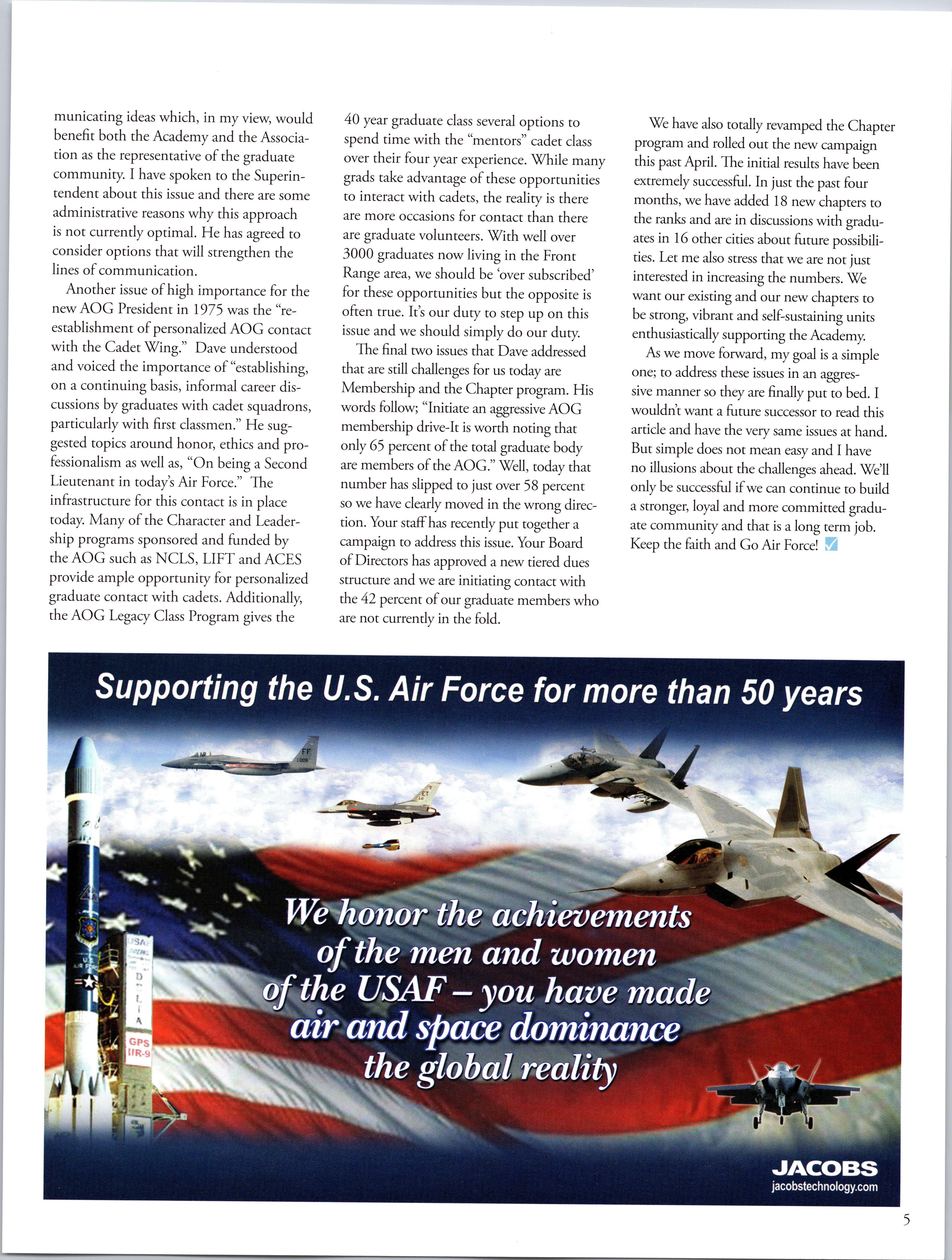 Another issue ofhigh importance for the new AOG President in 1975 was the “reestablishment ofpersonalized AOG contact with the Cadet Wing.” Dave understood and voiced the importance of“establishing, on a continuing basis, informal career discussions by graduates with cadet squadrons, particularly with first classmen.” He suggested topics around honor, ethics and professionalism as well as, “On being a Second Lieutenant in today’s Air Force.” The infrastructure for this contact is in place today. Many ofthe Character and Leadership programs sponsored and funded by the AOG such as NCLS, LIFT and ACES provide ample opportunity for personalized graduate contact with cadets. Additionally, the AOG Legacy Class Program gives the