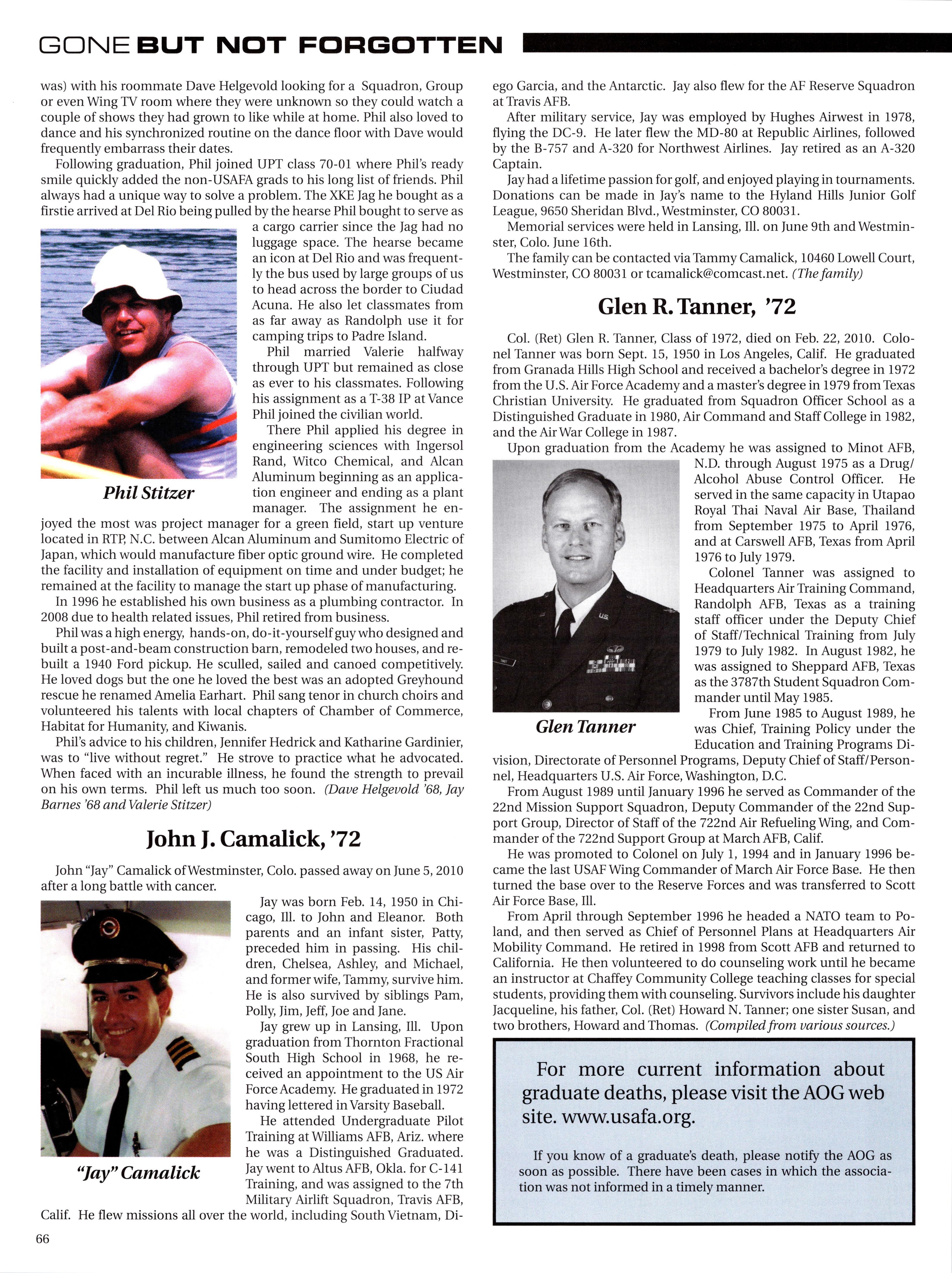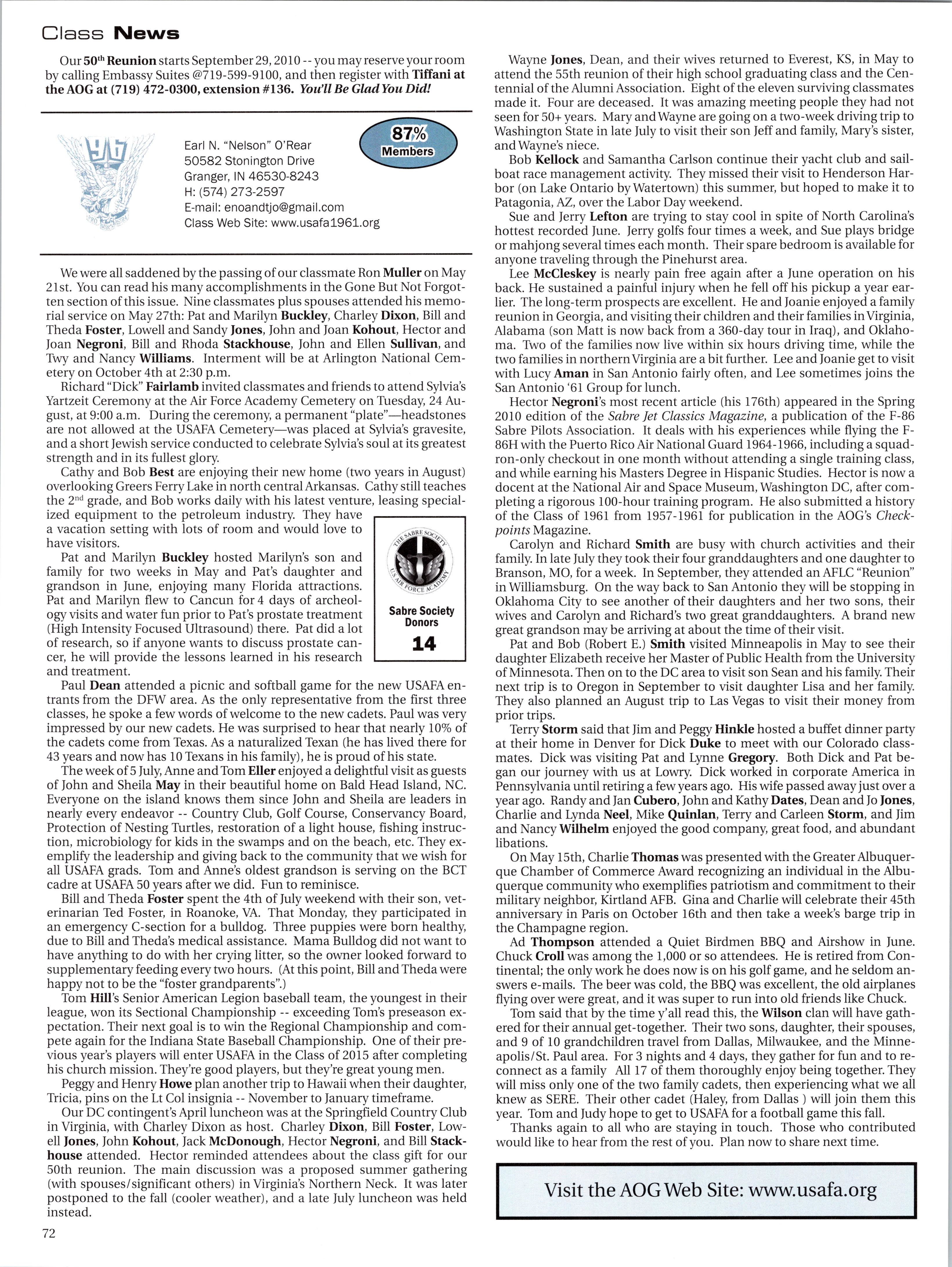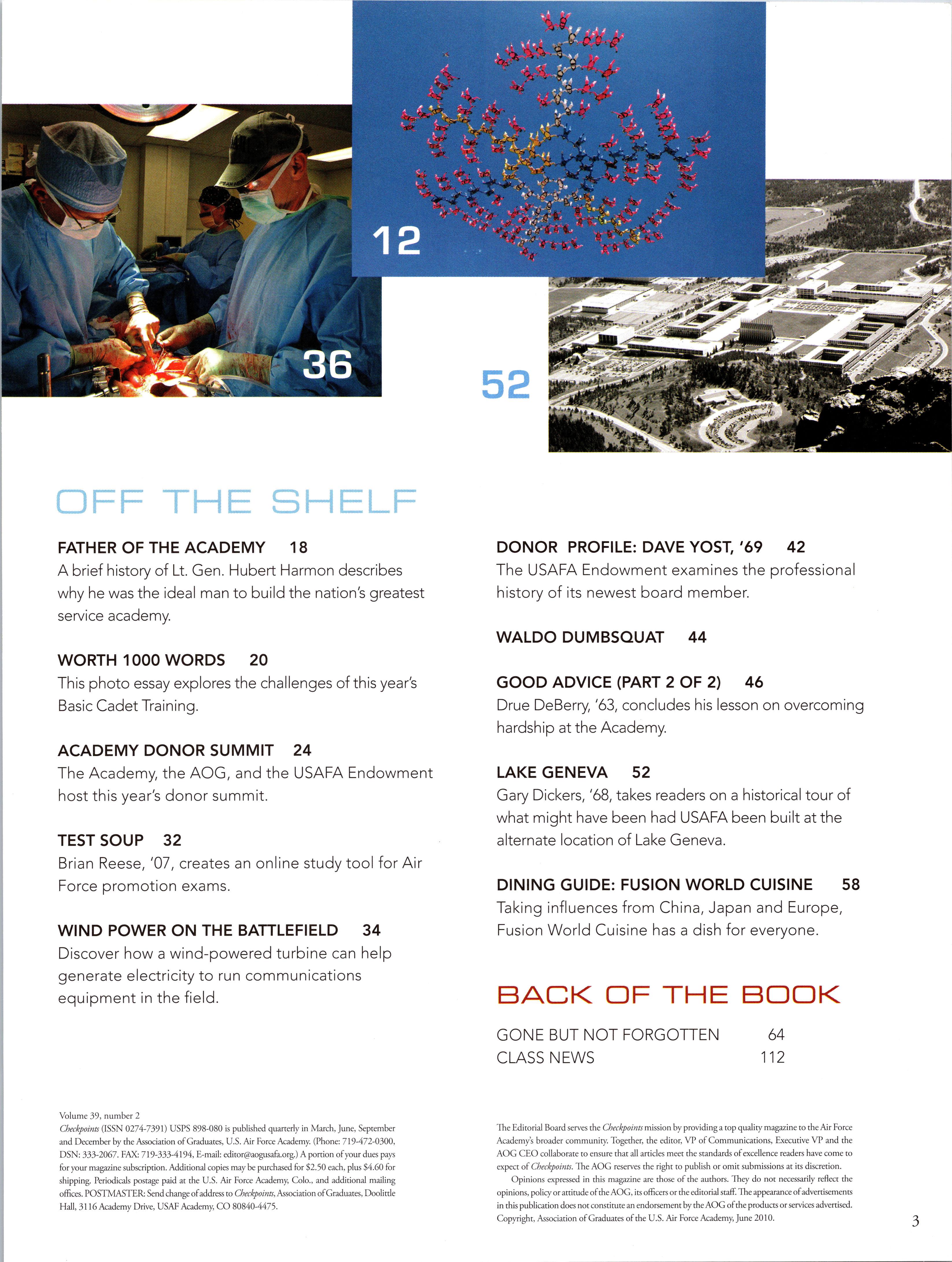 GONE BUT NOT FORGOTTEN 64 CLASS NEWS 112 Volume 39, number 2 Checkpoints (ISSN 0274-7391) USPS 898-080 is published quarterly in March, June, September and December by the Association ofGraduates, U.S. Air Force Academy. (Phone: 719-472-0300, DSN: 333-2067. FAX: 719-333-4194, E-mail: editor@aogusafa.org.) A portion ofyour dues pays for your magazine subscription. Additional copies may be purchased for $2.50 each, plus $4.60 for shipping. Periodicals postage paid at the U.S. Air Force Academy, Colo., and additional mailing offices. POSTMASTER: Send change ofaddress to Checkpoints, Association ofGraduates, Doolitde Hall, 3116 Academy Drive, USAF Academy, CO 80840-4475. The Editorial Board serves the Checkpoints mission byproviding a top qualitymagazine to theAir Force Academy’s broader community. Together, the editor, VP of Communications, Executive VP and the AOG CEO collaborate to ensure that all articles meet the standards ofexcellence readers have come to expect of Checkpoints. The AOG reserves the right to publish or omit submissions at its discretion. Opinions expressed in this magazine are those of the authors. They do not necessarily reflect the opinions, policy or attitude oftheAOG, its officers the editorial staff. The appearance ofadvertisements in this publication does not constitute an endorsement by theAOG ofthe products or services advertised. Copyright, Association ofGraduates ofthe U.S. Air Force Academy, June 2010. 3