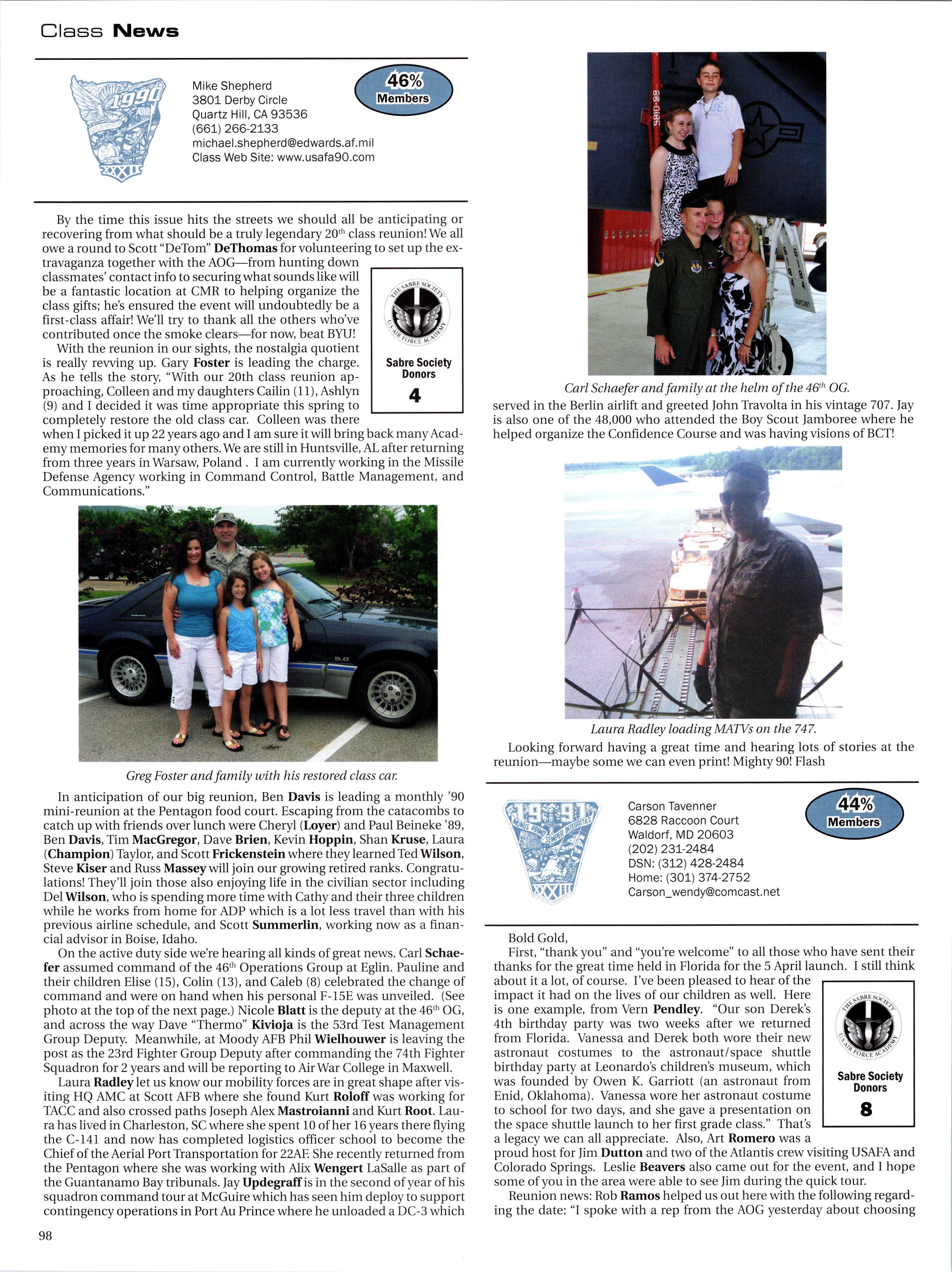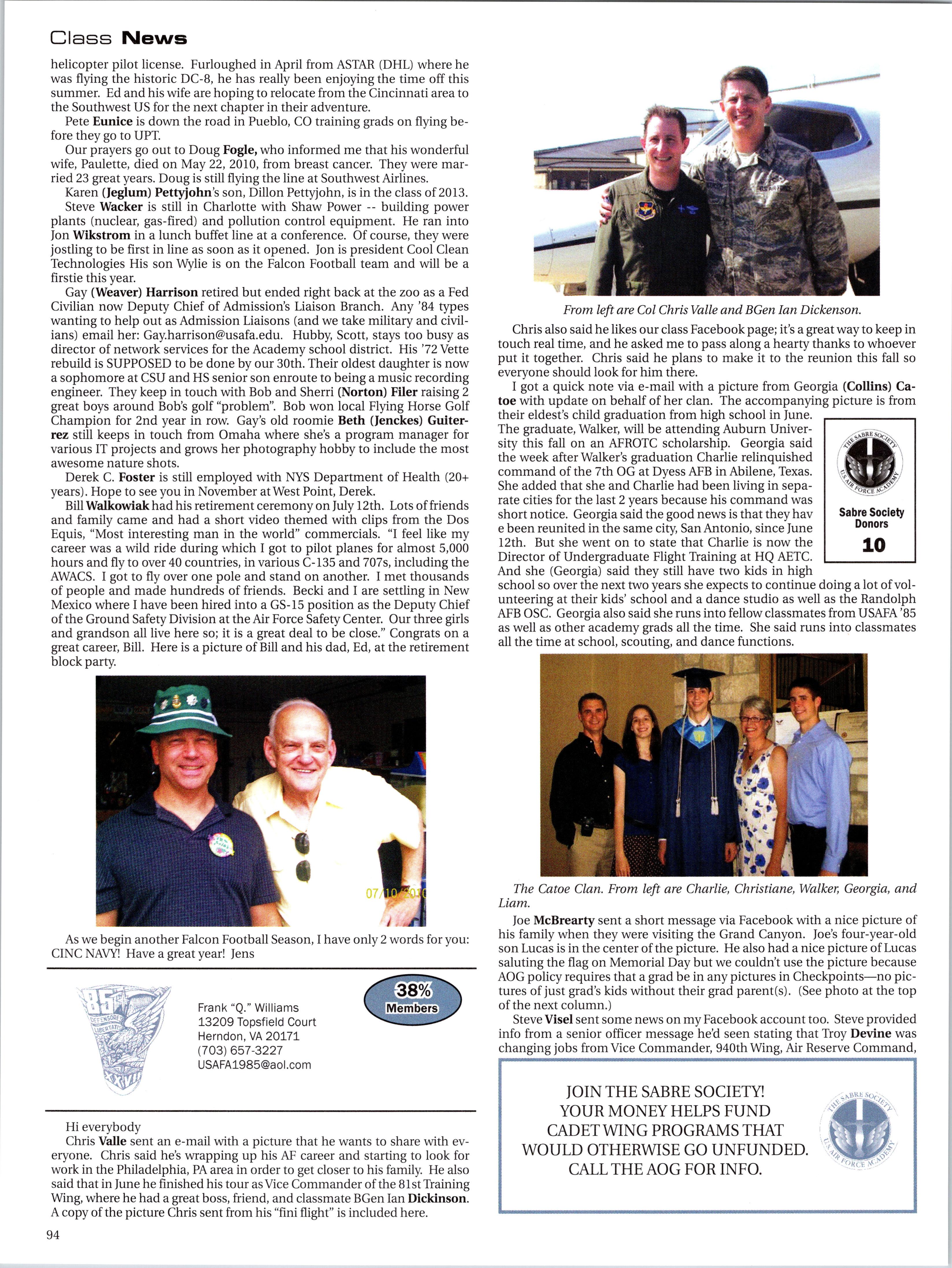 Back home at the Academy, things are as busy as ever with preparations for the fall semester. The AOG is pleased to welcome USAFA’s new Commandant, Brigadier General Richard Clark, ’86, and wish him the best in his new post. We also send our farewell compliments to Brigadier General Sam Cox, ’84, as he takes on his new assignment as Commander ofthe 618th Tanker Airlift Control Center at Scott AFB. Brig. Gen. Cox made significant and lasting contributions during his tenure. Brig. Gen. Clark comes to USAFA from Barksdale AFB, where he was the 8th AF Vice Commander. We also welcome Colonel Tamra Rank, ’83, who has become the Vice Superintendent, replacing Colonel Paul Ackerman, ’82, who retired in Colorado Springs after a distinguished career.