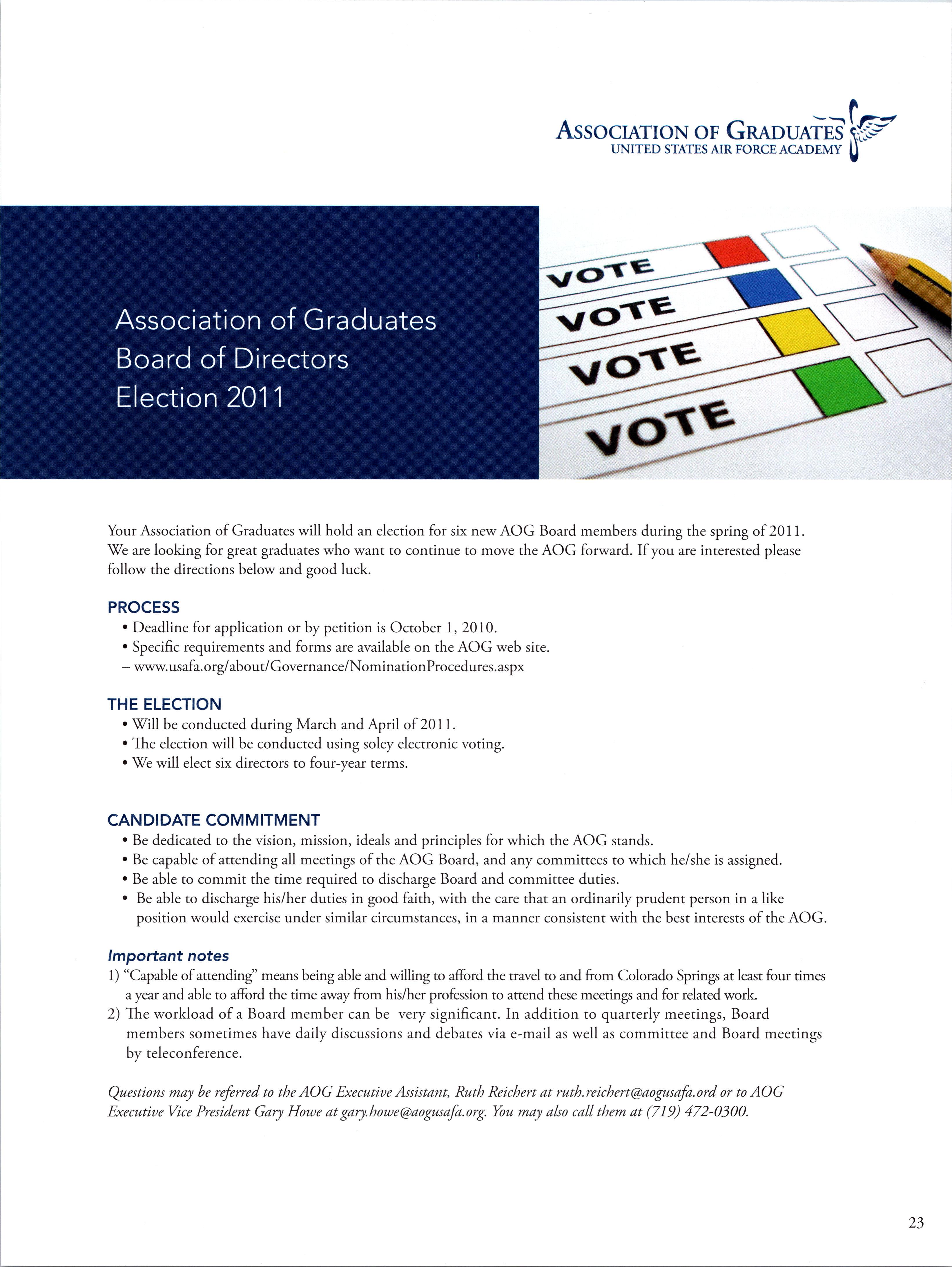 Your AOG Board is well on the way to providing all of us with a vastly upgraded Bylaws document, which you will have the opportunity to vote on and approve at next year’s election. During that time, you will also elect five Board Directors. For ballot issues to succeed, 25% of our membership must vote! So we ask each of you to vote and to encourage your fellow graduates to do so as well. In the meantime, go Falcons!