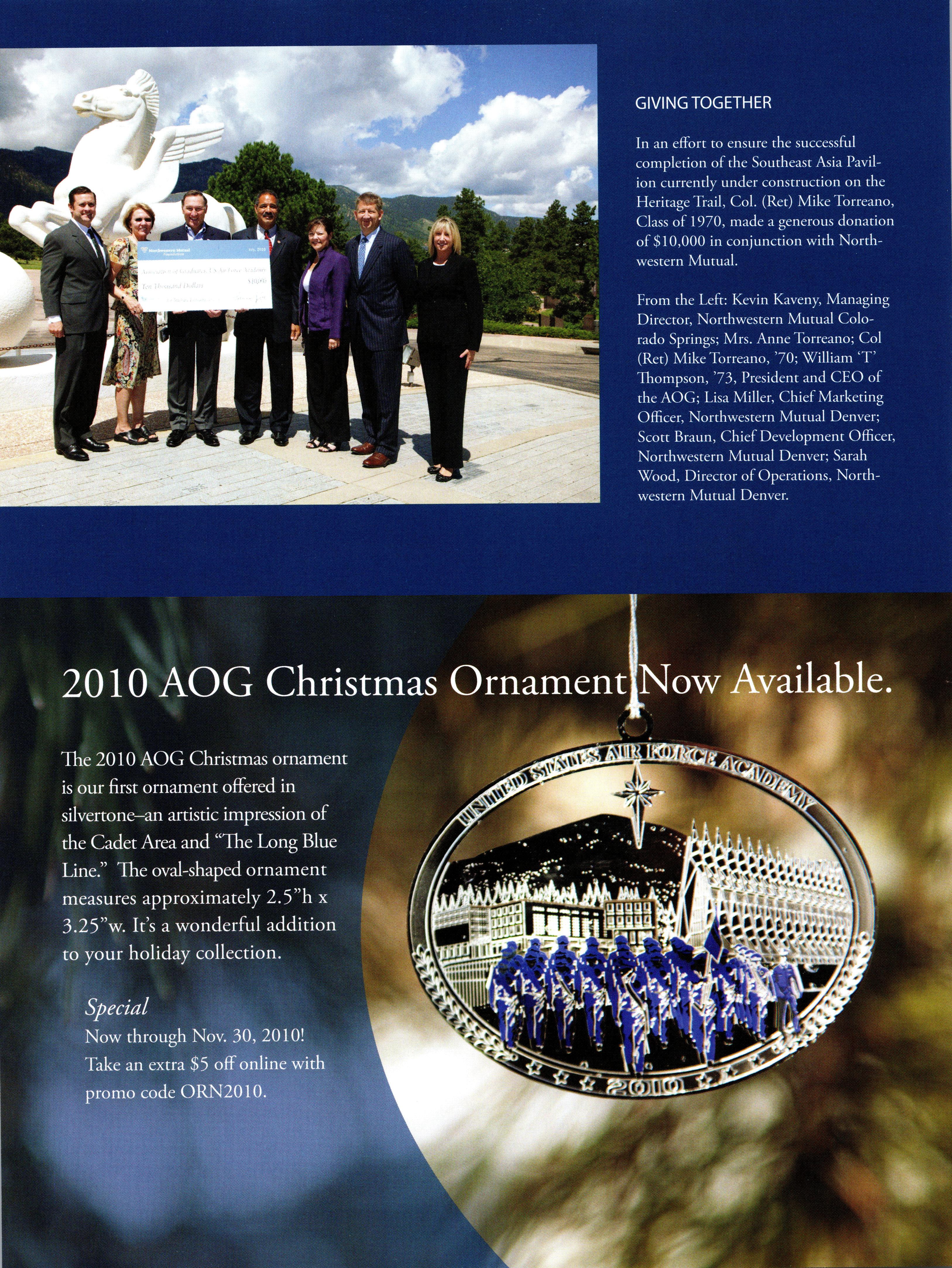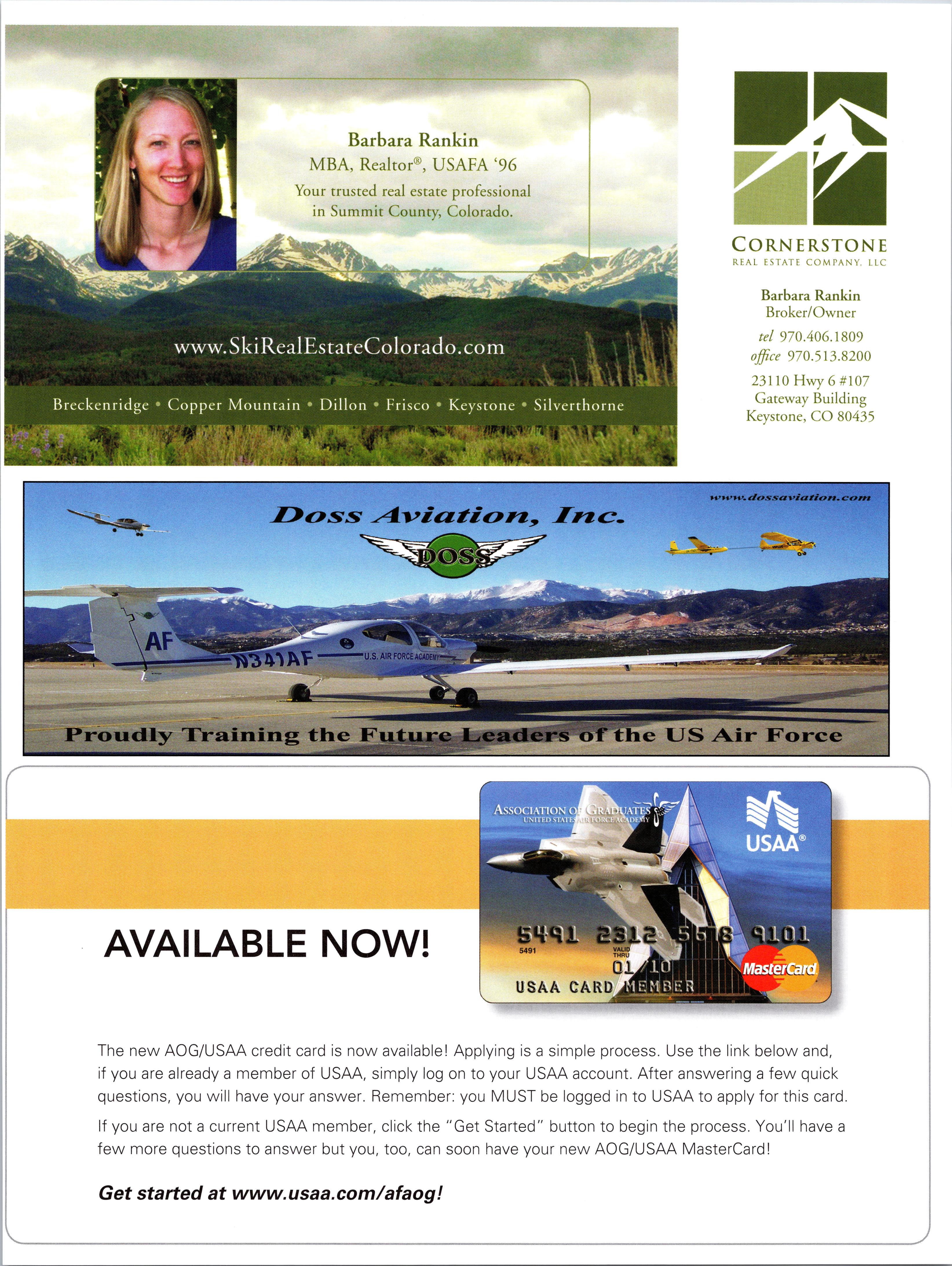 AOG r, ^jr USAA IS PROUD TO BE THE PREMIER SPONSOR USAA" OF THE ASSOCIATION OF GRADUATES OF THE AIR FORCE ACADEMY A CREDIT TO THOSE WHO SERVE: THE USAA AOG WORLD MASTERCARD®. Only the AOG World MasterCard rewards your military service with these money-saving benefits: Variable rates as low as 9.9% APR1 Pay no annual fee Earn USAA Rewards™ points on your purchases and redeem points for your choice of cash, travel and more 2 Special deployment and PCS benefits In addition, USAA Bank makes a contribution directly to the Association of Graduates of the Air Force Academy with every new account opened. No other card works harder for the AOG. USAA CARD AOG MEMBERS: GET 2,500 REWARDS POINTS after your first purchase with your AOG World MasterCard. 2 Apply today and get an instant decision. 800-531-5732 | usaa.com/aogcc INSURANCE INVESTMENTS USAA 'Offer subject to approval. As of 4/1/2010, APRs are 9.9% to 25.9%, depending on your credit history and other factors. APRs will vary with the market based on the Prime Rate. There is a transaction fee of 3% on cash advances ($75 maximum on balance transfers and convenience checks) and 1% on foreign transactions. Rewards points terminate if account is closed, delinguent or program ends. Earn 1 point for every $1 in credit card purchases. Other restrictions apply. USAA Rewards Program terms and conditions will be provided with your card. Use of the term "member" or "membership" does not convey any legal, eligibility or ownership rights. Availability restrictions apply. Purchase of a bank product does not establish eligibility for or membership in USAA property and casualty insurance companies. USAA Savings Bank, Member FDIC. AOG receives financial support for their sponsorship. © 2010 USAA. 121457-0910