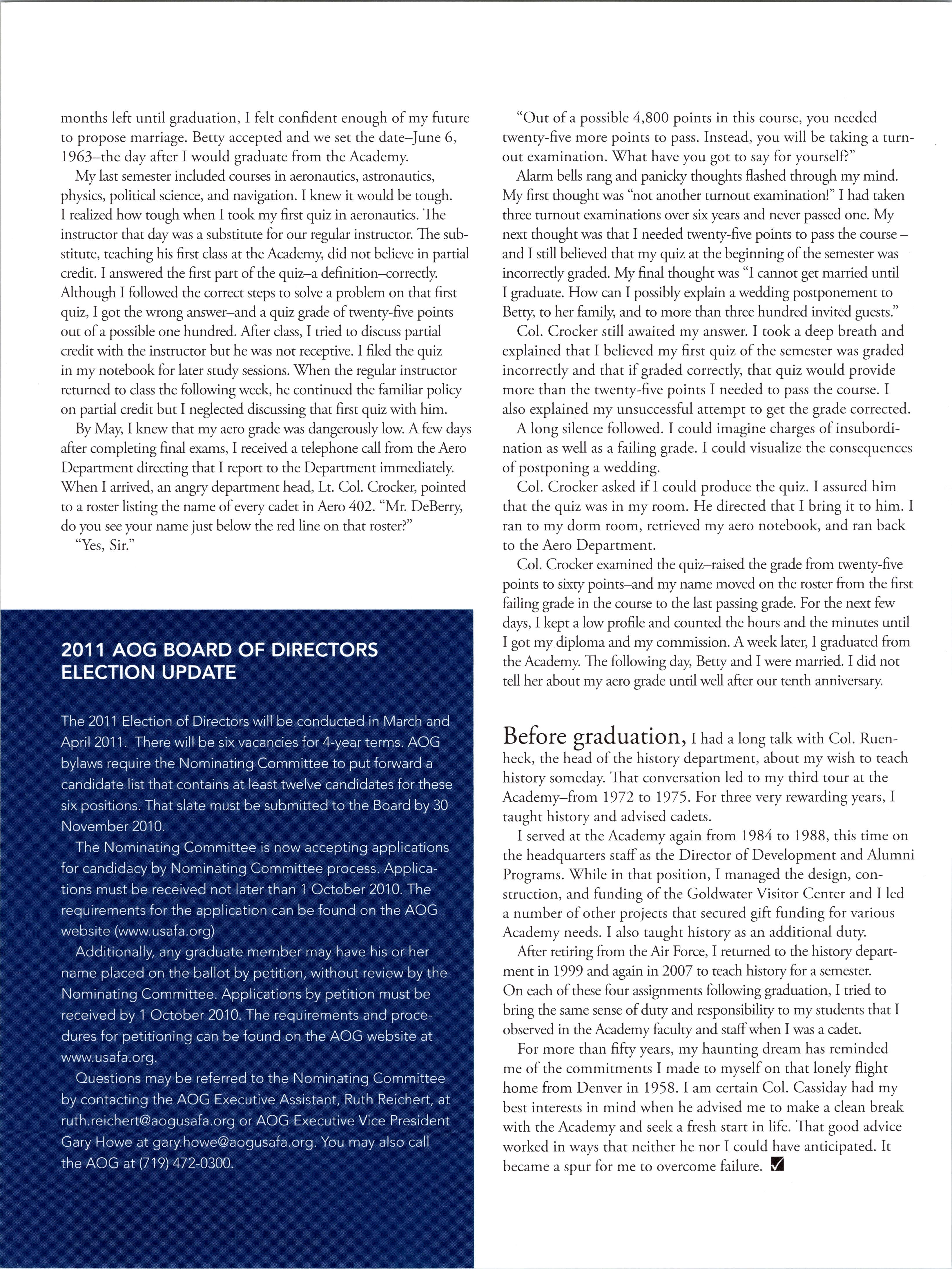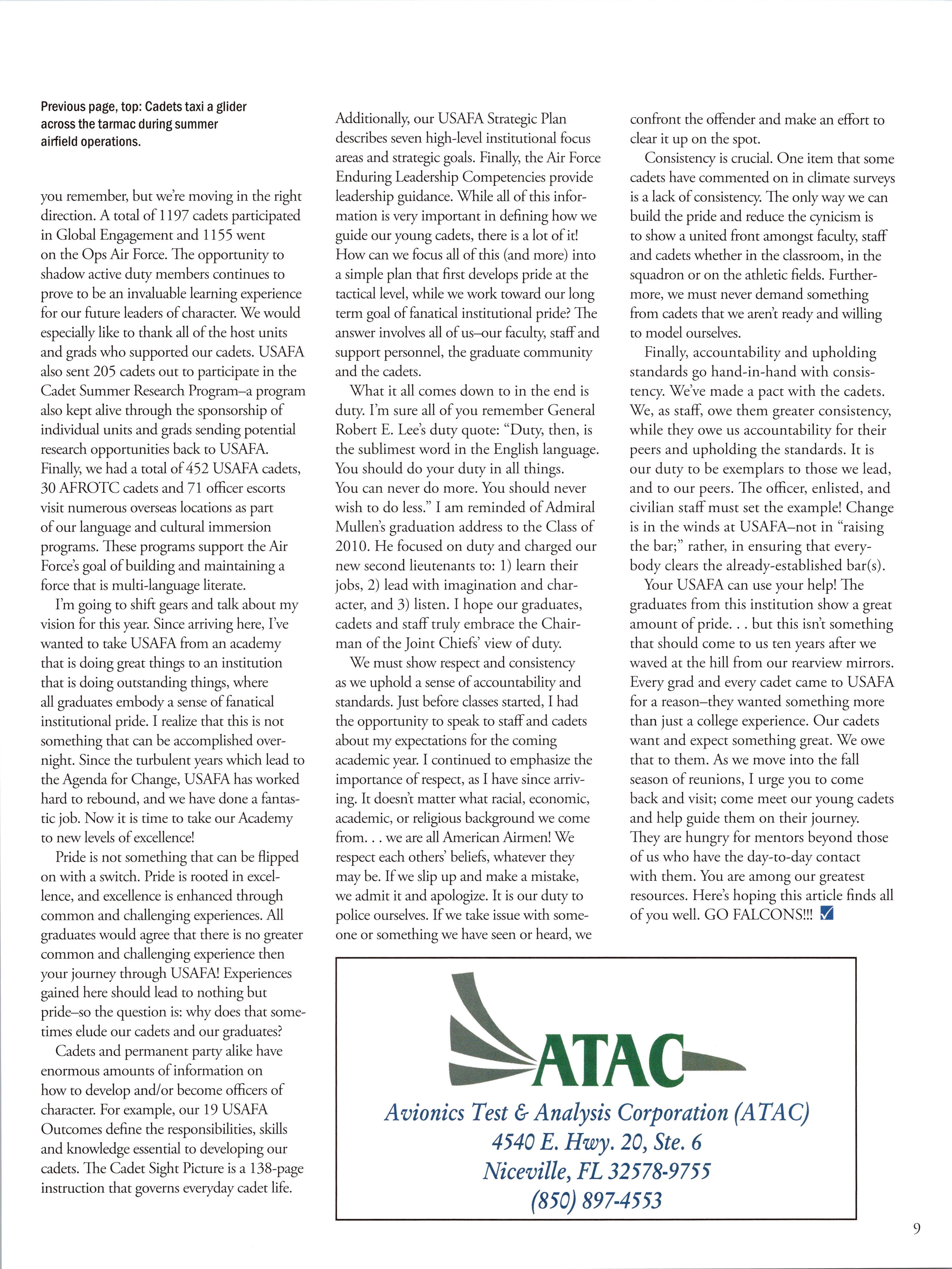 As we move forward, my goal is a simple one; to address these issues in an aggressive manner so they are finally put to bed. I wouldn’t want a future successor to read this article and have the very same issues at hand. But simple does not mean easy and I have no illusions about the challenges ahead. We’ll only be successful ifwe can continue to build a stronger, loyal and more committed graduate community and that is a long term job. Keep the faith and Go Air Force! 9