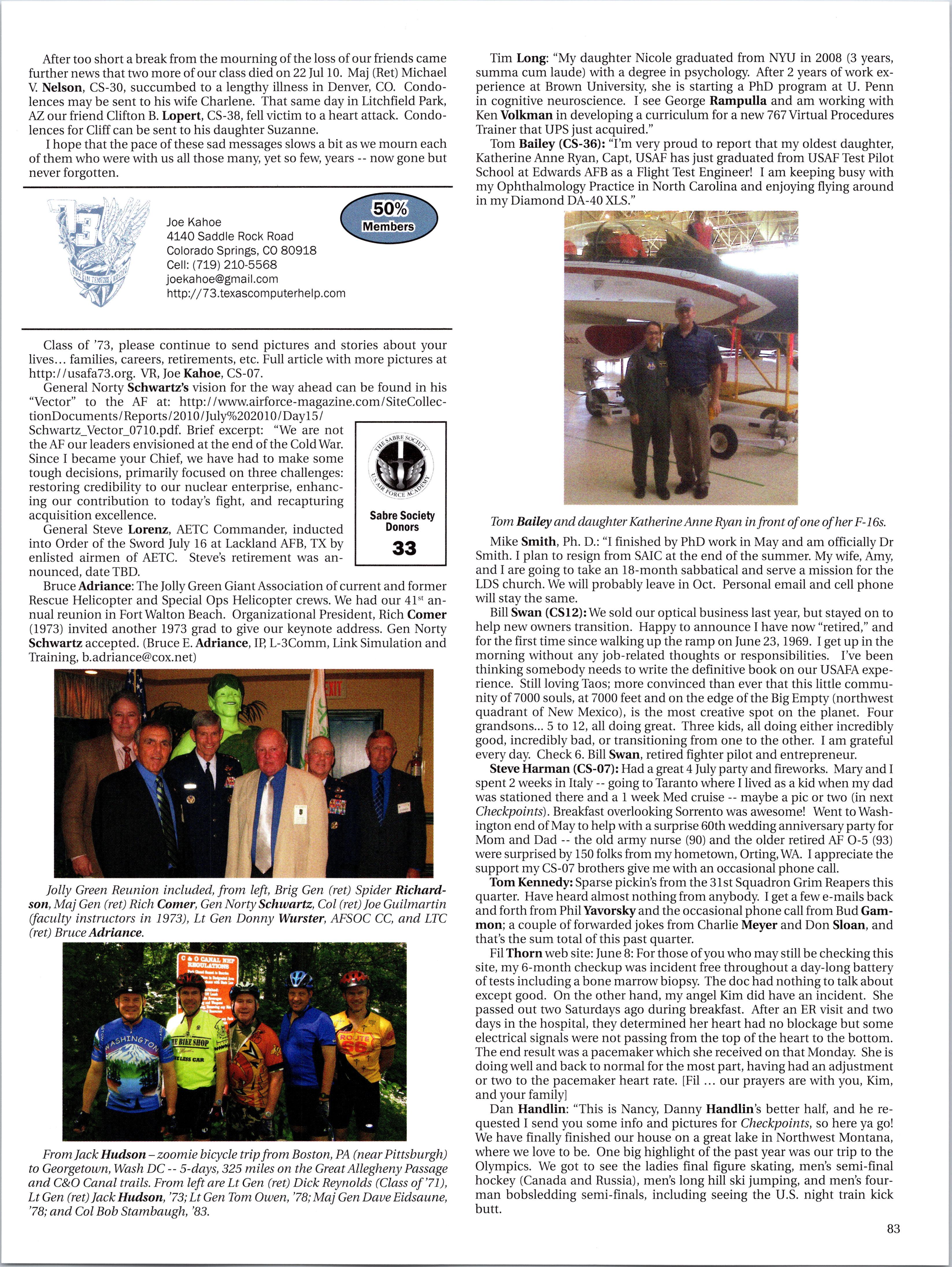 participating in the 28th Squadron’s event; to shake hands with each of those graduates was truly memorable for me. CEO “T” Thompson, ’73, and I were also honored to sit on the VIP stage for graduation. I write with first-hand experience when I inform you that our Academy is sending outstanding young men and women into today’s Air Force.