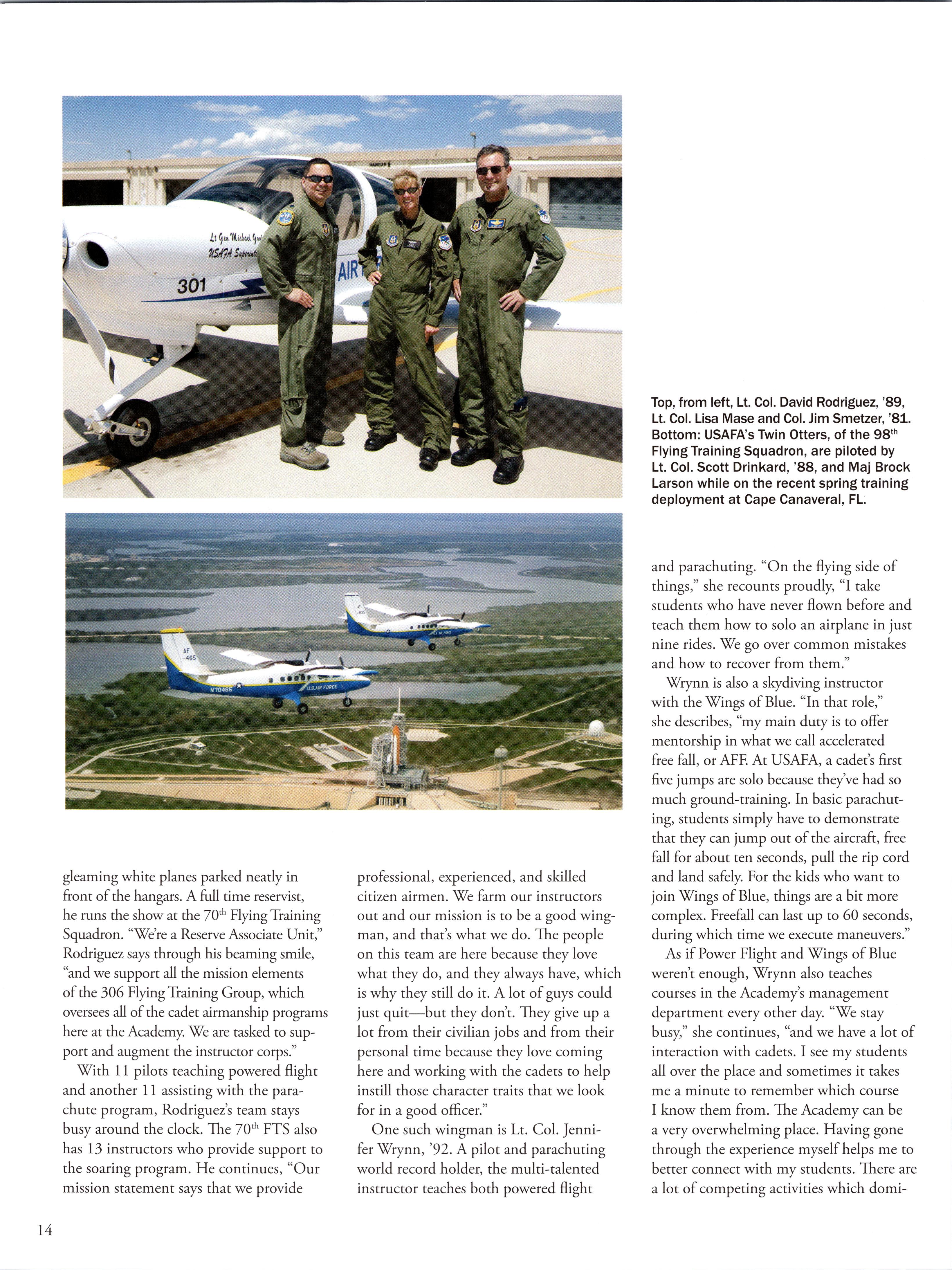 you remember, but were moving in the right direction. A total of 1197 cadets participated in Global Engagement and 1155 went on the Ops Air Force. The opportunity to shadow active duty members continues to prove to be an invaluable learning experience for our future leaders ofcharacter. We would especially like to thank all ofthe host units and grads who supported our cadets. USAFA also sent 205 cadets out to participate in the Cadet Summer Research Program—a program also kept alive through the sponsorship of individual units and grads sending potential research opportunities back to USAFA. Finally, we had a total of452 USAFA cadets, 30 AFROTC cadets and 71 officer escorts visit numerous overseas locations as part of our language and cultural immersion programs. These programs support the Air Forces goal ofbuilding and maintaining a force that is multi-language literate.