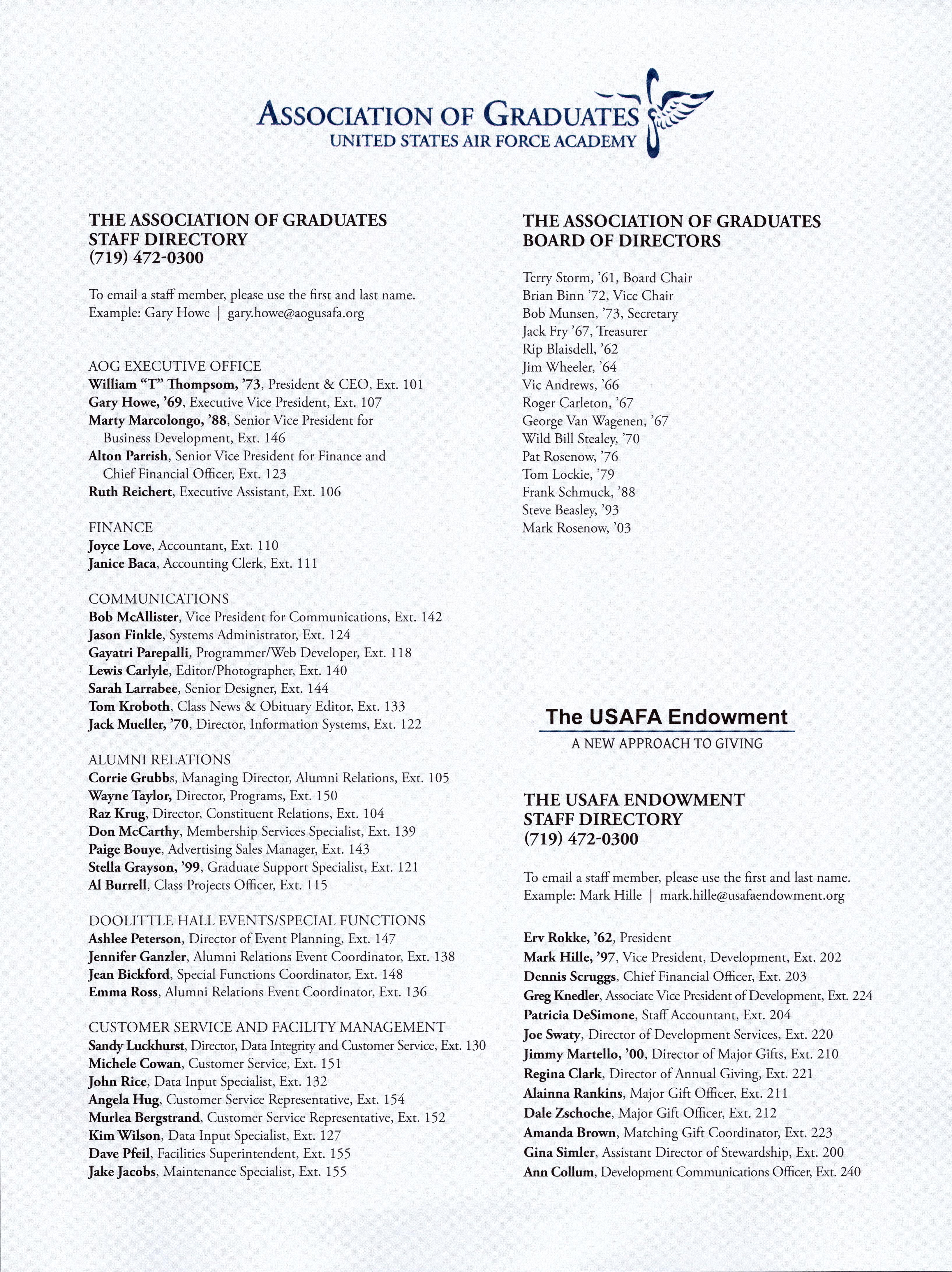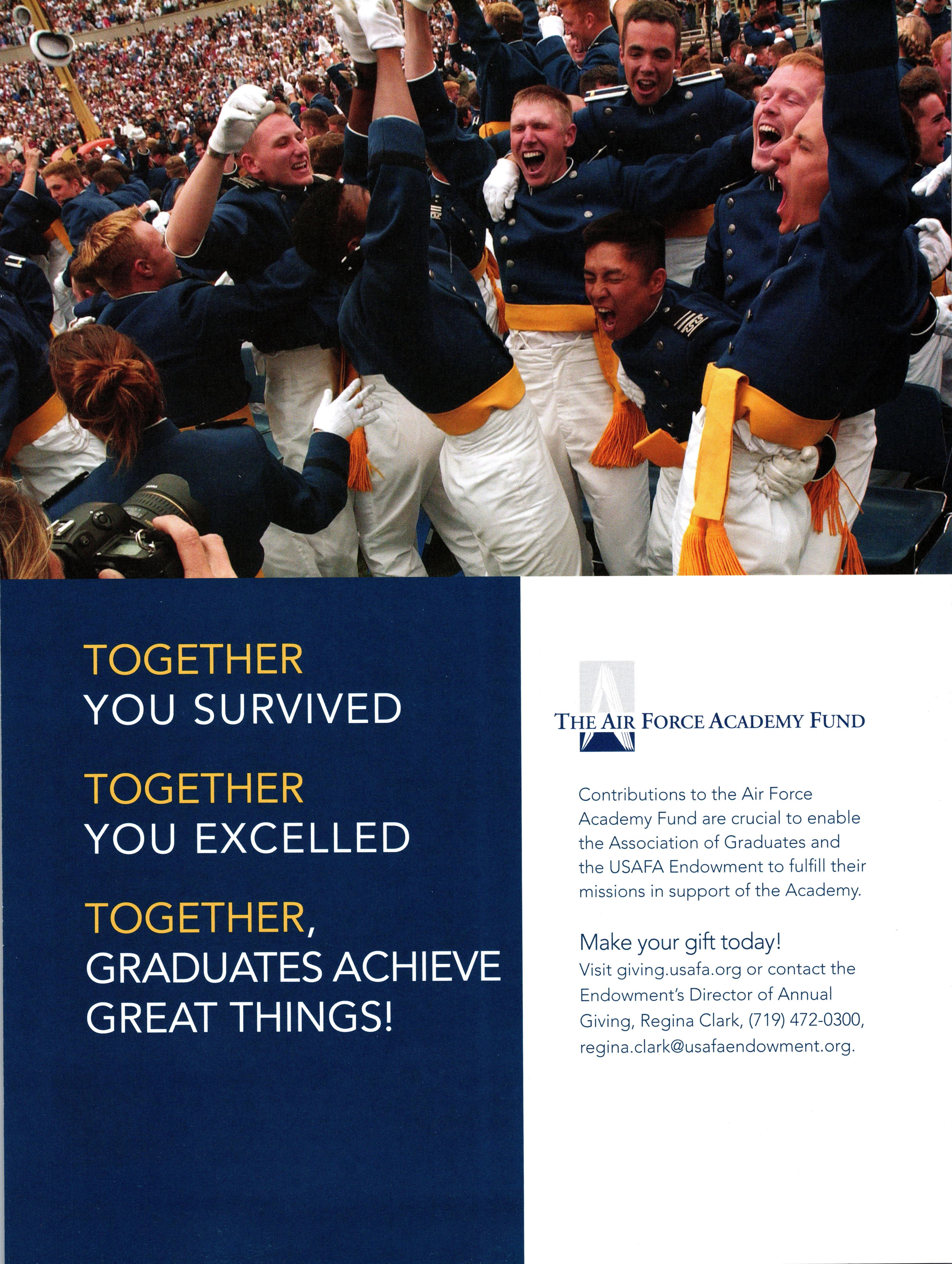TOGETHER YOU SURVIVED TOGETHER, GRADUATES ACHIEVE GREAT THINGS! The Air Force Academy Fund W Contributions to the Air Force Academy Fund are crucial to enable the Association of Graduates and the USAFA Endowment to fulfill their missions in support of the Academy. Make your gift today! Visit giving.usafa.org or contact the Endowment's Director of Annual Giving, Regina Clark, (719) 472-0300, regina.clark@usafaendowment.org. m TOGETHER EXCELLED