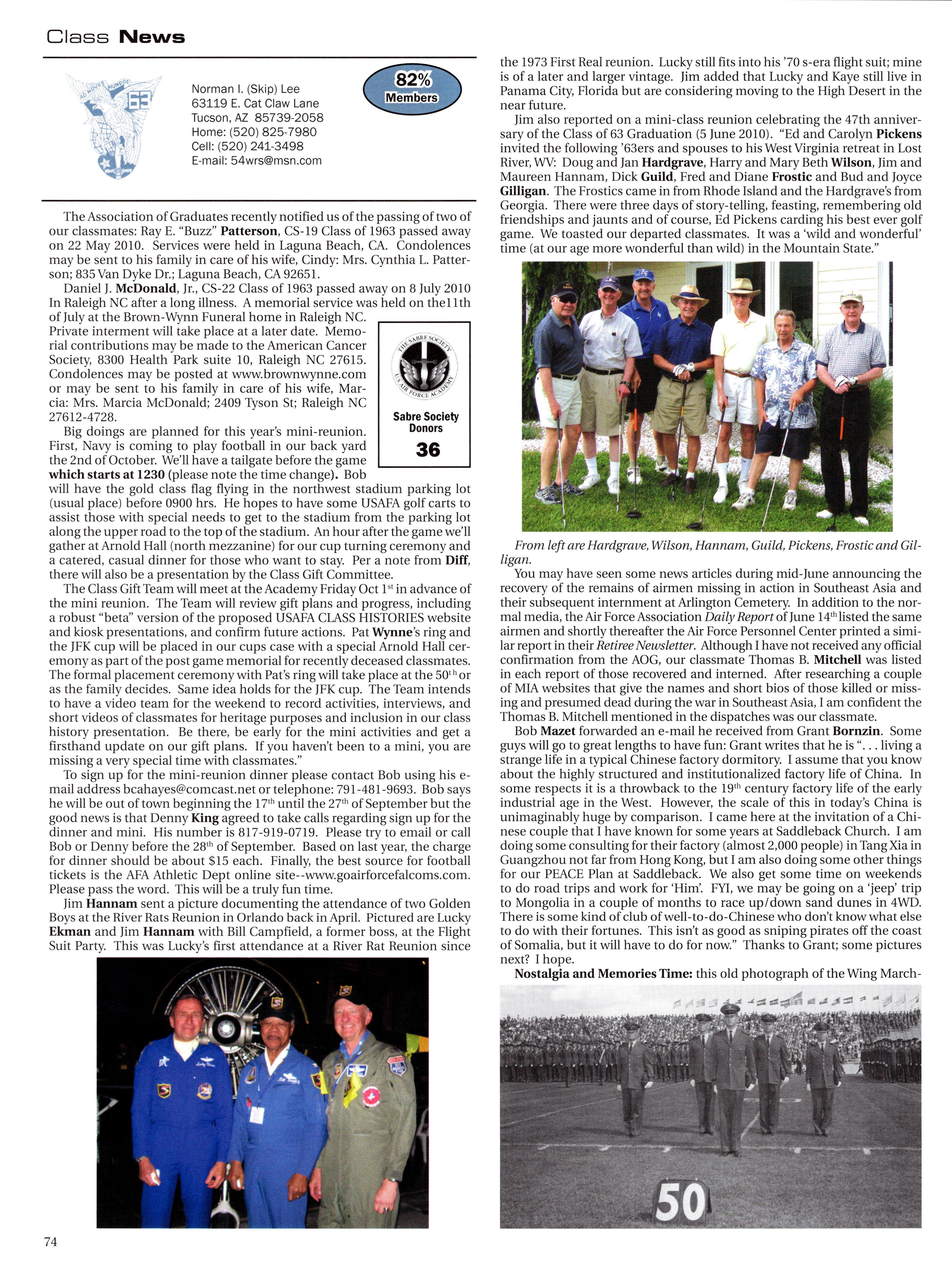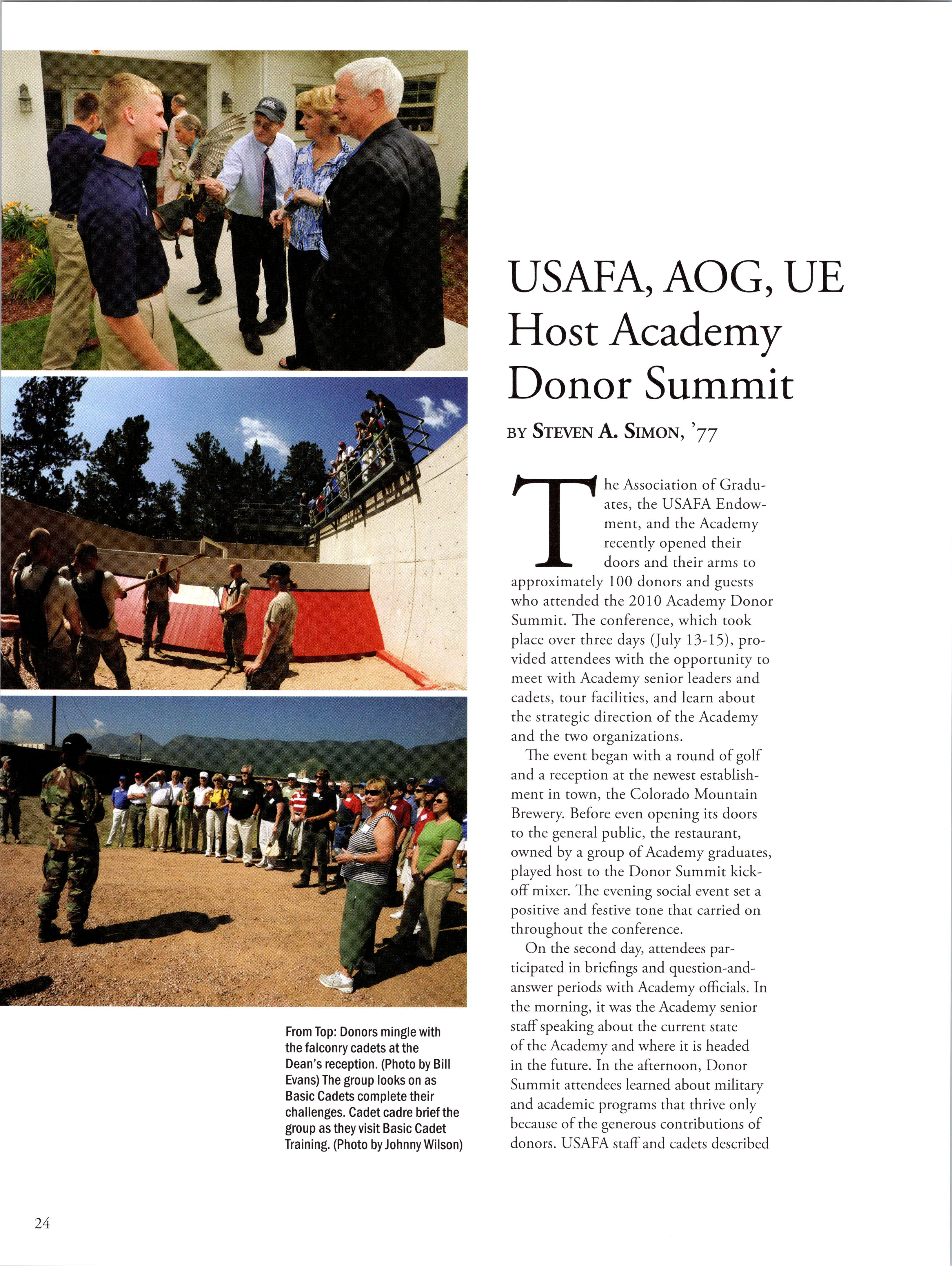 I was pleased to attend, along with AOG Board Director Vic Andrews, ’66, the USAFA Donor Summit in July. USAFA Dean, Brigadier General Dana Born, ’83, hosted the event for our Superintendent Lieutenant General Mike Gould, ’76. Some 50 graduate donors and their guests attended a full two-day schedule, which included briefings on everything from the leadership cadre and cadet clubs, to Jacks Valley operations, showcasing outstanding cadets. Everyone participated in two evening functions, including the one at the Dean’s beautiful on-base residence. As our donor numbers continue to grow, so too will future donor summits.