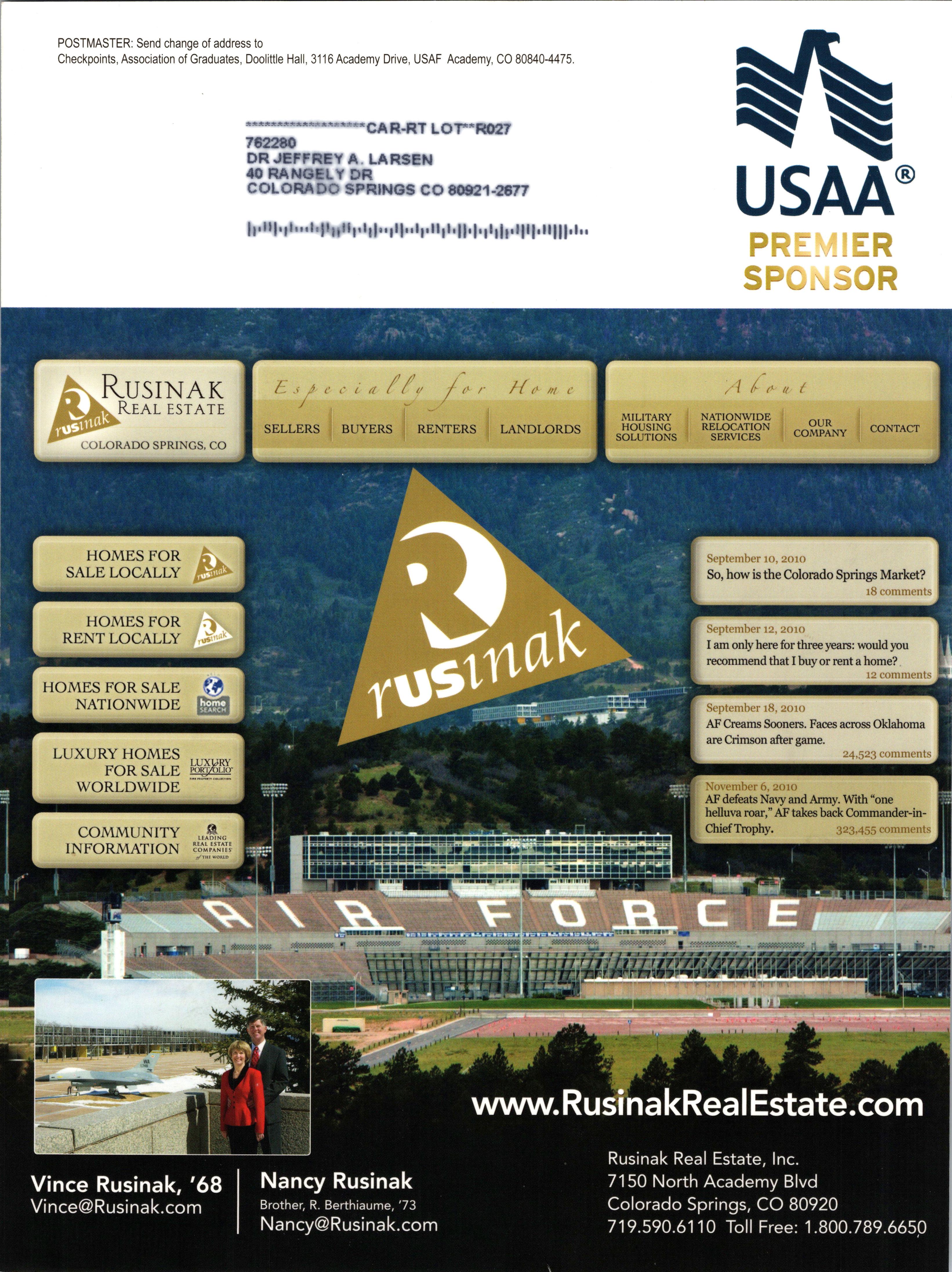 POSTMASTER: Send change of address to Checkpoints, Association of Graduates, Doolittle Hall, 3116 Academy Drive, USAF Academy, CO 80840-4475. R RT LOT-pjojy 762280 DR JEFFREY A LARSEN 40 RANGELY DR COLORADO SPRINGS CO 80921-2877 | l .ll| M i...l.|i )| ll | il | |..,|| ll | |l || | | l || l | l| | | | | ,||l| l |||||.| ll USAA® PREMIER ■ Ml Rusinak k Real estate NATIONWIDE RELOCATION SERVICES MILITARY HOUSING SOLUTIONS OUR COMPANY BUYERS RENTERS LANDLORDS CONTACT COLORADO SPRINGS, CO HOMES FOR SALE LOCALLY September to, 2010 So, how is the Colorado Springs Market? 18 comments HOMES FOR RENT LOCALLY September 12, 20x0 I am only here for three years: would you recommend that I buy or rent a home? 12 comments HOMES FOR SALE NATIONWIDE September 18, 2010 AF Creams Sooners. Faces across Oklahoma are Crimson after game. 24,523 comments LUXURY HOMES FOR SALE WORLDWIDE LUXURY PORT/OLIO November 6 2010 AF defeats Navy and Army. With “one helluva roar,” AF takes back Commander-inChiefTrophy. 323,455 comments COMMUNITY INFORMATION LEADING REAL ESTATE COMPANIES' y-THf WORM m HRHR www.RusinakRealEstate.com Rusinak Real Estate, Inc, Vince Rusinak, '68 Nancy Rusinak 7150 North Academy Blvd Vince@Rusinak.com Brother, r. Berthiaume, 73 Colorado Springs, CO 80920 Nancy@Rusinak.com 719.590.6110 Toll Free: 1.800.789.6650