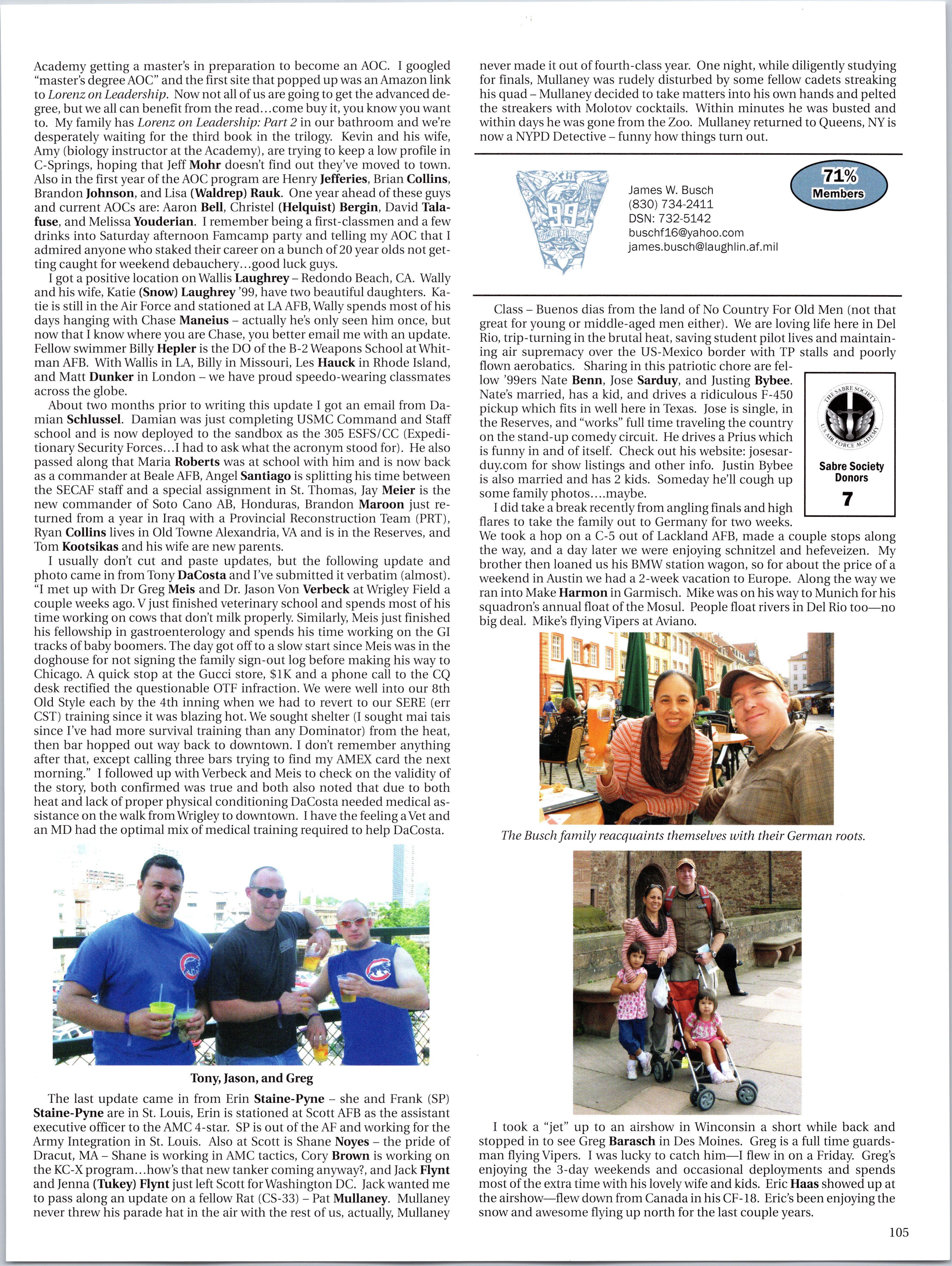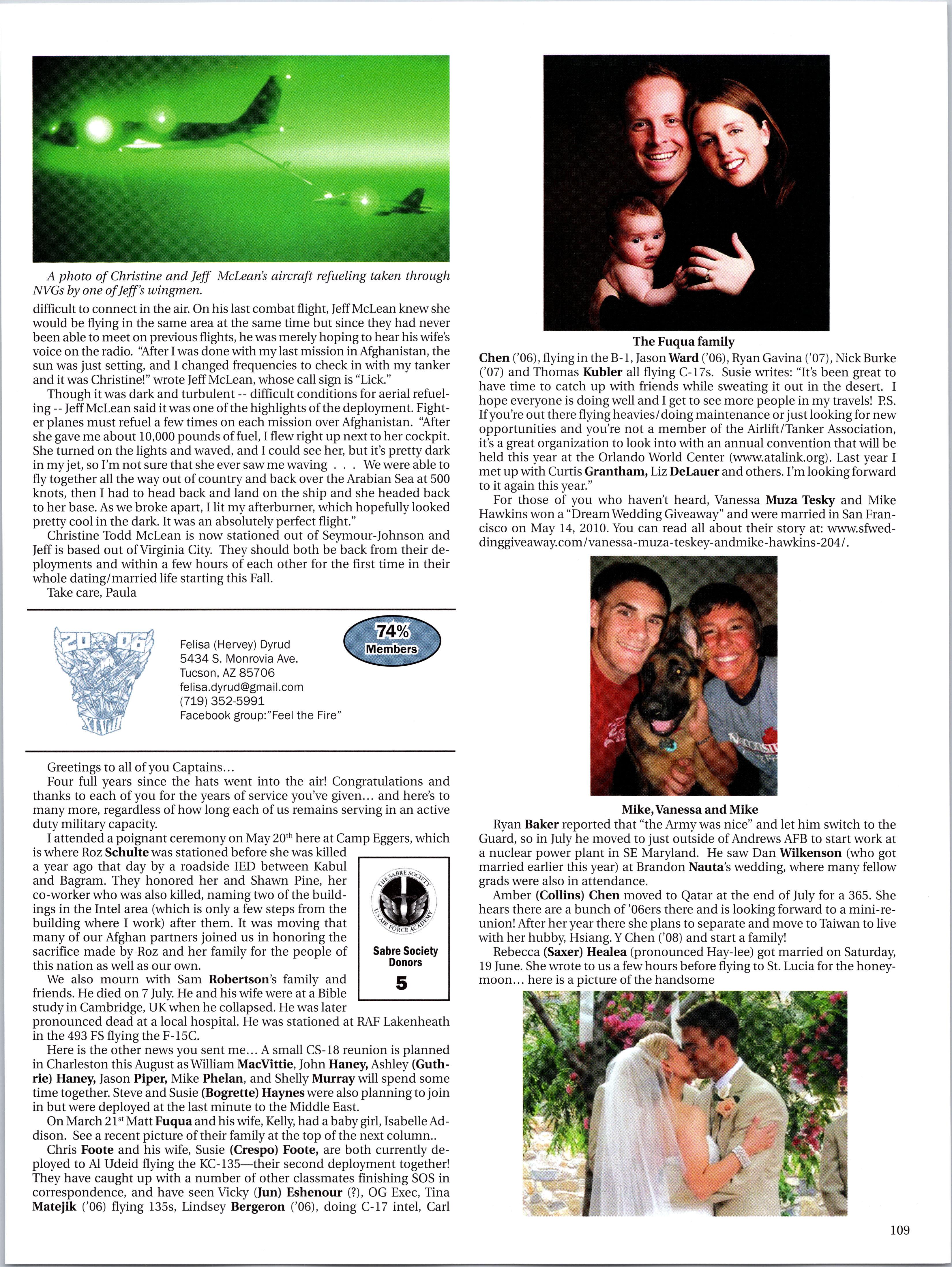 VanBaren: F-16, Will Parrish: F-15E, Alex Prevendar: T-38 (FAIP) to Vance, Travis Cope: C-17 to Charleston, John Skypeck: KC-135 to Fairchild, Aaron Shanor: E-3 to Tinker, Nathanael Walker: C-130J to Dyess, Cole Callahan: NSAto Cannon, Kyle Carnahan: AC-130H to Cannon, Grant Lewis: C-130H to Cheyenne, Heather Pinsky: MC-130W to Cannon, Jon Rember: C-130H to Dyess, Daniel Samson: C-130H to Little Rock, Clay Ten Eyck: AC-130H to Cannon, Chris Miller: RPA to Cannon, Nicole Graziano: KC-10 to McGuire, Lane Garman: T-l (FAIP) to Vance, Natasha Sergi: C-17 to Charleston, Patrick Hardy: C-130 to Yokota, Jon Butcher: KC-10 to McGuire, Ryan King: RPA to Creech, Daniel Feldman: RPA to Creech, Tyler Lawhorn: T-l (FAIP) to Columbus, Mario (Barron) Peloquin: KC-135 to MacDill, ChayDerbigny: C-130J to Little Rock, Jeff Weger: C-130 to Little Rock, Matthew Burnham: C-5 to Travis, Roger Knobeloch: C- 130J to Little Rock, Bryce Johnson: MQ-1 to Creech, Matt Buchholtz: C-130 to Little Rock, Chris Schumacher: C-130 to Dyess, Tom Bender: T-l (FAIP) to Vance, Andrew Cipolla: C-21 to Scott, Adam Ferek: C-17 to Charleston, Marc Goodman: RPA to Creech, John Hatfield: C-5 to Dover, Ben Hedges: KC-135 to MacDill, DJ Hidalgo: T-6 (FAIP) to Vance, Eryn Johnston: C-17 to McGuire, Spencer Liedl: KC-135 to Scott, Jon Luhrmann: MC-130 to Cannon, Nikita Martin: KC-135 to Hickam. That’s it for this issue. Send me good news!!