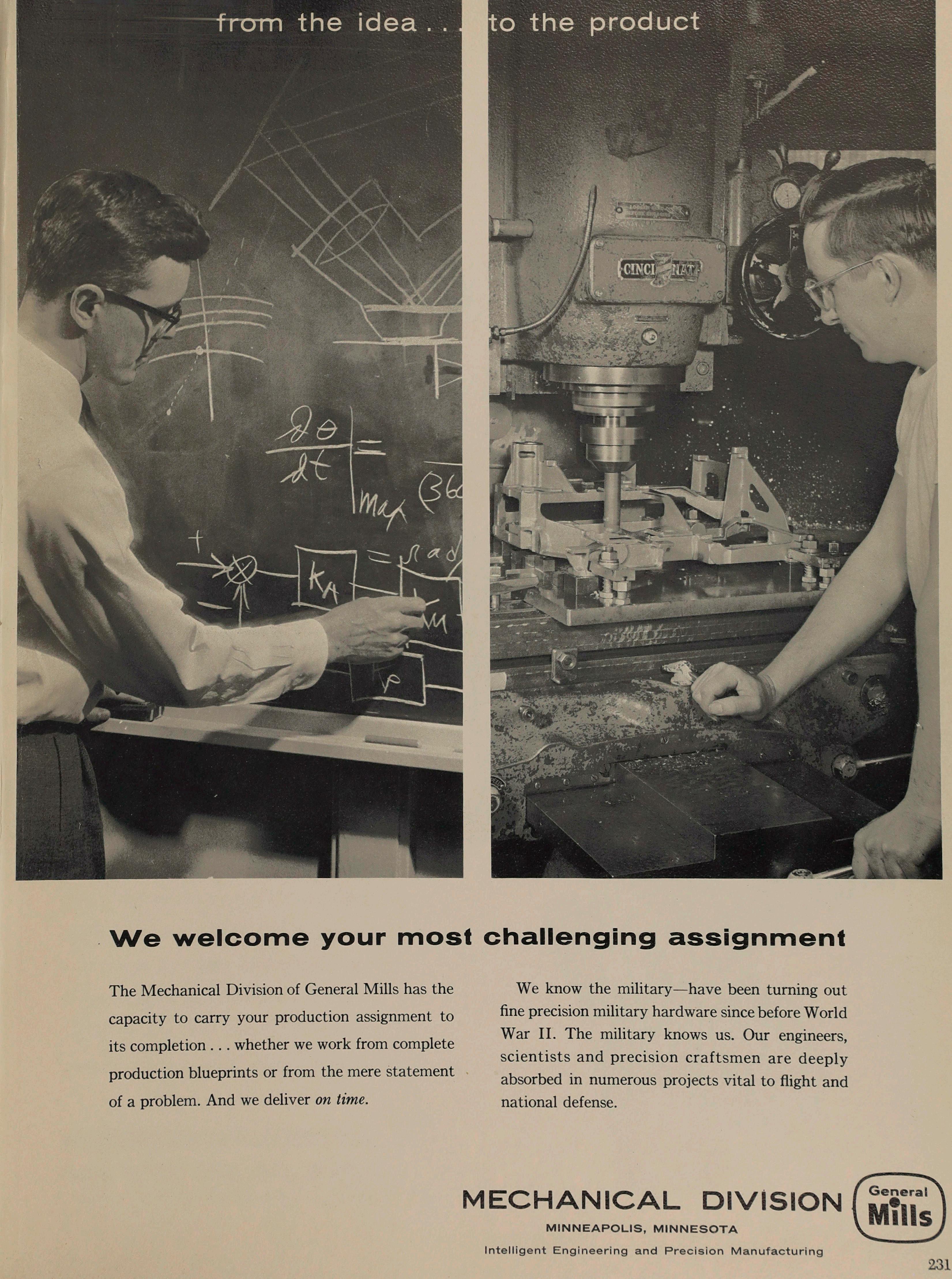 The Mechanical Division of General Mills has the capacity to carry your production assignment to its completion whether we work from complete production blueprints or from the mere statement of a problem. And we deliver on time.