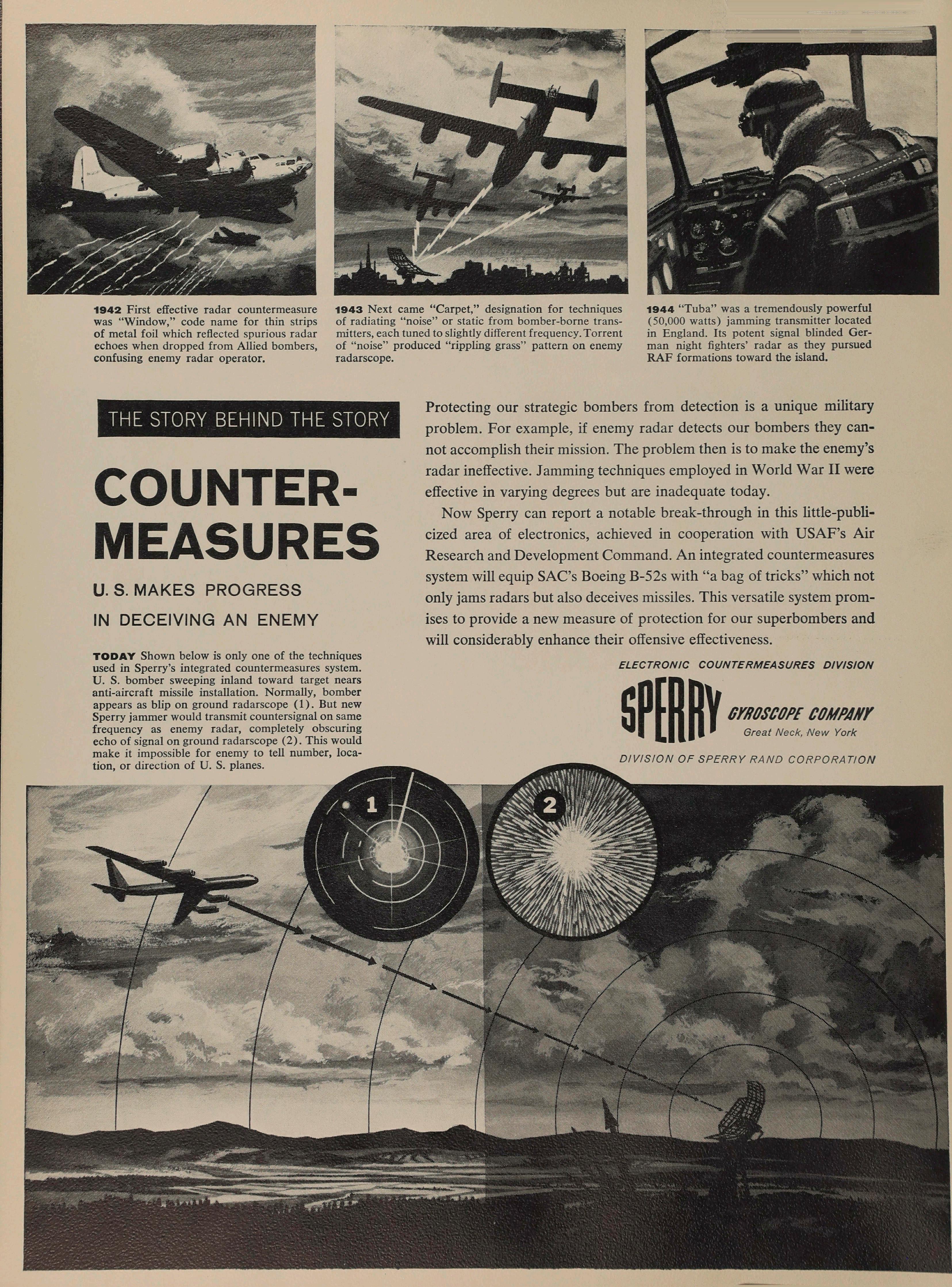 Now Sperry can report a notable break-through in this little-publicized area of electronics, achieved in cooperation with USAF’s Air Research and Development Command. An integrated countermeasures system will equip SAC’s Boeing B-52s with “a bag of tricks” which not only jams radars but also deceives missiles. This versatile system promises to provide a new measure of protection for our superbombers and will considerably enhance their offensive effectiveness.