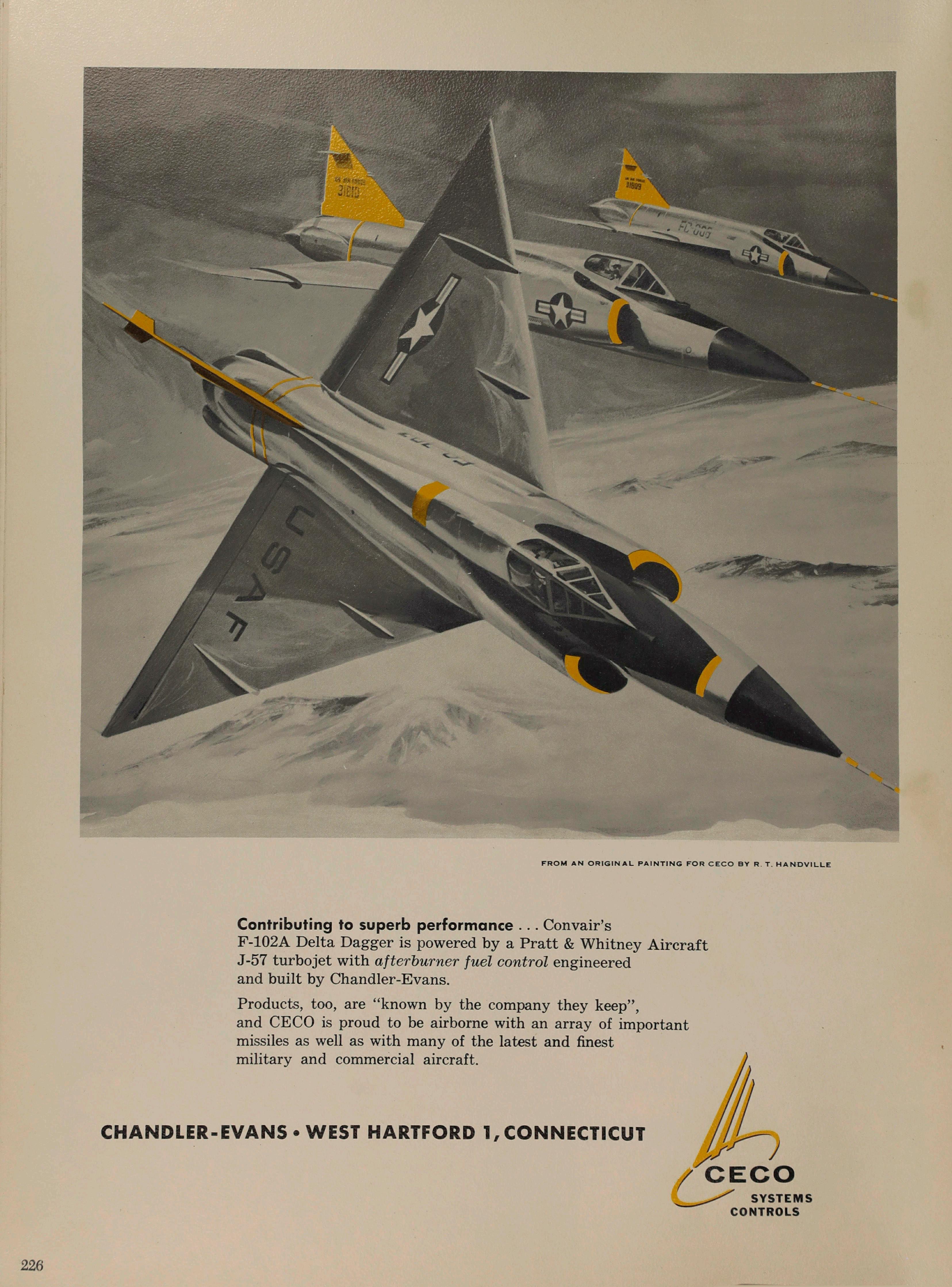 F-102A Delta Dagger is powered by a Pratt & Whitney Aircraft J-57 turbojet with afterburner fuel control engineered and built by Chandler-Evans.