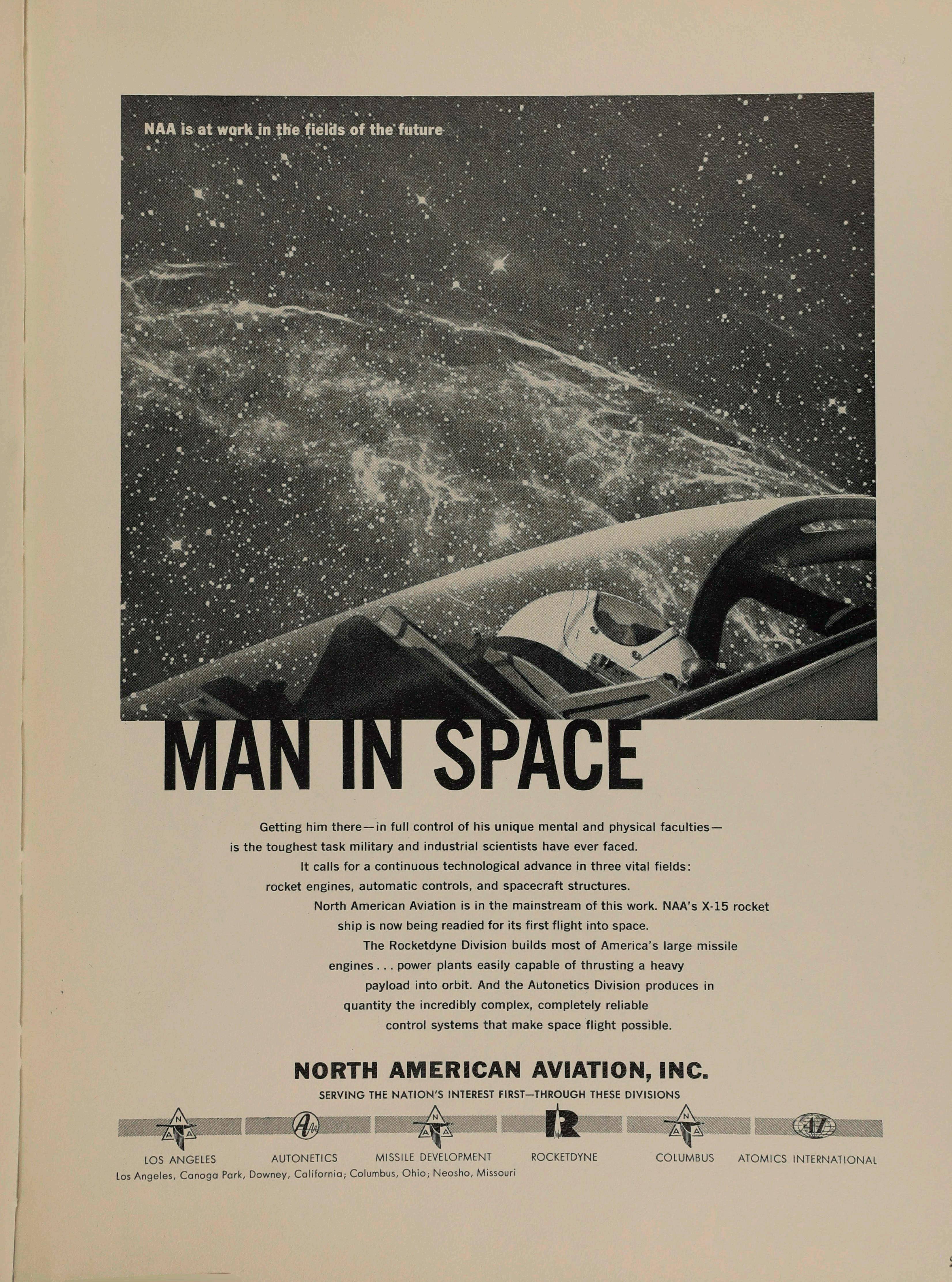 The Rocketdyne Division builds most of America’s large missile engines... power plants easily capable of thrusting a heavy payload into orbit. And the Autonetics Division produces in quantity the incredibly complex, completely reliable control systems that make space flight possible.