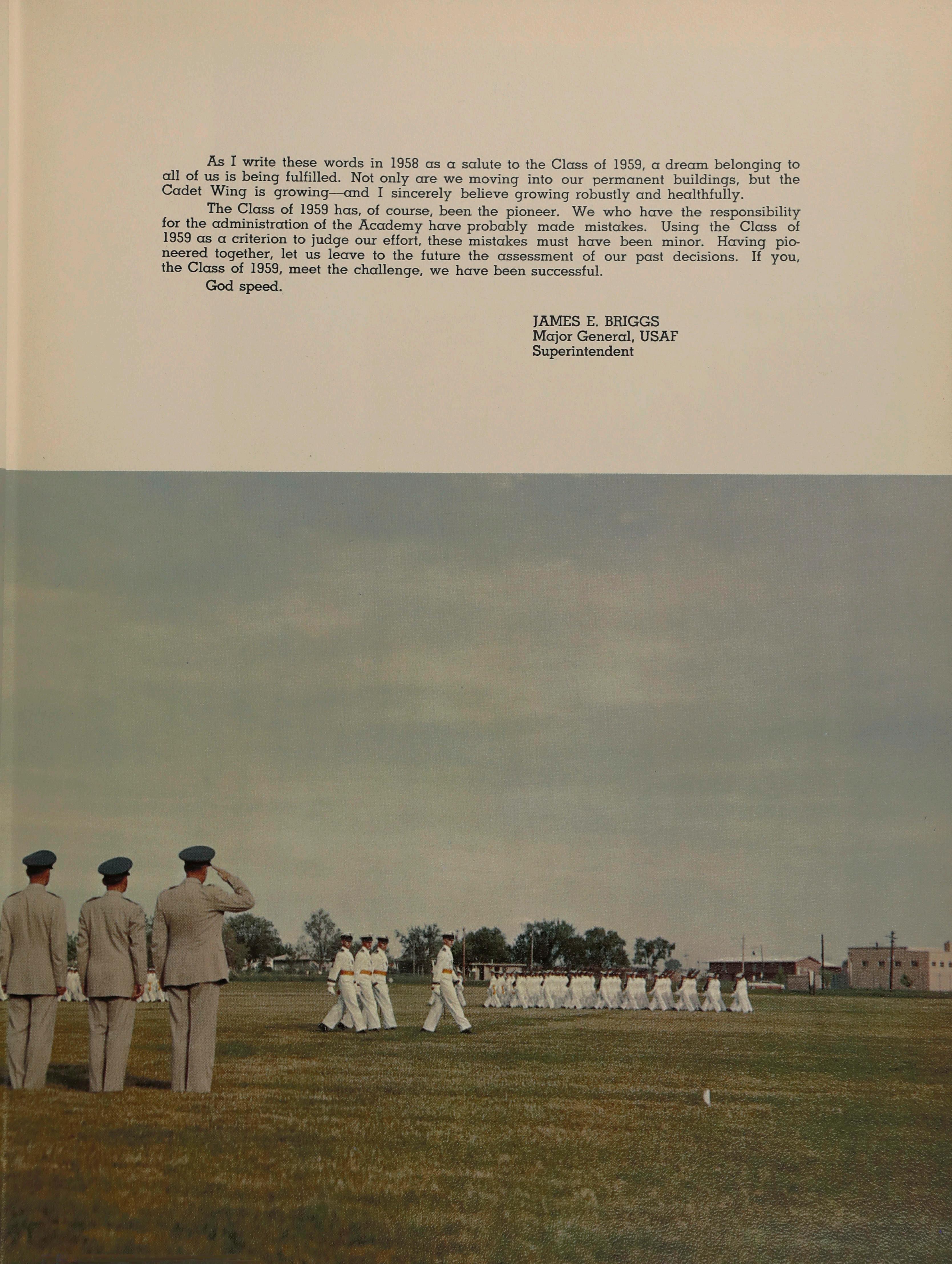 As I write these words in 1958 as a salute to the Class of 1959, a dream belonging to all of us is being fulfilled. Not only are we moving into our permanent buildings, but the Cadet Wing is growing—and I sincerely believe growing robustly and healthfully.