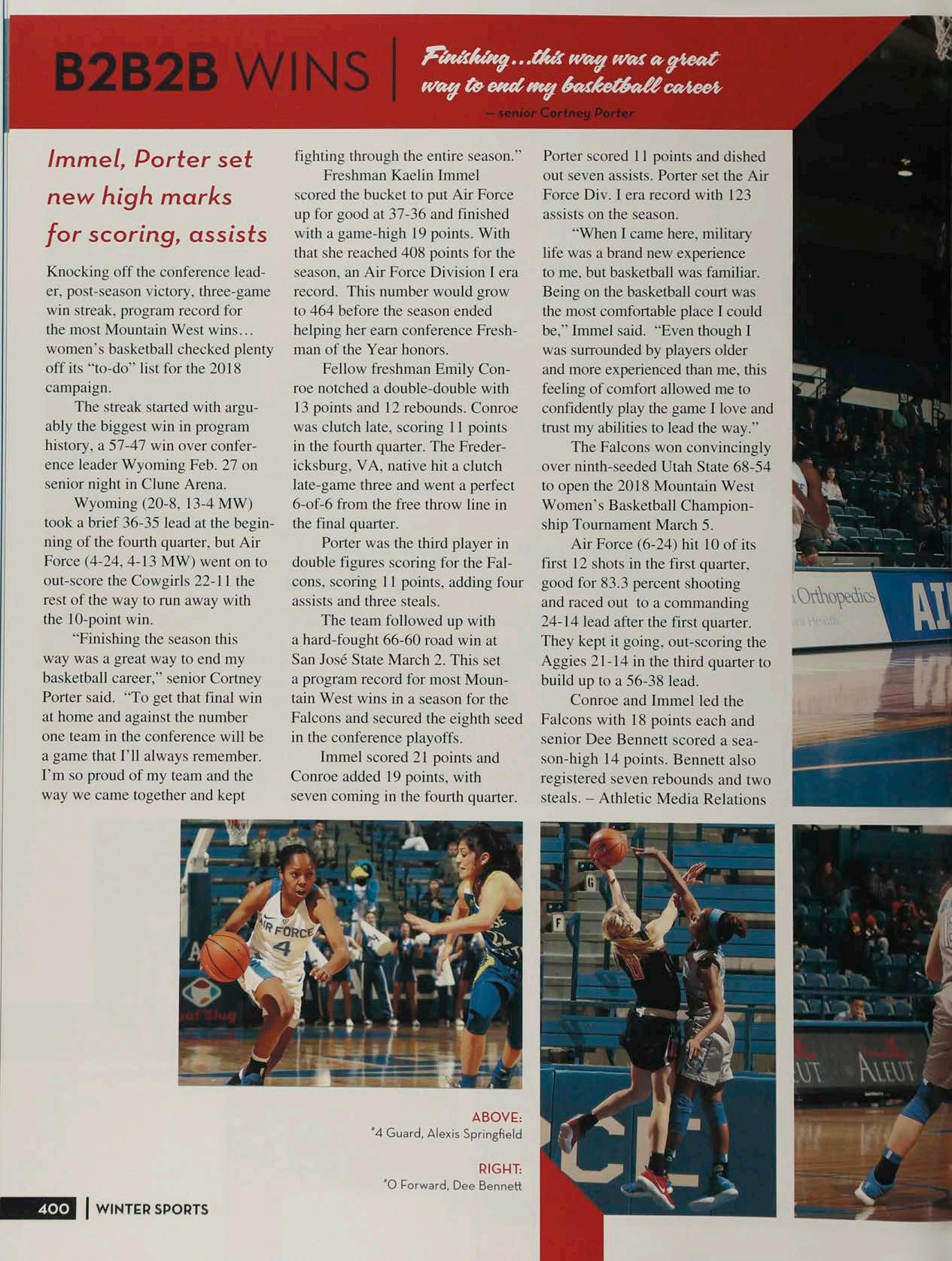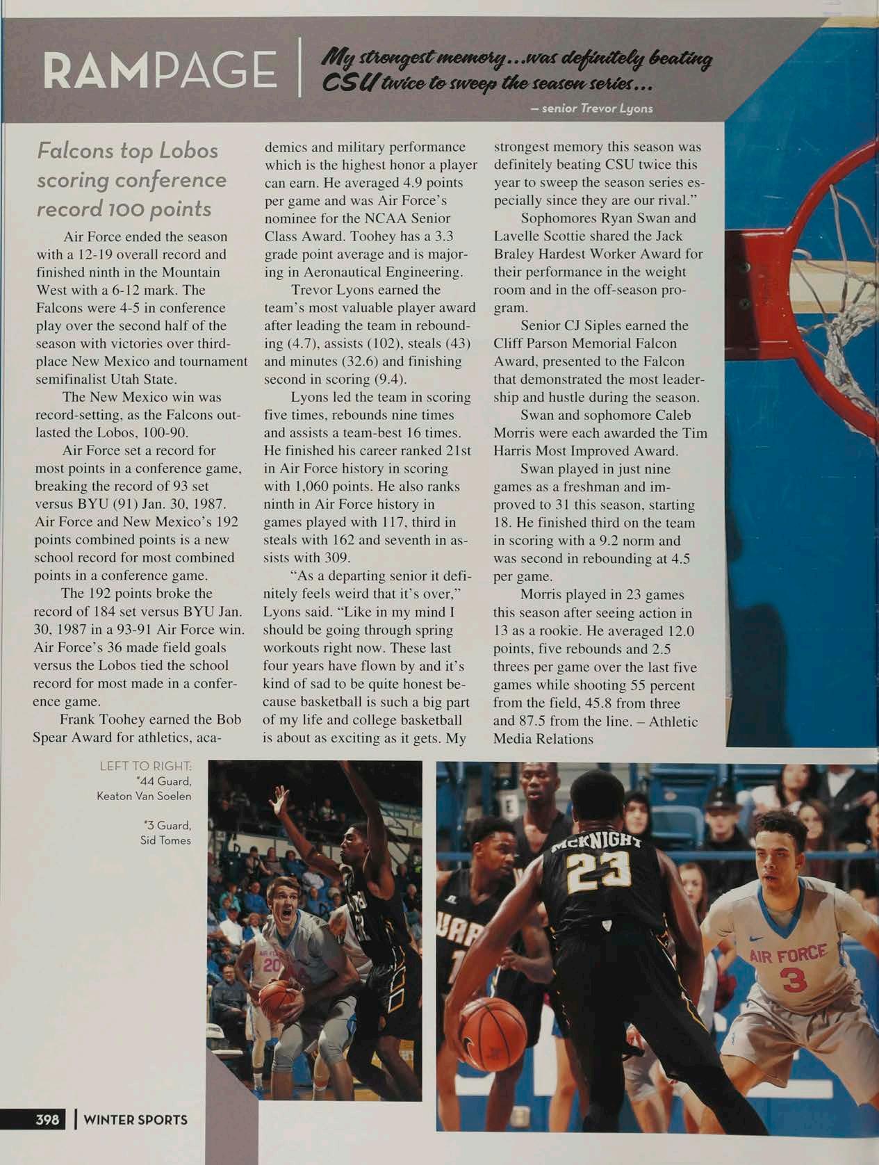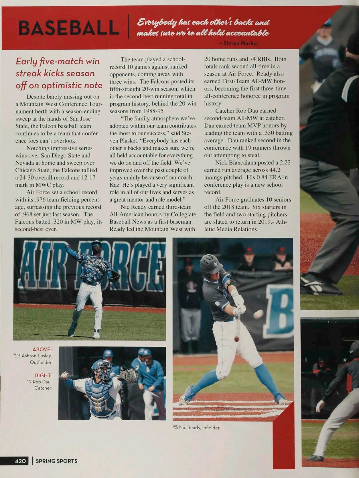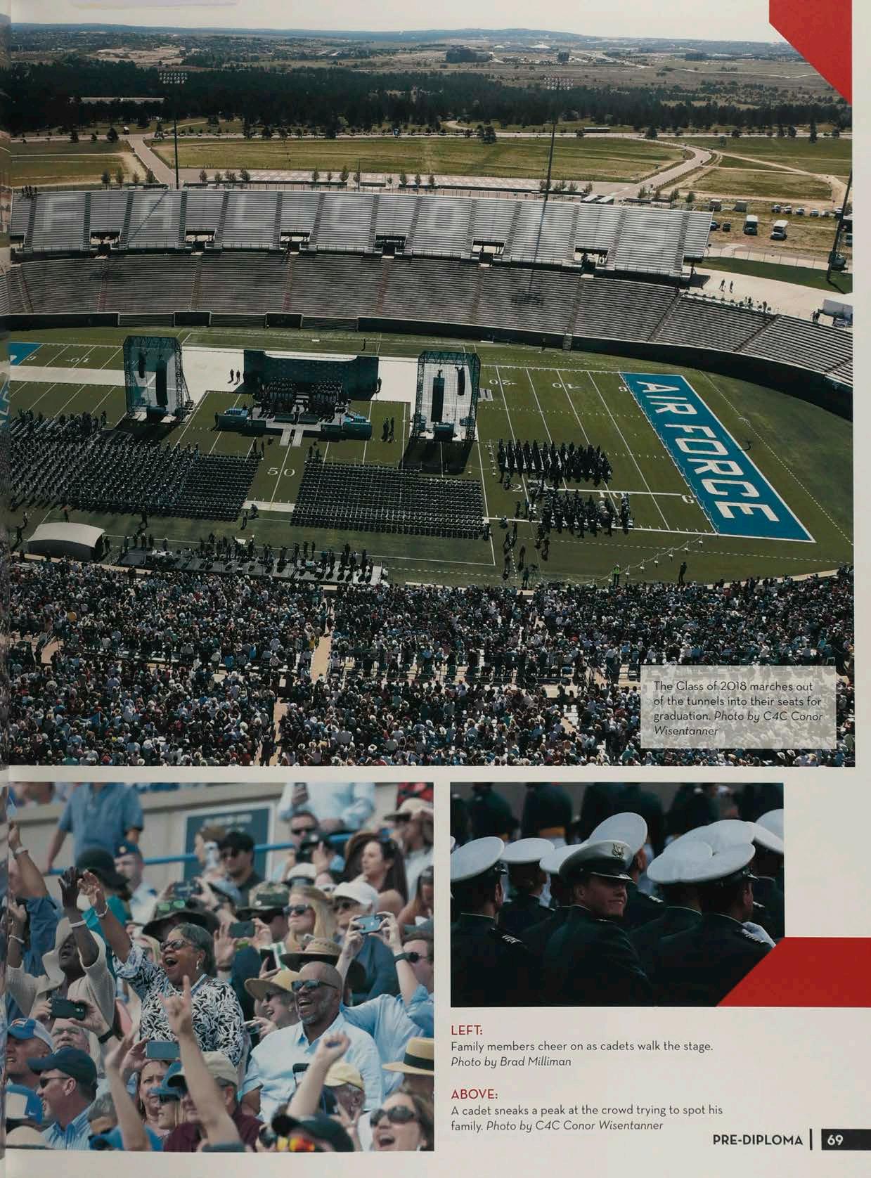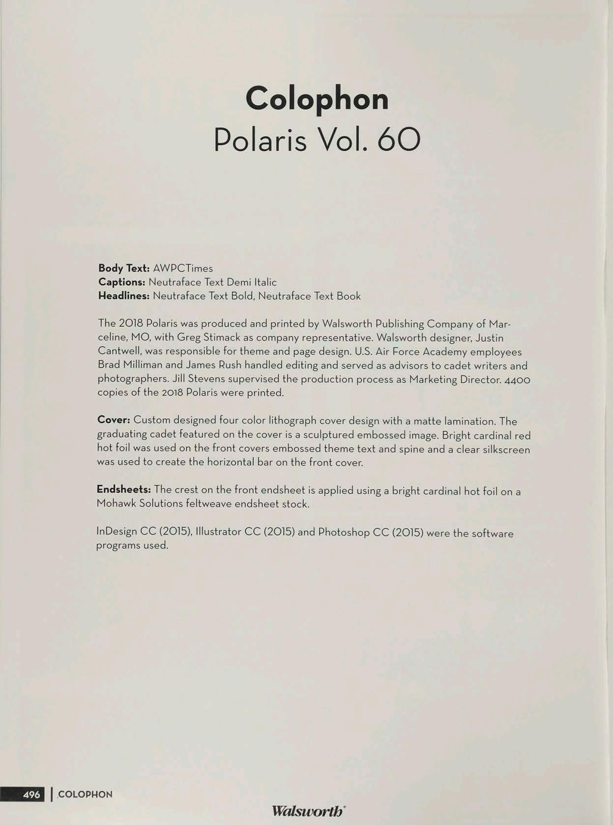 The 2018 Polaris was produced and printed by Walsworth Publishing Company of Marceline, MO, with Greg Stimack as company representative. Walsworth designer, Justin Cantwell, was responsible for theme and page design. U.S. Air Force Academy employees Brad Milliman and James Rush handled editing and served as advisors to cadet writers and photographers. Jill Stevens supervised the production process as Marketing Director. 4400 copies of the 2018 Polaris were printed.