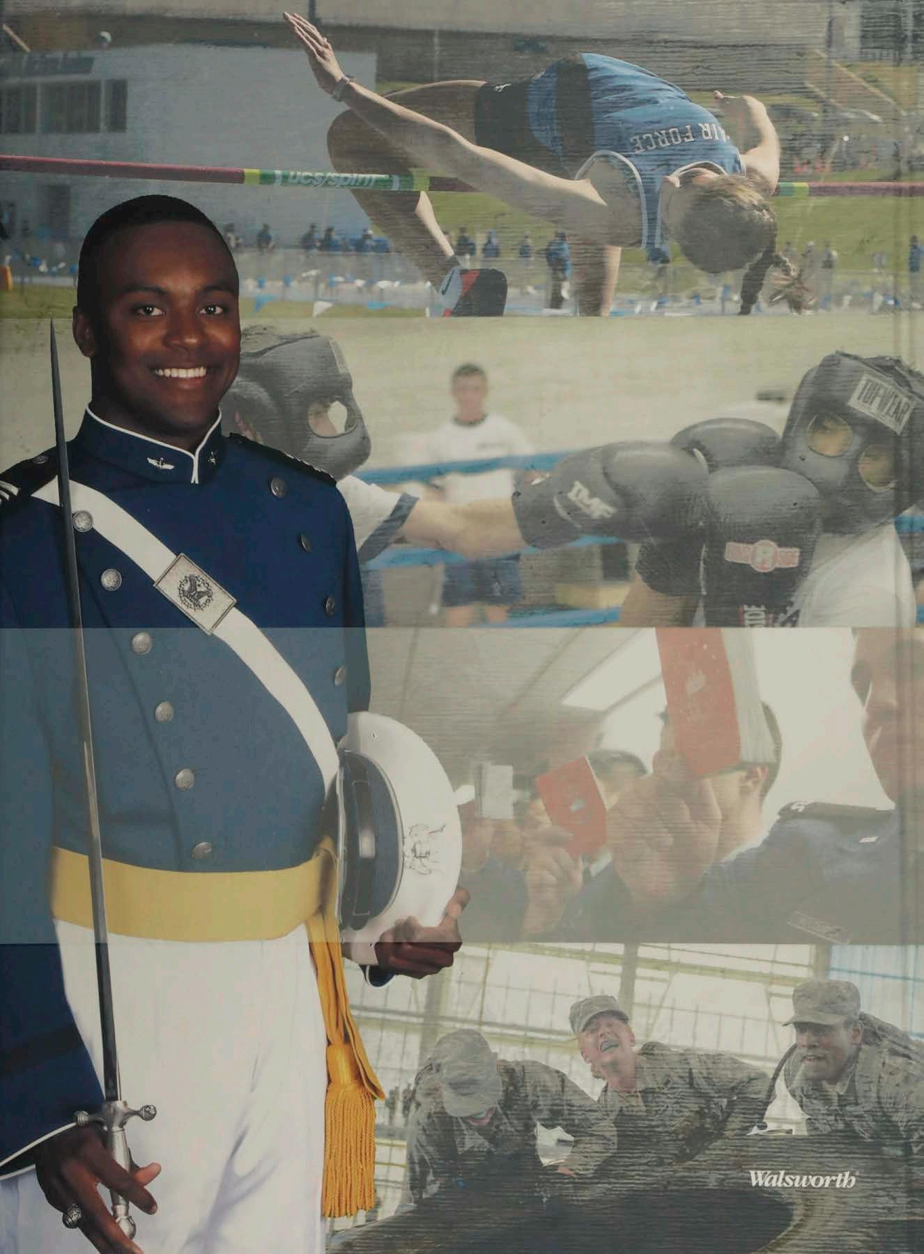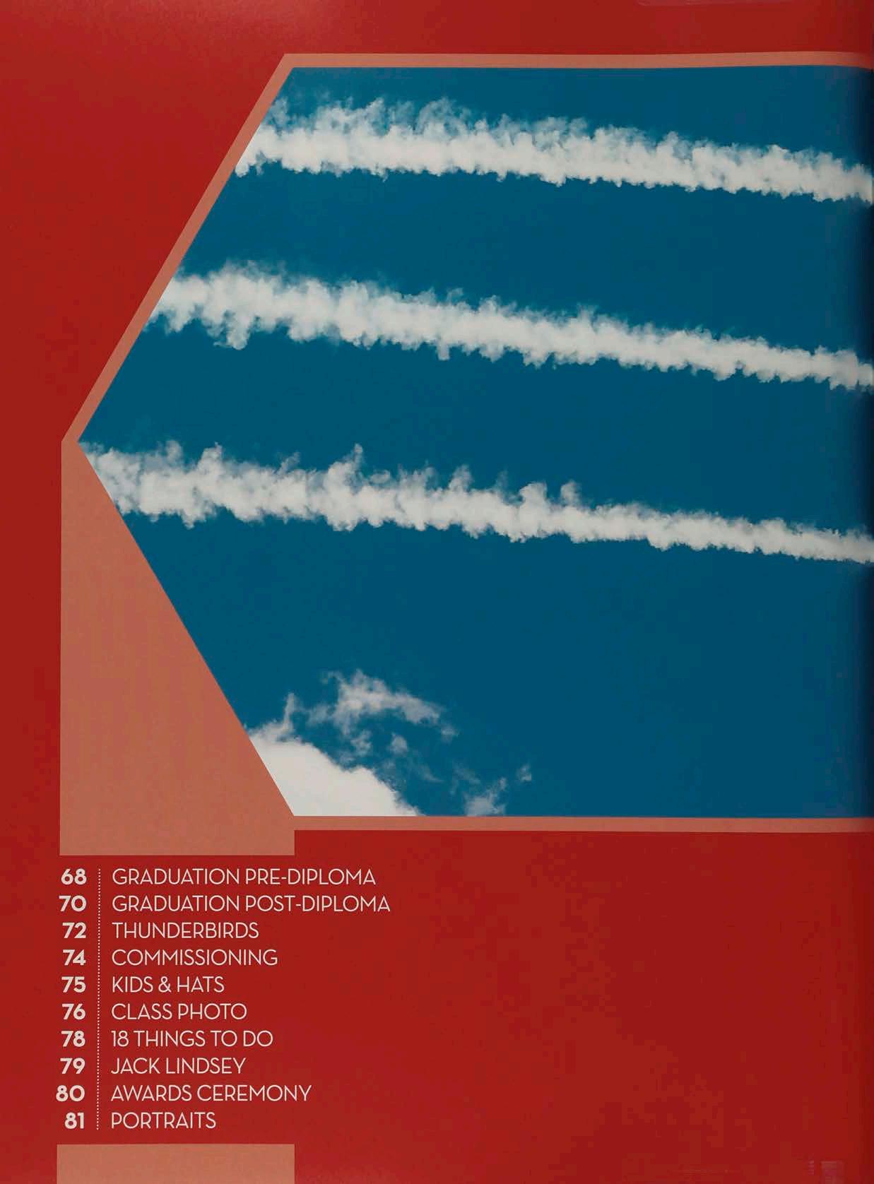 Cover: Custom designed four color lithograph cover design with a matte lamination. The graduating cadet featured on the cover is a sculptured embossed image. Bright cardinal red hot foil was used on the front covers embossed theme text and spine and a clear silkscreen was used to create the horizontal bar on the front cover.