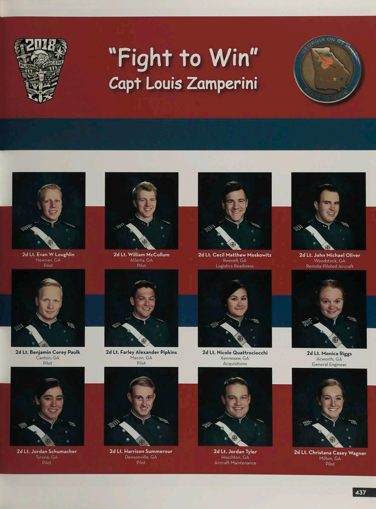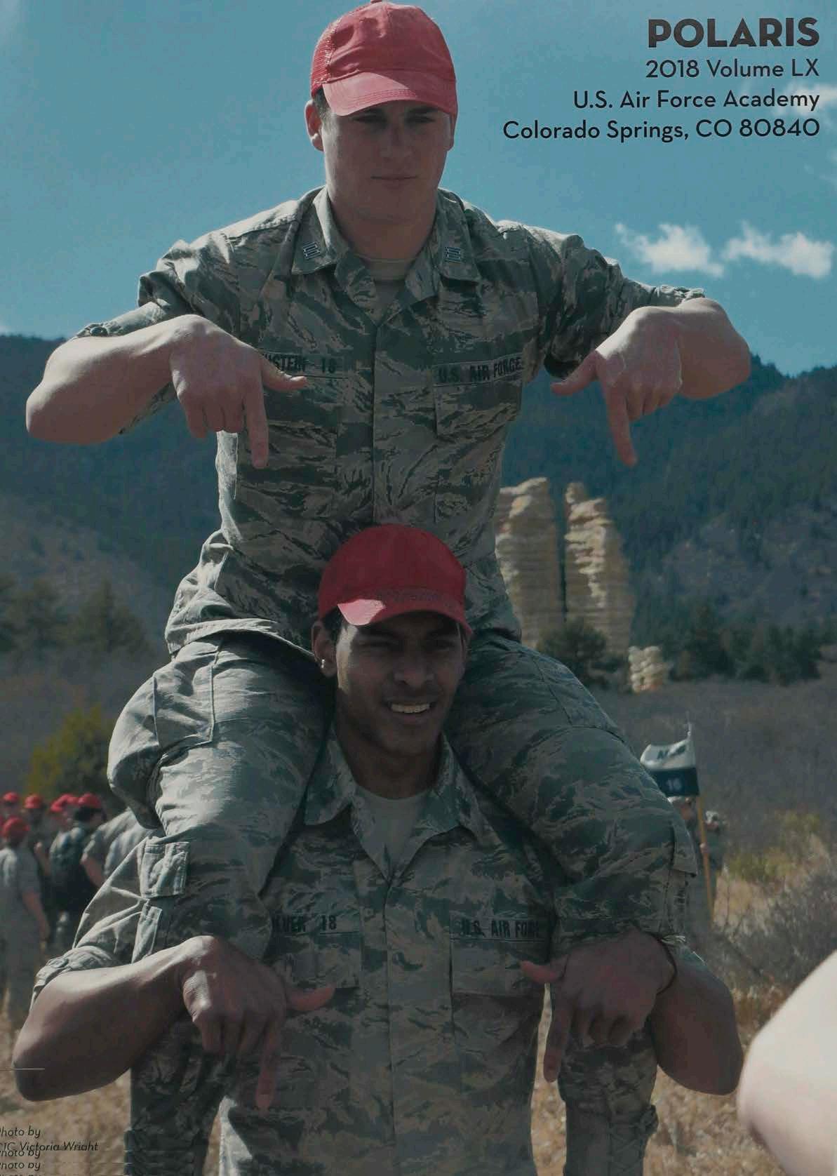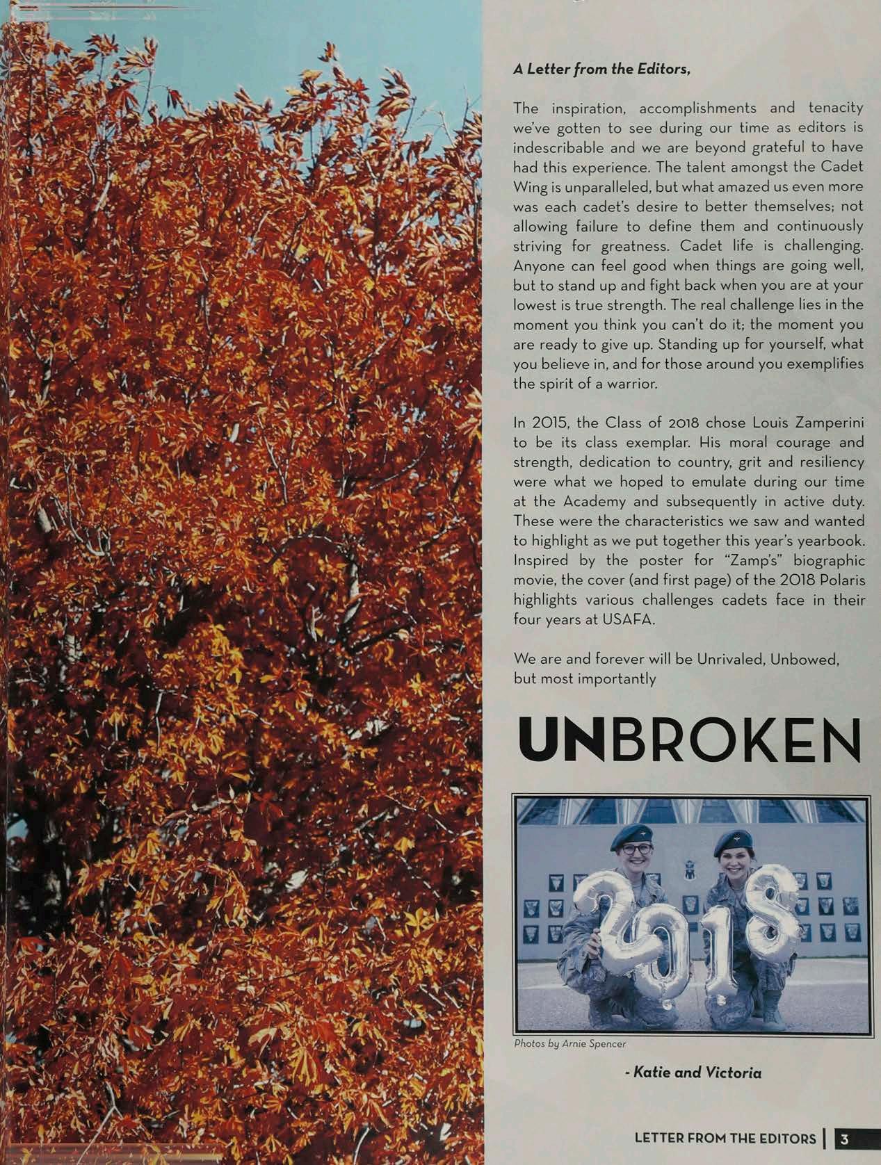 In 2015, the Class of 2018 chose Louis Zamperini to be its class exemplar. Mis moral courage and strength, dedication to country, grit and resiliency were what we hoped to emulate during our time at the Academy and subsequently in active duty. These were the characteristics we saw and wanted to highlight as we put together this year’s yearbook. Inspired by the poster for “Zamp’s” biographic movie, the cover (and first page) of the 2018 Polaris highlights various challenges cadets face in their four years at USAFA.