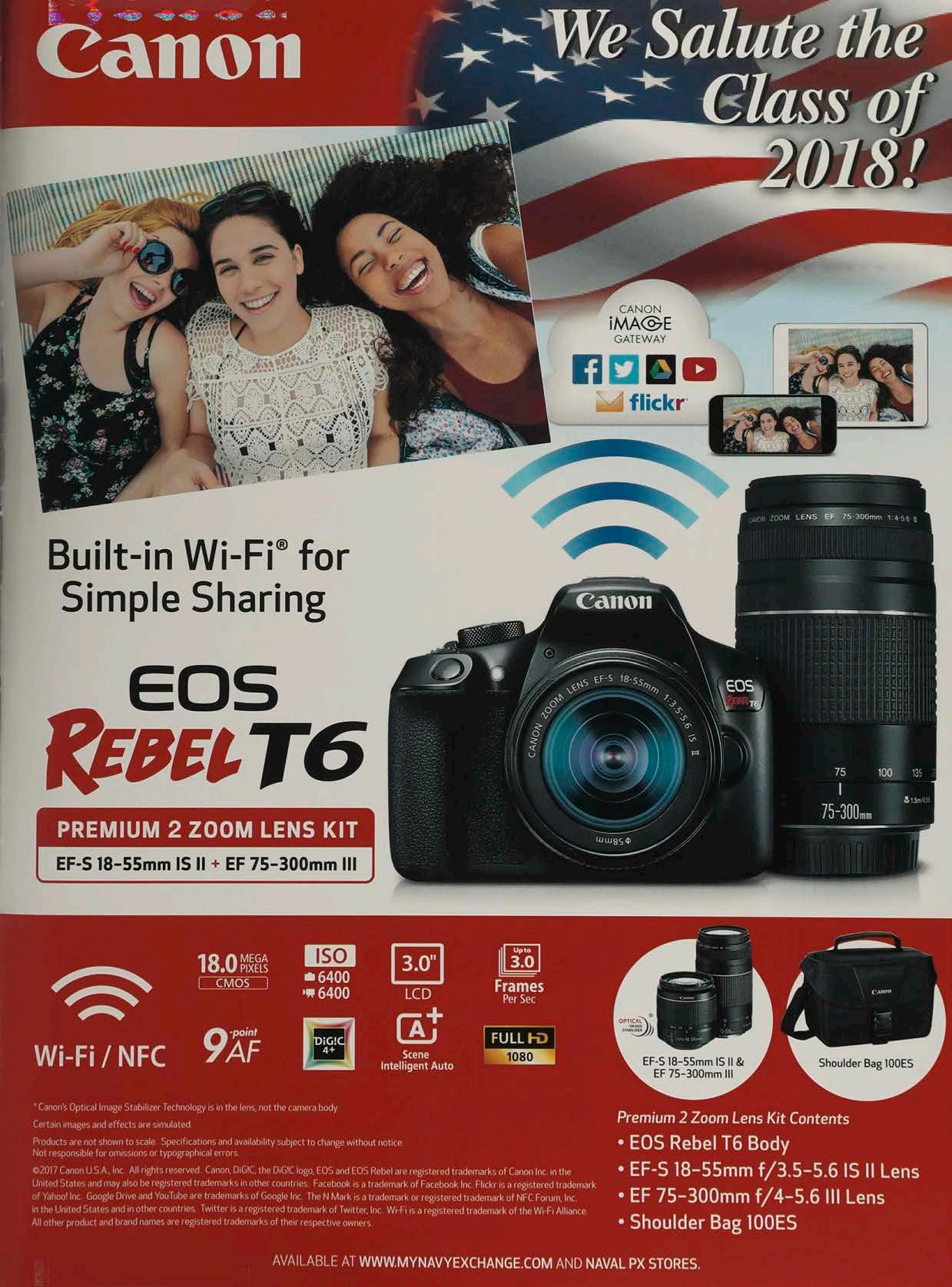 CANON iMA<§7E GATEWAY naao flickr I CMIOH ZOOM LENS EF 75-300mm V. 4-5.6 B Canon Built-in Wi-Fi* for Simple Sharing PREMIUM 2 ZOOM LENS KIT EF-S 18-55mm IS II + EF 75-300mm III Canon's Optical Image Stabilizer Technology is in the lens, not the camera body. Certain images and effects are simulated. Products are not shown to scale. Specifications and availability subject to change without notice. Not responsible for omissions or typographical errors. ©2017 Canon U.S.A., Inc. All rights reserved. Canon, DiGIC, the DiGIC logo, EOS and EOS Rebel are registered trademarks of Canon Inc. in the United States and may also be registered trademarks in other countries, Facebook is a trademark of Facebook Inc. Flickr is a registered trademark of Yahoo! Inc. Google Drive and YouTube are trademarks of Google Inc. The N Mark is a trademark or registered trademark of NFC Forum, Inc. in the United States and in other countries, Twitter is a registered trademark of Twitter, Inc. Wi-Fi is a registered trademark of the Wi-Fi Alliance. All other product and brand names are registered trademarks of their respective owners. AVAILABLE AT WWW.MYNAVYEXCHANGE.COM AND NAVAL PX STORES. Premium 2 Zoom Lens Kit Contents EOS Rebel T6 Body EF-S 18-55mm f/3.5-5.6 IS II Lens EF 75-300mm f/4-5.6 III Lens Shoulder Bag 100ES Shoulder Bag 100ES