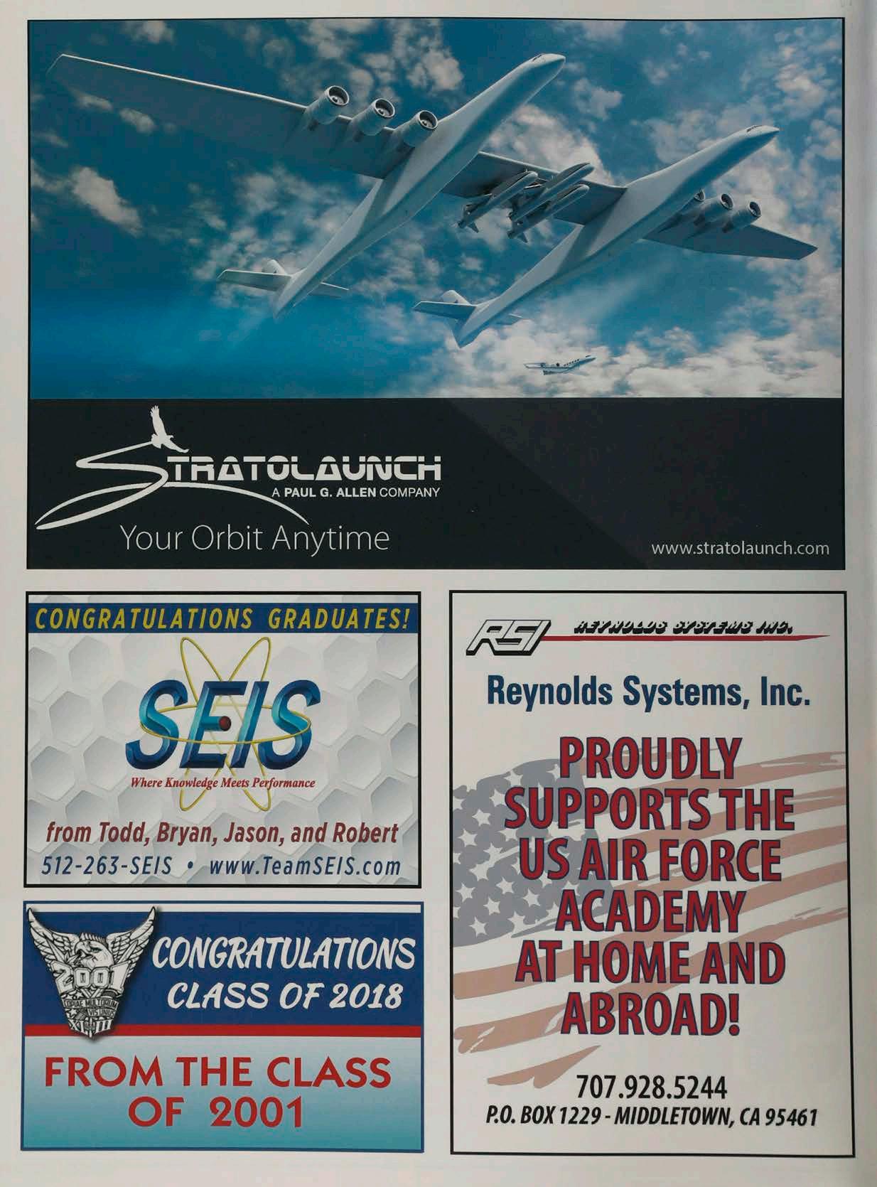 WE PROUDLY SUPPORT THE AIR FORCE ACADEMY! Avionics Test & Analysis Corporation 4540 East Highway 20, Suite 6 Niceville, FL 32578 (850) 897-4553 www.avtest.com CLASS OF 2018 MICHAEL REYNOLDS MIBAR ENGINEERING, CLASSOF 1980 CONGRATULATIONS FROM ZOOMIE RUGBY ALUMNI GROUP MIKE CARTNEY, 81 FROM ROBIN AND TONY SOMMER, 1989 ATLANTA, GEORGIA