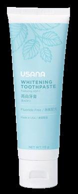 USANA 亮白牙膏是優質的口腔護理之本,其主要 成分能保持牙齒健康。 USANA 亮白牙膏配合正確 刷牙習慣,可潔白牙齒、幫助清除牙菌斑、減少牙 垢附著及減少口臭,有助於降低牙周病發生率,促 進口腔健康。