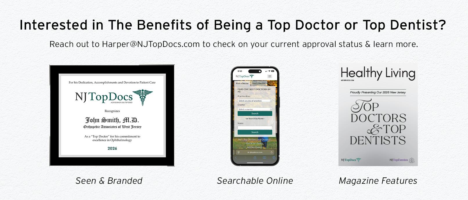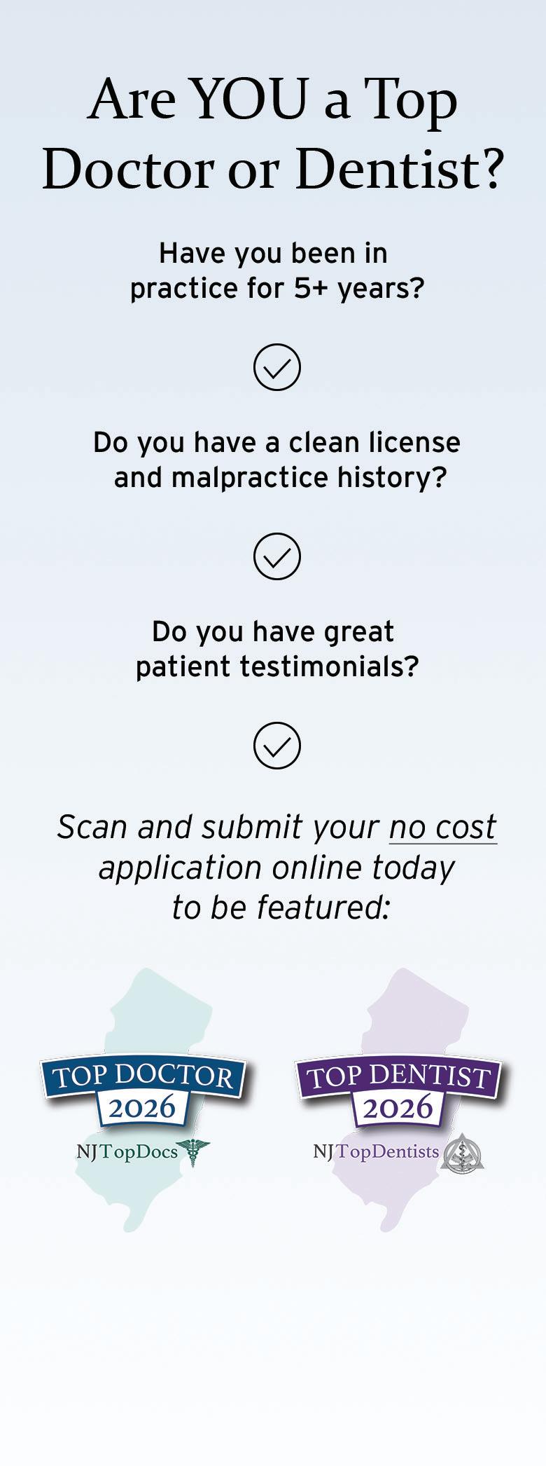 We are an exclusive healthcare resource that reviews healthcare providers (both doctors and dentists) in New Jersey based on merit. Providers that meet a high level of merit-based criteria are awarded the title of NJ Top Doctor or NJ Top Dentist and can be featured online and in our magazine.