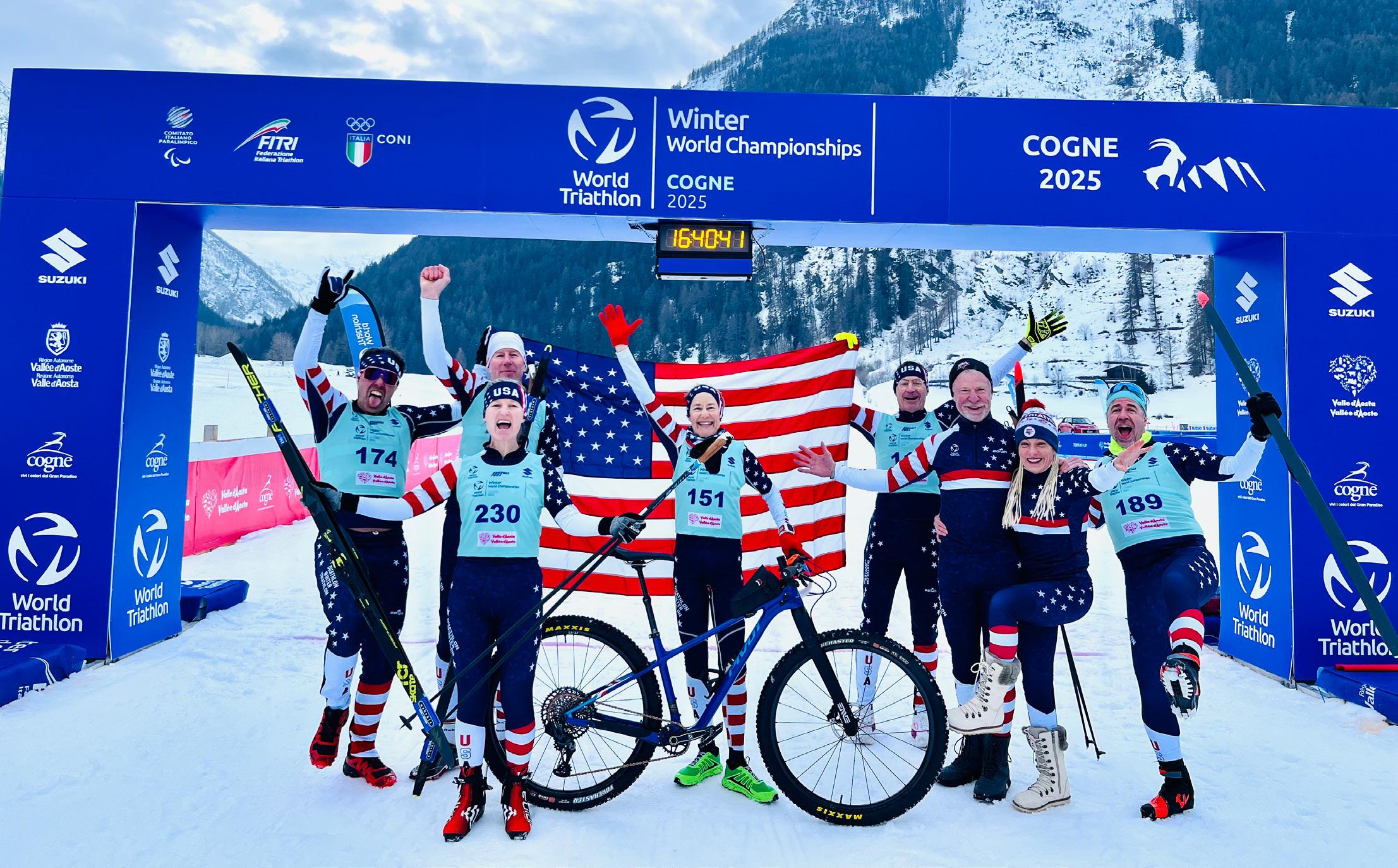 Age Group Team USA athletes raced in Cogne, Italy, at the 2025 Winter Triathlon World Championships, winning five medals.
