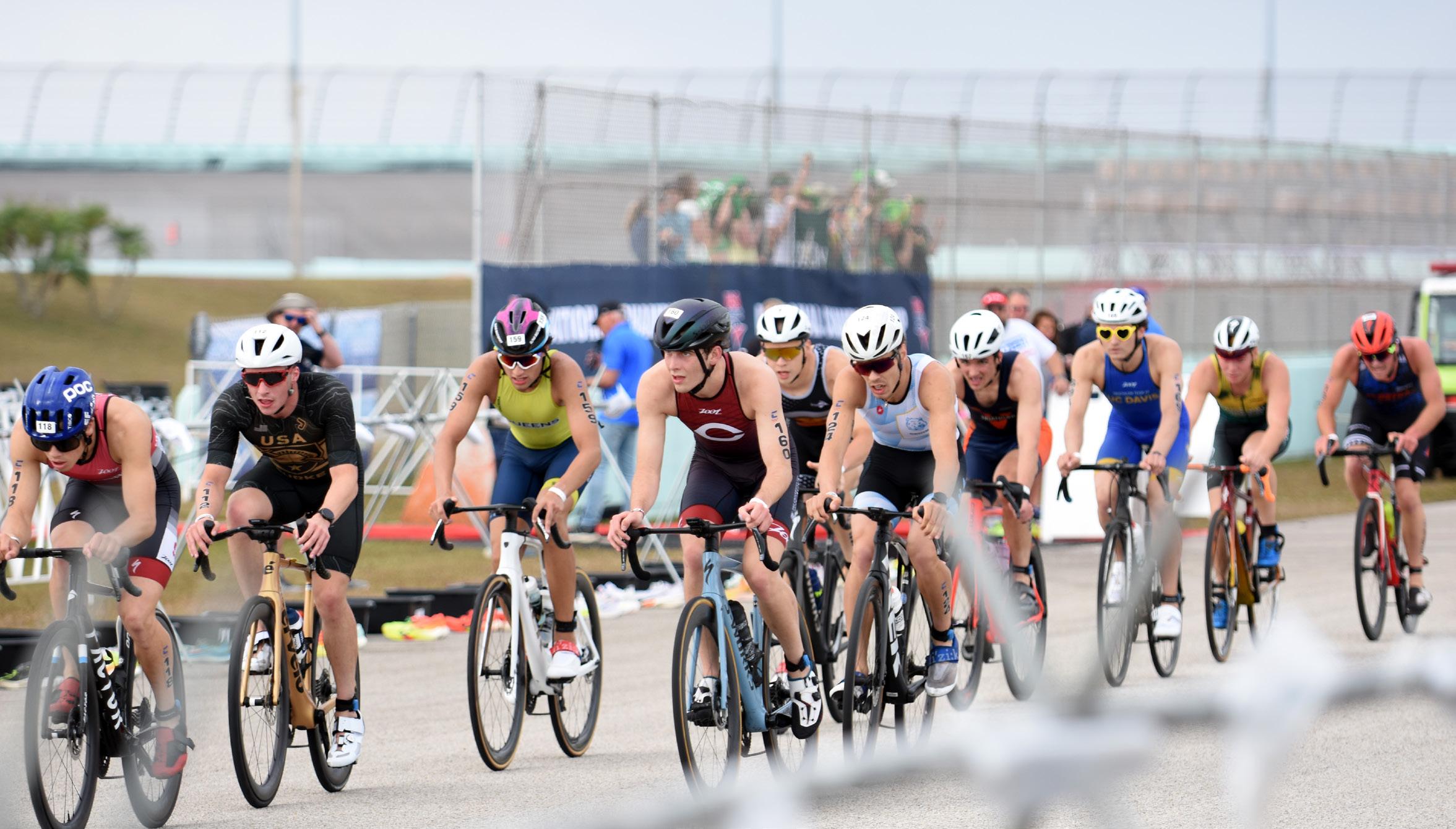 Vroom vroom! U.S. elites Reese Vannerson, Darr Smith and Seth Rider sprint ahead of the pack at the 2025 AmericasTriathlon Cup Miami. Hosted on Homestead-Miami Speedway by CLASH Endurance, the event featured Olympic medalists Rider and Gwen Jorgensen, along with stars of the future Vannerson and Smith.