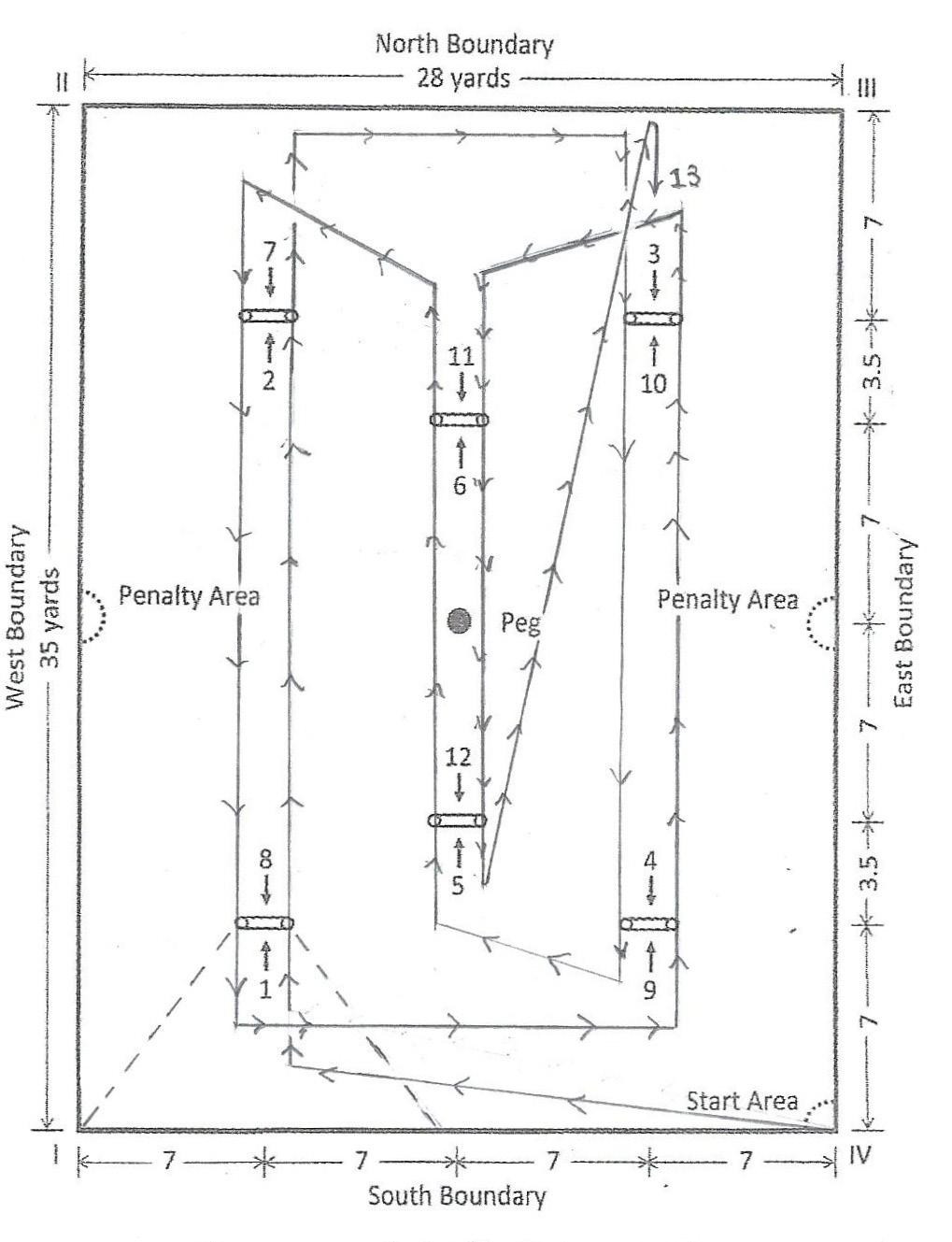 Play proceeds clockwise around the outside four hoops (Hoops 1-4) and then up the center though Hoops 5 and 6. Play proceeds counter clockwise around the outside four hoops (Hoops 7-10 Back) and then up the center though Hoops 11 and 12 Back. If after hoop 12 the score becomes 6-6, a tiebreaker is played. This is called playing Hoop 13, the Hook. Hoop 13 is Hoop 3 played in the clockwise direction. The first player to score wins the game.