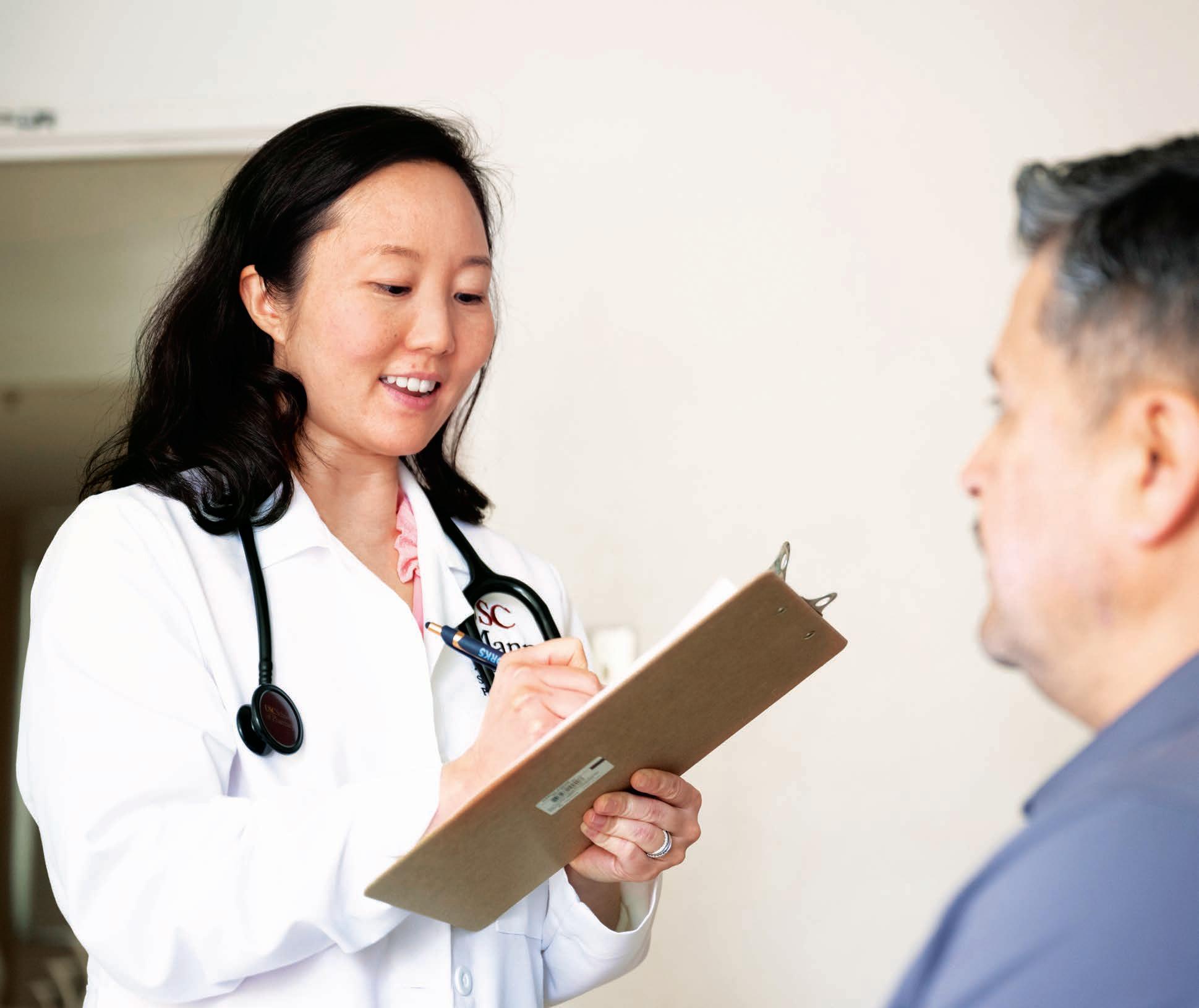 Michelle Chu, assistant professor of clinical pharmacy and a member of the school’s Titus Center for Medication Safety and Population Health, counseling a patient