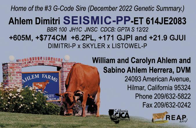 Published monthly at 6486 E. Main Street, Reynoldsburg, Ohio 43068-2362. Copyright by the American Jersey Cattle Association. Subscription Prices: $30.00 per year. The receipt of the Jersey Journal is notification that money on subscription has been received. Email required for receipt of digital Jersey Journal Updating email address: Please send desired email address to jerseyjournal@usjersey. com to have updated in company database. Volume 69 • No. 12 • December 2022 • ISSN: 0021-5953 Sheesleys of Cowbell Acres Reaping the Benefits of Decades of Breeding In this issue: 32 Active A.I. and Foreign Bulls Ranked by GJPI 33 Appraisal Traits for Active A.I. and Foreign Bulls 34 G Code Bulls Marketed by AI Organizations 37 REAP Herds Ranked GJPI Average 18 Sheesleys Reap Rewards of Decades of Breeding 23 Summary of November AJCA, NAJ Board Meetings 29 Top 10 Bulls Ranked within Categories 18 Editor: Kimberly A. Billman Managing Editor: Tracie Hoying Administrative Assistant: Haley Frazier Communications Specialist: Lindsay L’Amoreaux Feature Writer: Michele Ackerman www.USJerseyJournal.com FEATURES COVER Deadline to Nominate for 2023 National Awards is Approaching 27 14 Contributions Made to Support Research and Youth Funds 14 Flavor and Health Key to Dairy Brand Marketing in 2023 14 Konyn Awarded Collinsworth Award 25 Larry Wolfe to Retire from USJersey December 31 36 March 1 is Deadline for Production Contests and Youth Achievement 45 Nomination Form for National Jersey Jug Futurity 27 Nominations for USJersey Awards are Due January 15 14 USDA Extends Deadline for DMC SHORTS 6 AJCA, NAJ Board Members 8 Advertising Index 30 Advertising Rates 14 Along the Jersey Road 10 Calendar 17 Editorial 6 Field Service Staff 43 In Memoriam 6 Jersey Journal Subscription Rates 46 Journal Shopping Center 10 Registration Fees 10 Type Appraisal Schedule REGULAR SALES 26 Dairyland Protein Sale