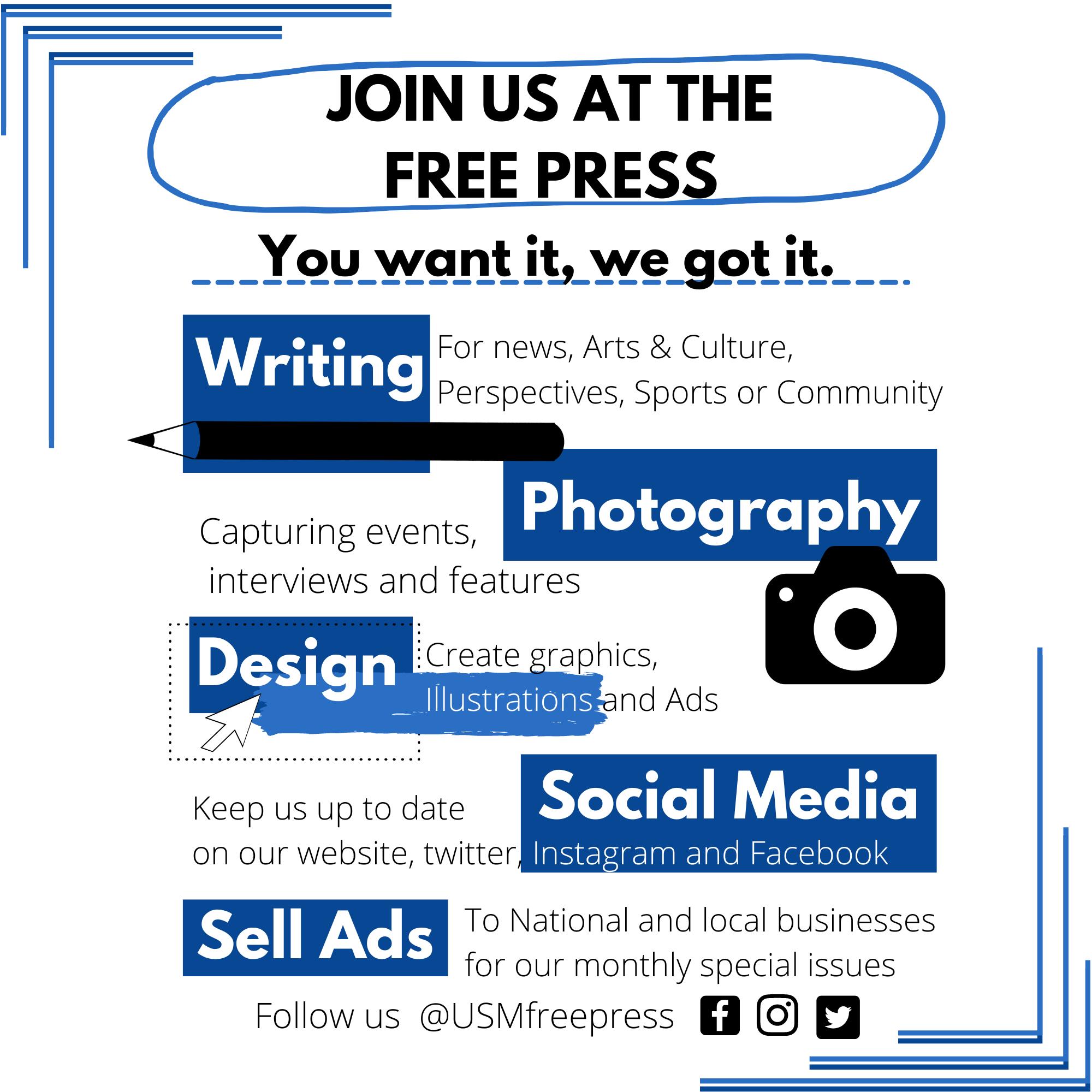 www.usmfreepress.org Interested in working with us? Visit our website at www.usmfreepress.org for a listing of available positions or email editor@usmfreepress with a copy of your resume and cover letter to apply directly.