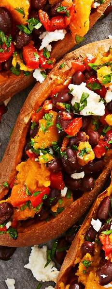 Sweet potato bowl with ½ medium sweet potato, roasted ⅔ cup chickpeas, sautéed 2 cups roasted broccoli and red onion