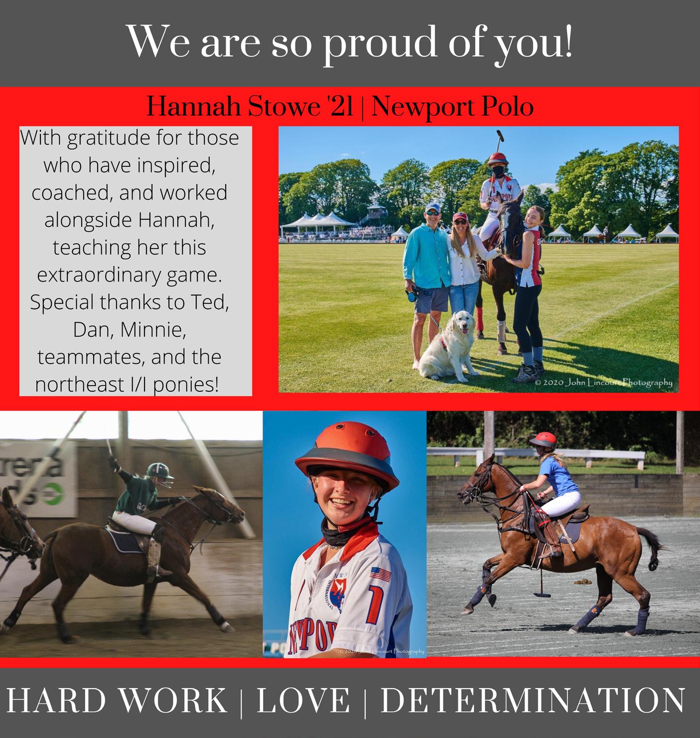 The impact of the COVID-19 pandemic has made this a particularly challenging year. The Northeastern Intercollegiate Regional and both the Interscholastic and Intercollegiate Nationals for 2019-2020 were canceled after being postponed to the fall due to concerns about travel restrictions and the spreading virus. This was a major disappointment to the players who had worked so hard to win a spot at the tournament as well as the host sites, horse providers, umpires and others involved in pulling off such large events. In planning for the 20202021 season, it quickly became clear that the college programs would struggle to compete. Many colleges have not allowed players to go to the barn and others are prohibited from traveling even if they can practice. At this writing, we are working through plans for some type of modified collegiate tournament season and hope that we can offer events to those teams that can participate. The silver lining to all of this is that we have seen many of our current players and recent alums competing in USPA events across the country. We continue to see I/I alum dominate the trophy stand in tournaments across the country such as the Pacific Coast Open, the USPA Women’s Arena Open™, the USPA Women’s Arena Handicap®, the Texas Women’s Open and the H. Ben Taub Memorial to name a few. Clearly I/I continues to make things happen!