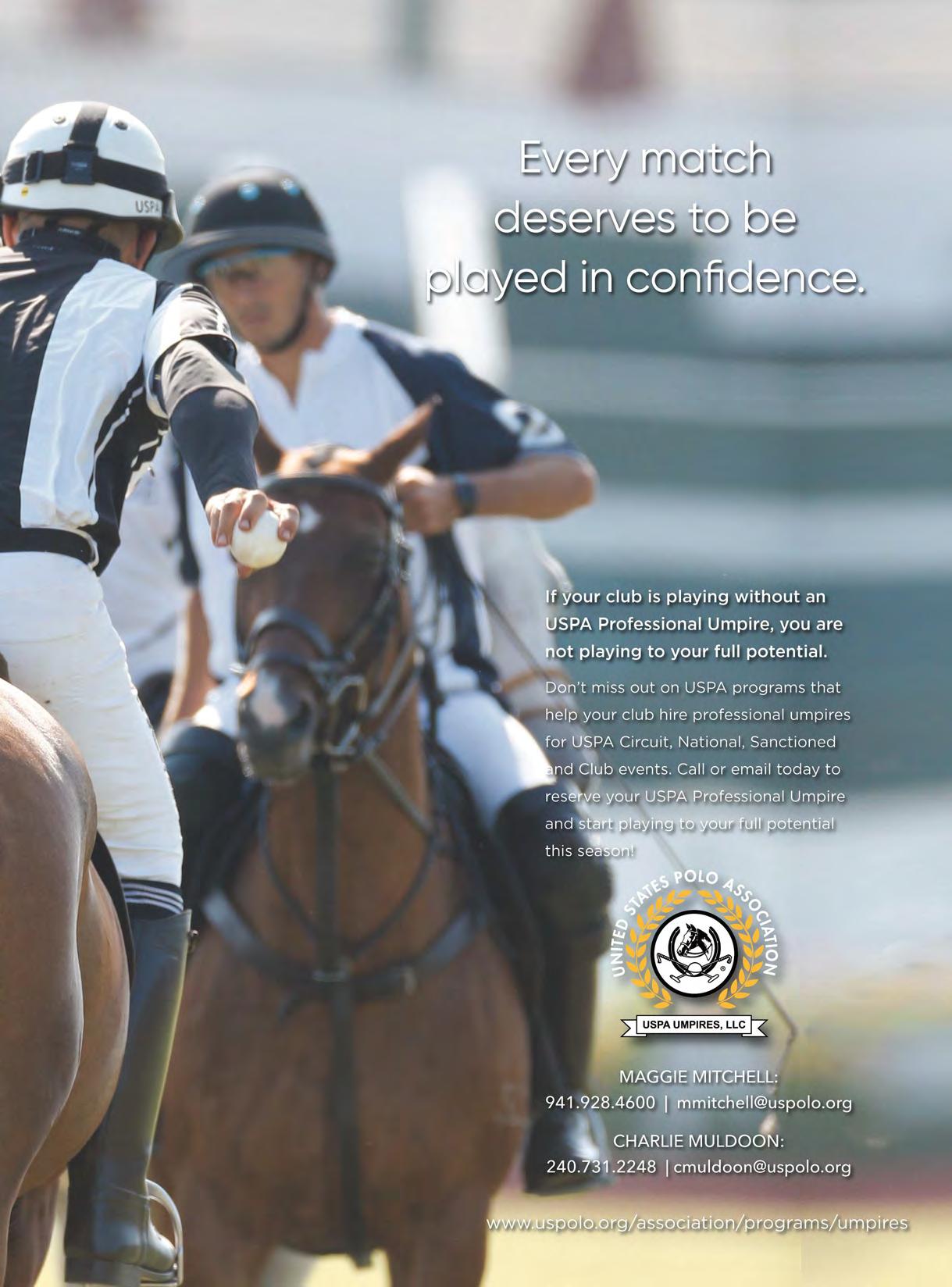 POLO Players’ Edition (ISSN #1096-2255) is published monthly by Rizzo Management Corp. 6008 Reynolds RD, Lake Worth, FL 33449 for U.S. Polo Association, 9011 Lake Worth RD, Lake Worth, FL 33467. Periodicals postage paid at West Palm Beach, FL and additional mailing offices. (USPS: 079-770).