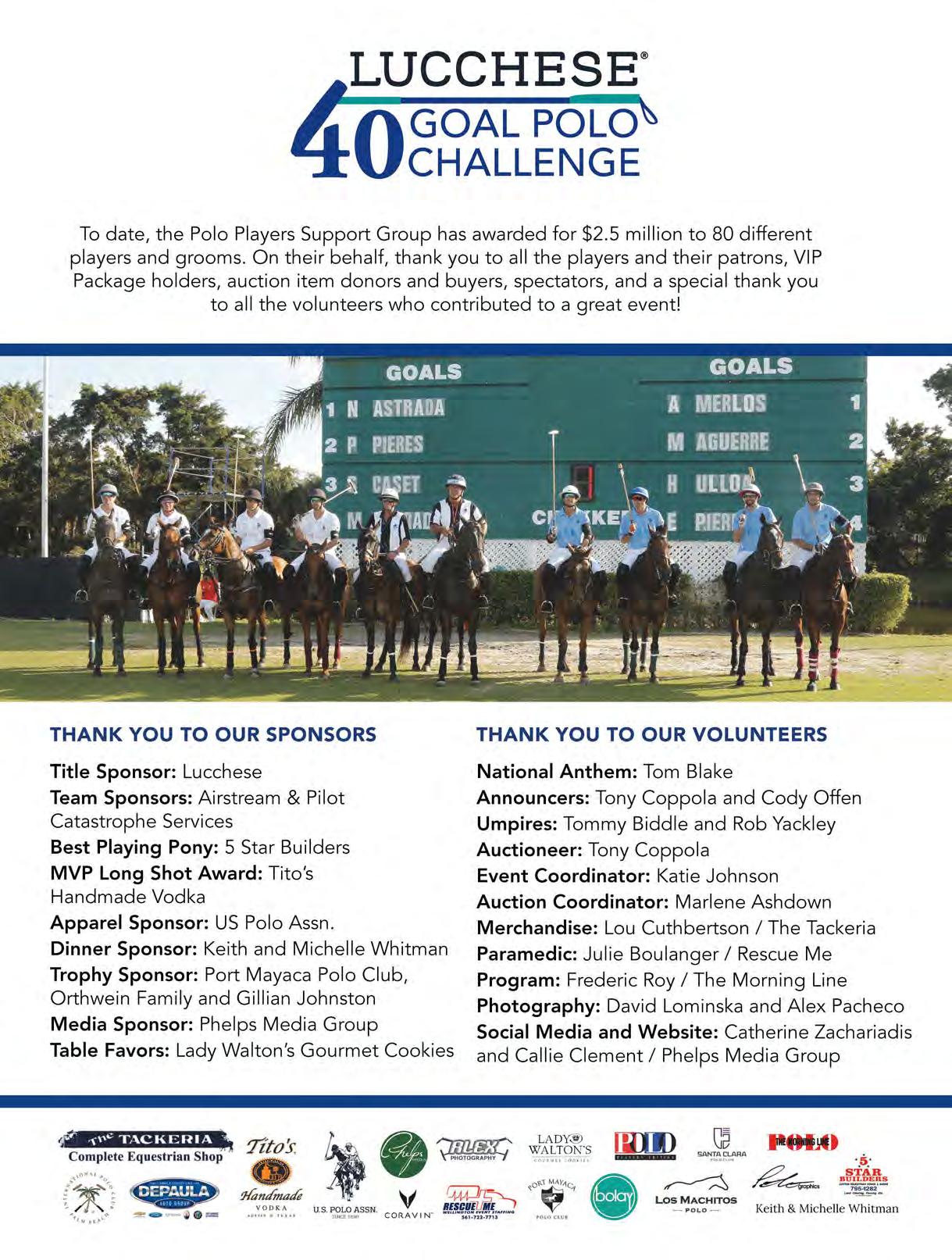 It didn’t take long before members of the polo community needing financial assistance were identified. Six individuals benefited from aid that year. Not a year has gone by without multiple members of the polo community in need of assistance. In fact, 2018 saw a record 17 individuals that received assistance.