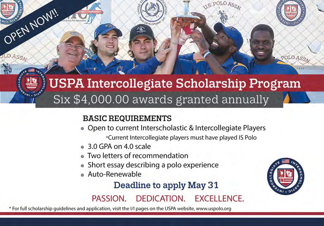 Are you a current intercollegiate or senior interscholastic player, planning on playing on an intercollegiate polo team? Six $4,000 scholarships are available through the USPA Intercollegiate Scholarship program. Requirements can be found on uspolo.org. Applications will be accepted from April 1 to May 31. Contact Emily Dewey at edewey@uspolo.org for more details.
