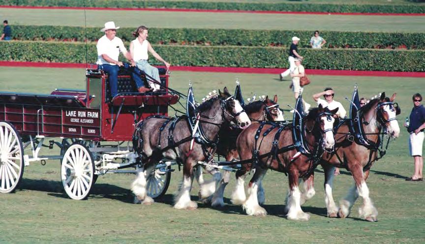 The crowd surged on to the field and watched in anticipation as George and Barbara Alexander drove their beautiful team of Clydesdales pulling a wagon full of 10-goal stars to center stage for the trophy presentation.