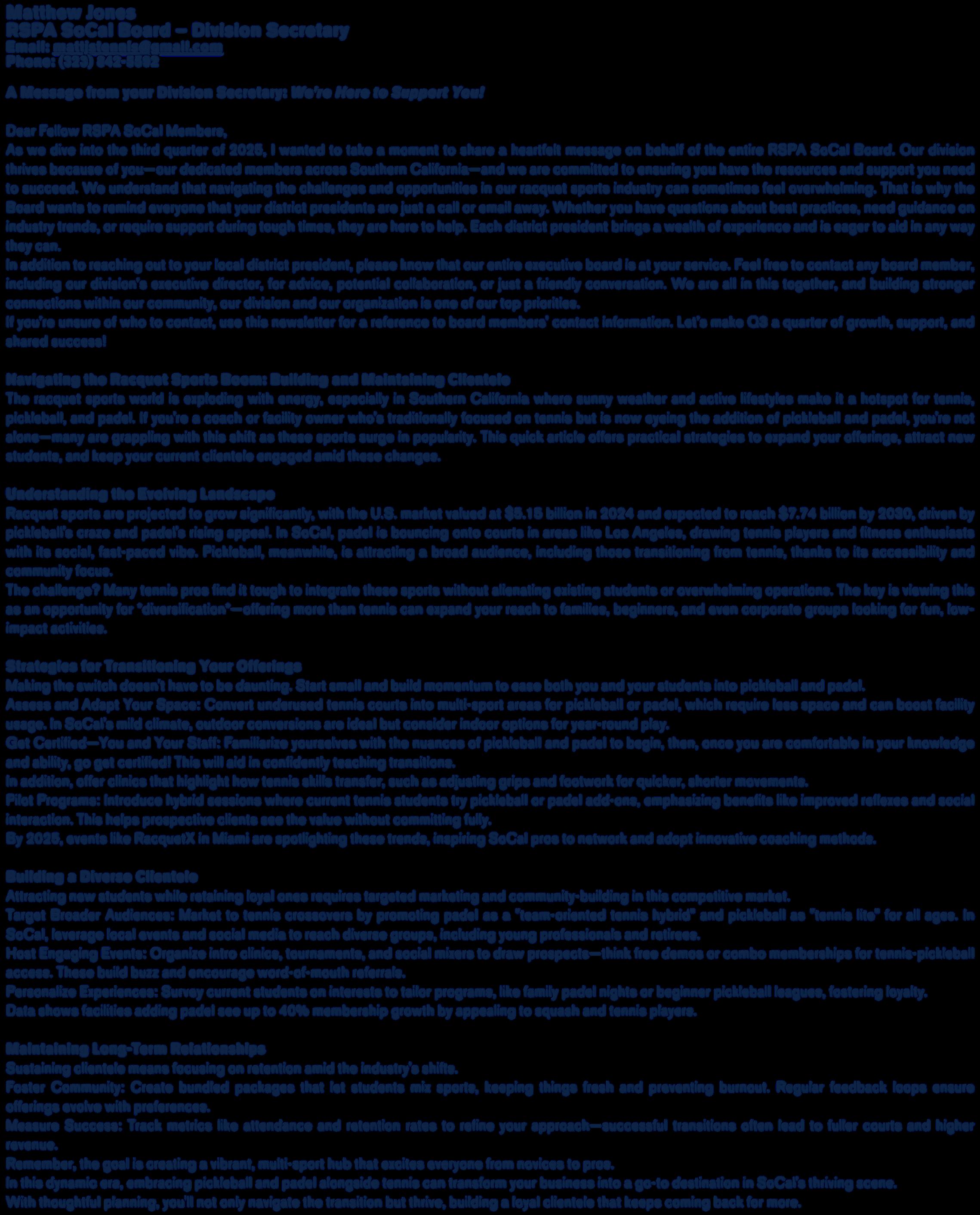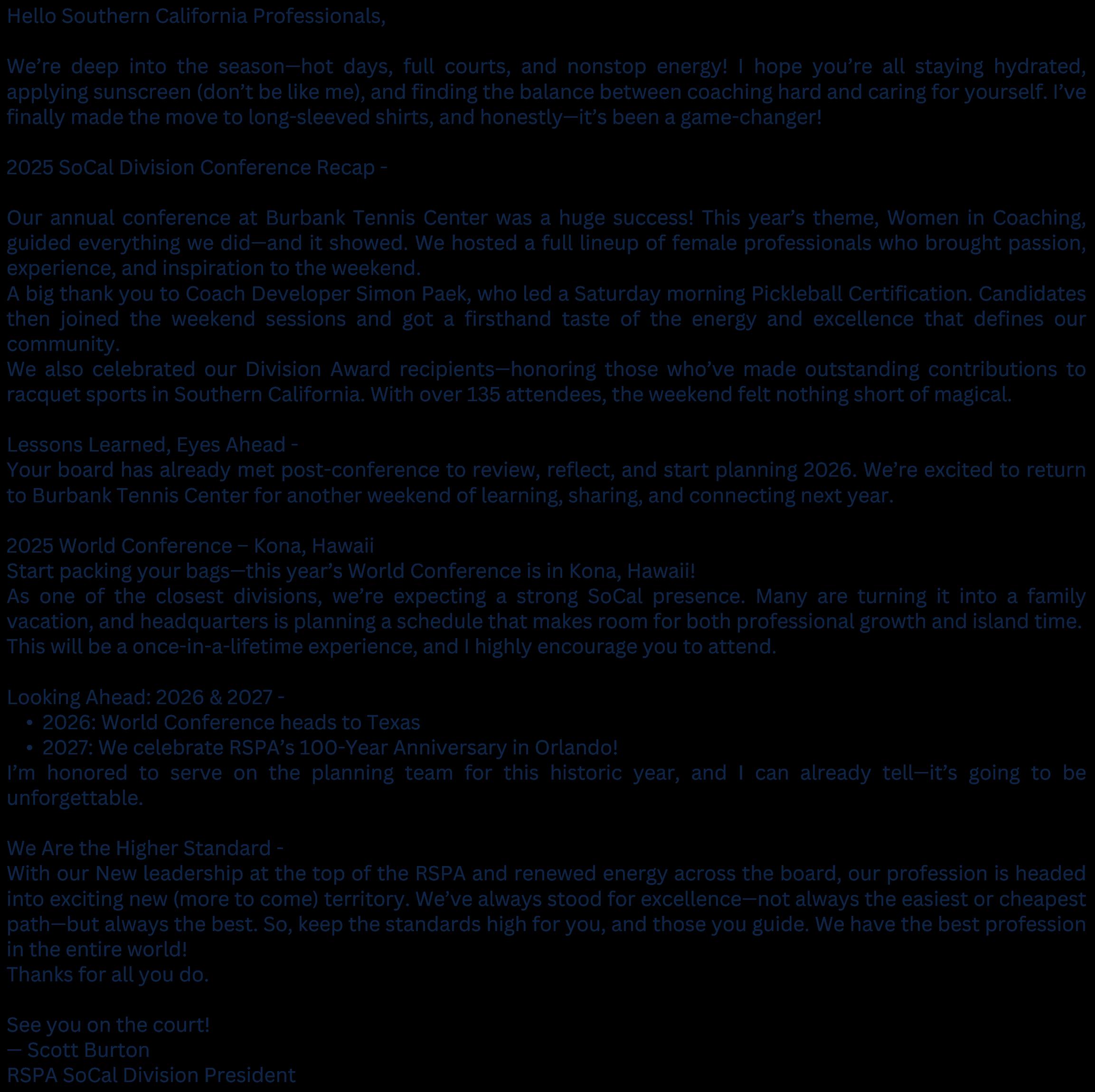 I hope you're all enjoying a great summer season. I’d like to take a moment to share some updates about our Southern California Division and invite you to get more involved in our growing Racquet Sports Pros Association.
