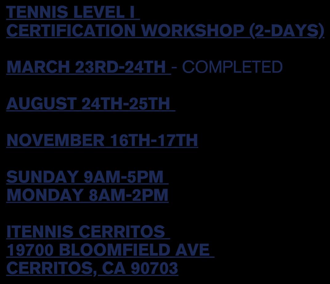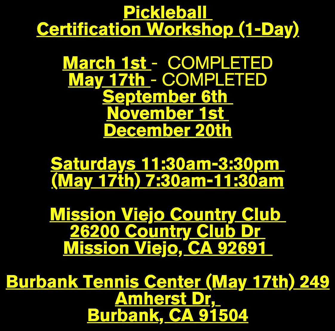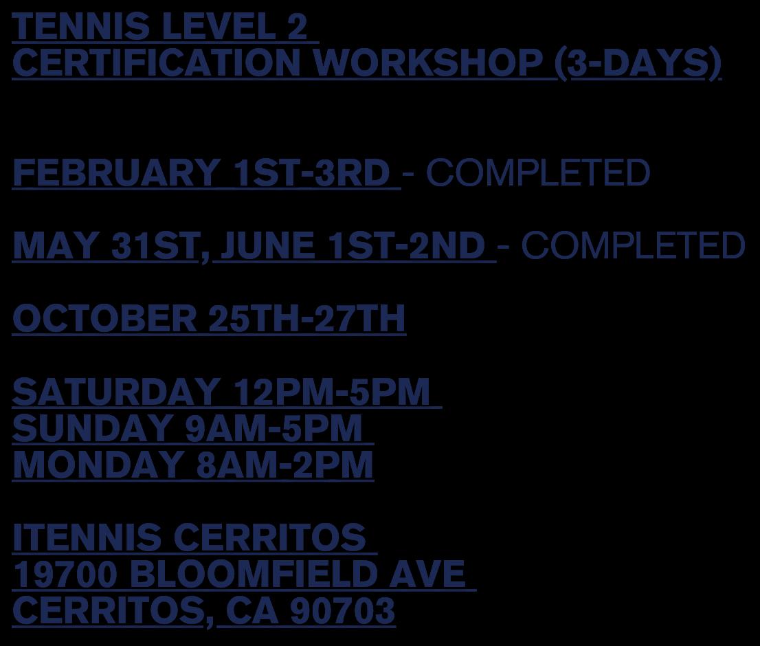 I hope everyone is enjoying a great 2025! The following is the Certification I hope everyone is enjoying a great 2025! The following is the Certification Calendar for the year for Level I, Level II as well as for Pickleball: Calendar for the year for Level I, Level II as well as for Pickleball: