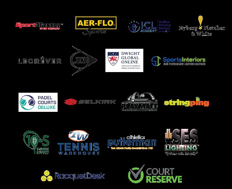 10-S Tennis Supply, Aer-Flo Sports, CourtReserve, ICL Academy, LEORÊVER, NFW Promos, Playmate Tennis Machines, Putterman Athletics/ Sports Interiors, RacquetDesk, SES Lighting, Selkirk, SportMaster, String Ping