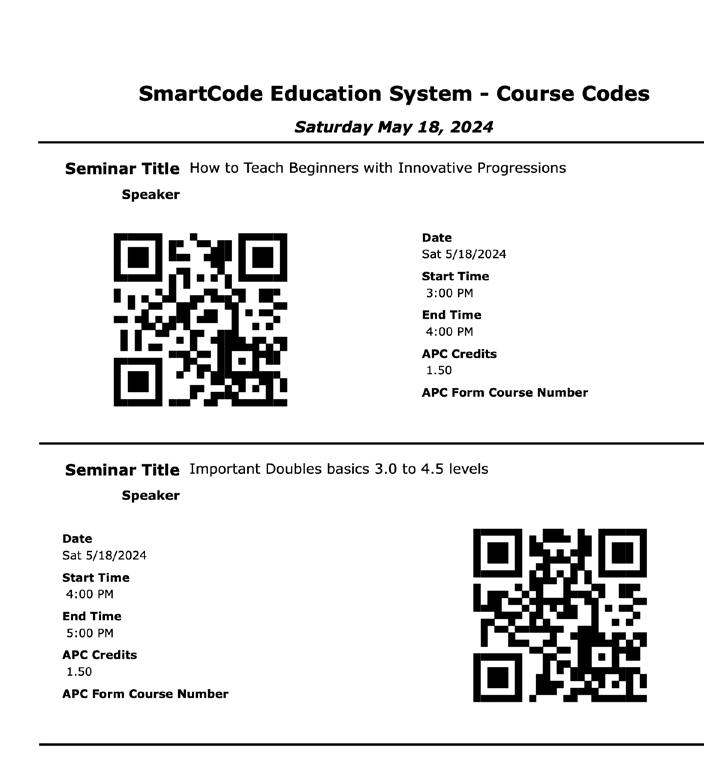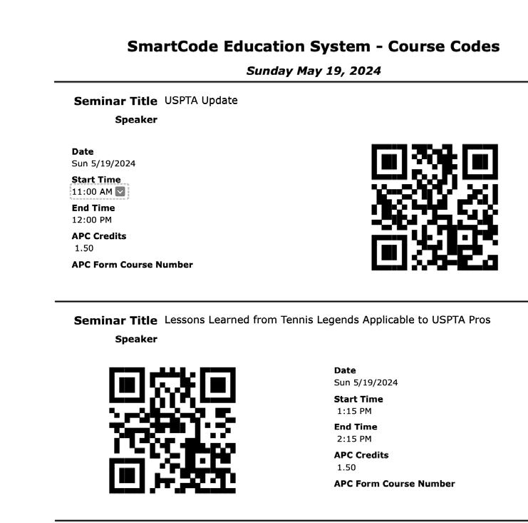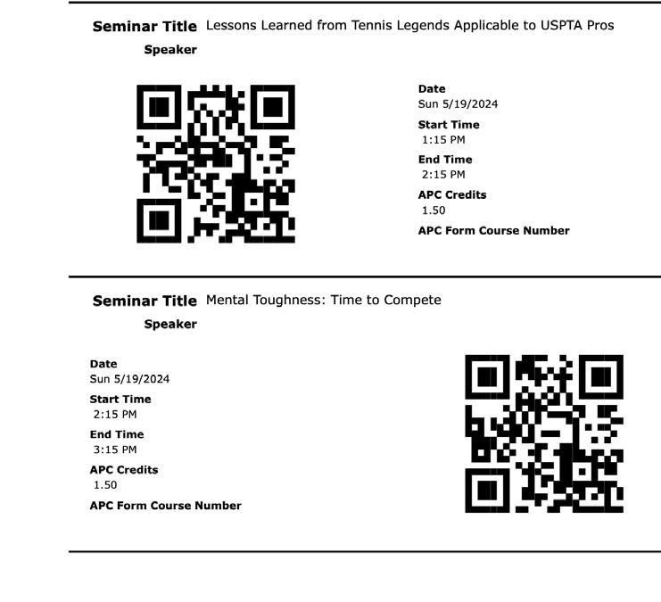 New for the 2012 World Conference on Tennis! Register your Accredited Professional Coach (APC) and specialty course credits earned at the USPTA World Conference with the new quick and easy-to-use USPTA SmartCode Education System. Use your smartphone to instantly register your attendance to all USPTA seminars, general sessions and specialty courses, earning APC and specialty course credits toward USPTA education.