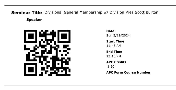 To use the system at a seminar, general session or specialty course, you must scan two QR codes. One QR code is on your conference badge. The second QR code will be posted in the seminar/specialty course room at the end of the session.