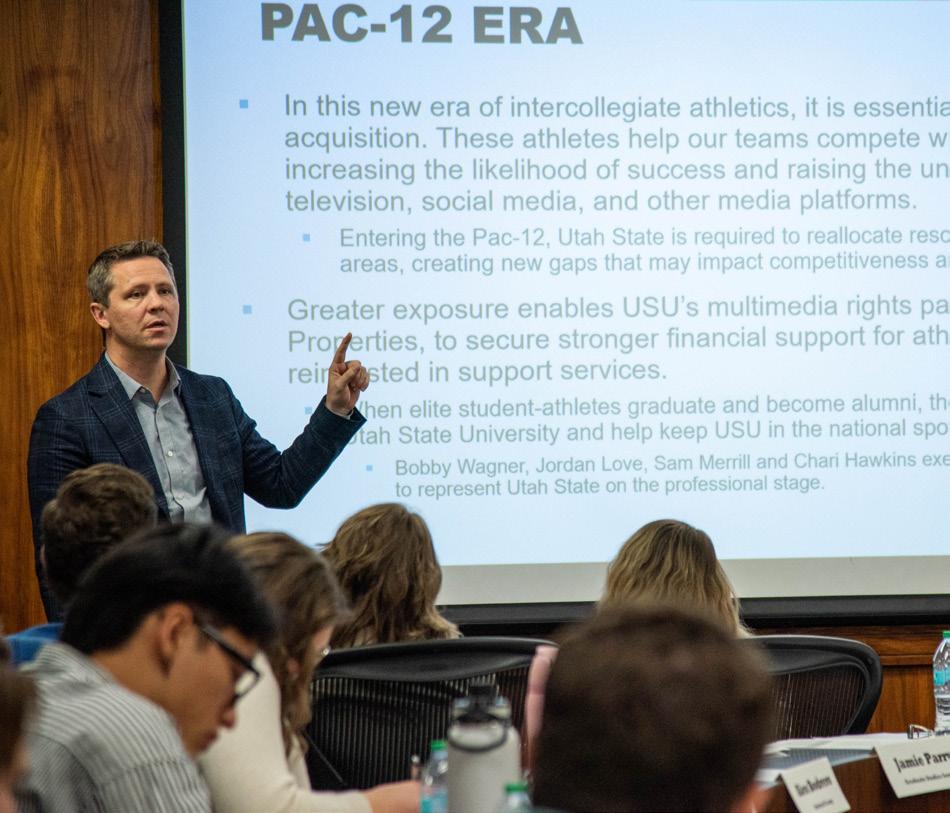 USU Director of Athletics Cameron Walker talks about the change to the Pac-12 Conference to the USU Student Fee Board in the TSC Senate Chambers on Jan. 21.