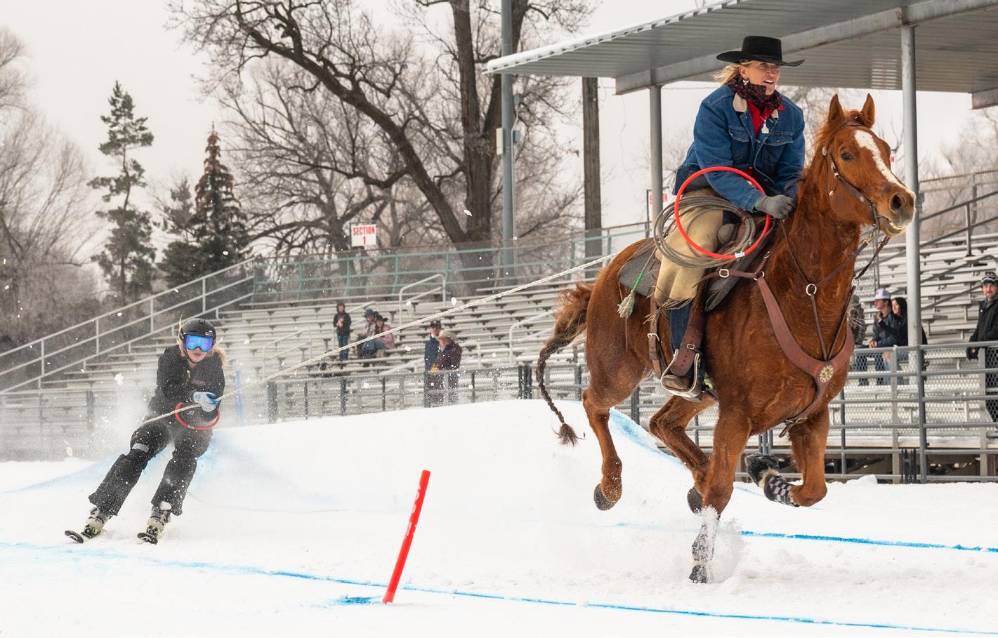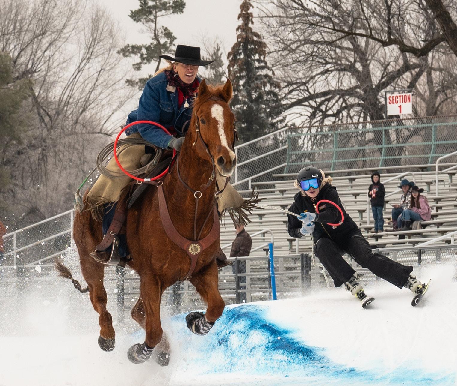 The Logan event was part of the PRO SkiJor Frontier Tour, a professional skijoring series that blends Western rodeo culture with winter sports. Skijoring teams consist of a horse and rider, paired with a skier or snowboarder who holds onto a tow rope while navigating gates and jumps along a flat course. Teams are timed, with penalties added for missed obstacles.