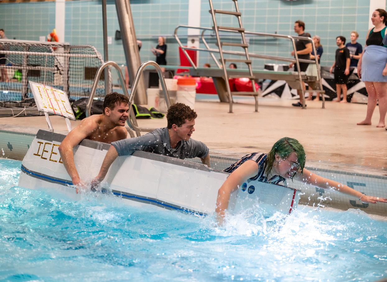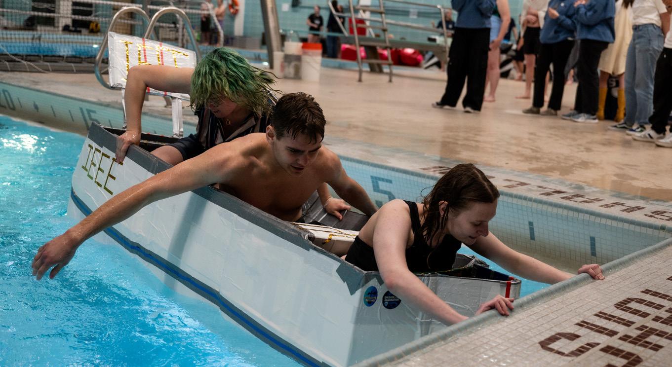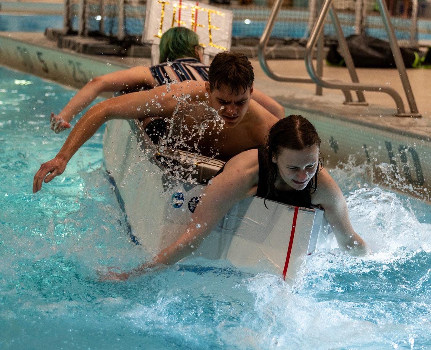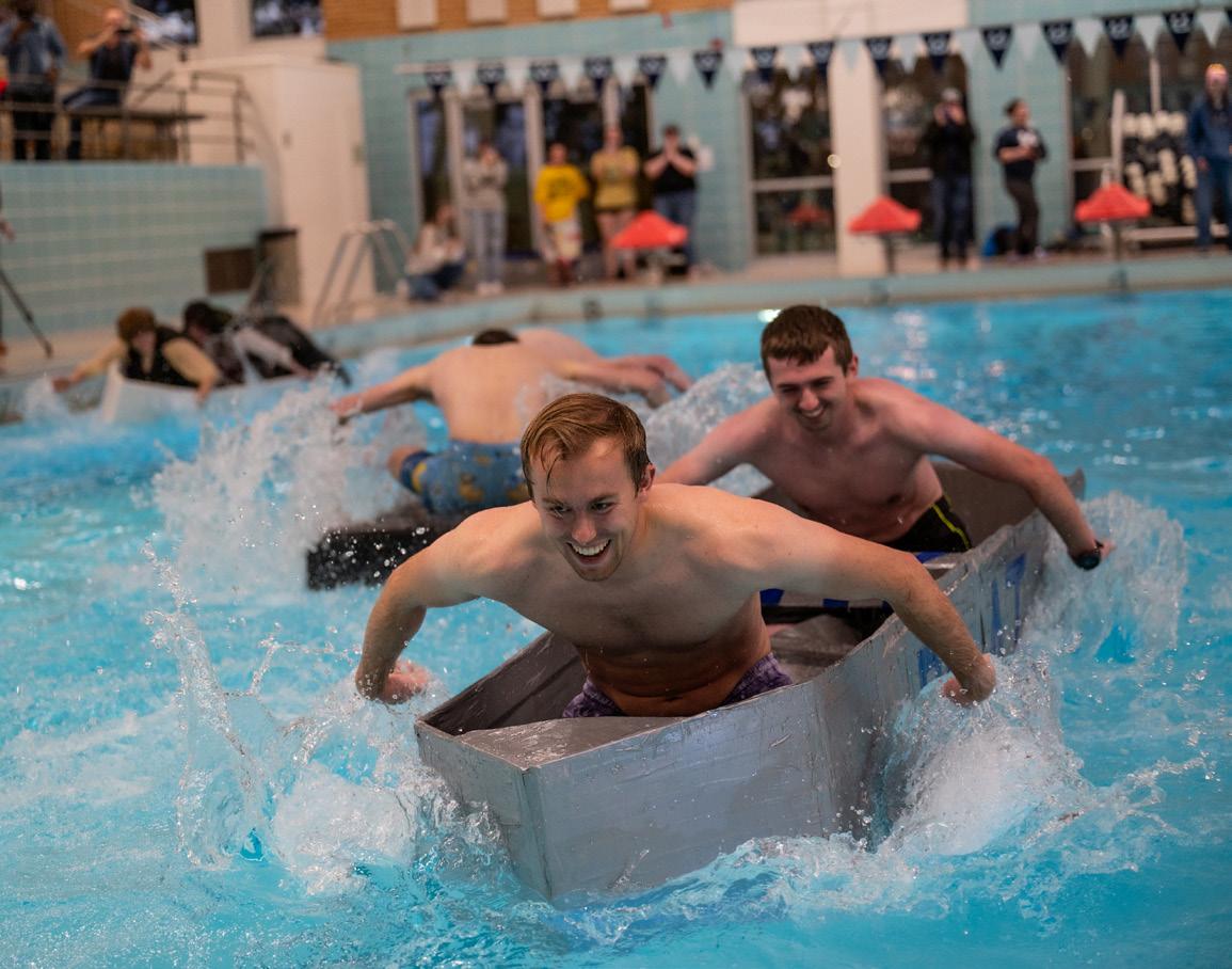 On Feb. 25, 12 teams launched handmade boats built entirely from cardboard and tape into the water, competing first for crowd approval and then for speed. The event began with a design competition where teams presented their boats poolside and the winner was determined by the loudest cheer from spectators. After the crowd-selected champion was crowned, the races began.