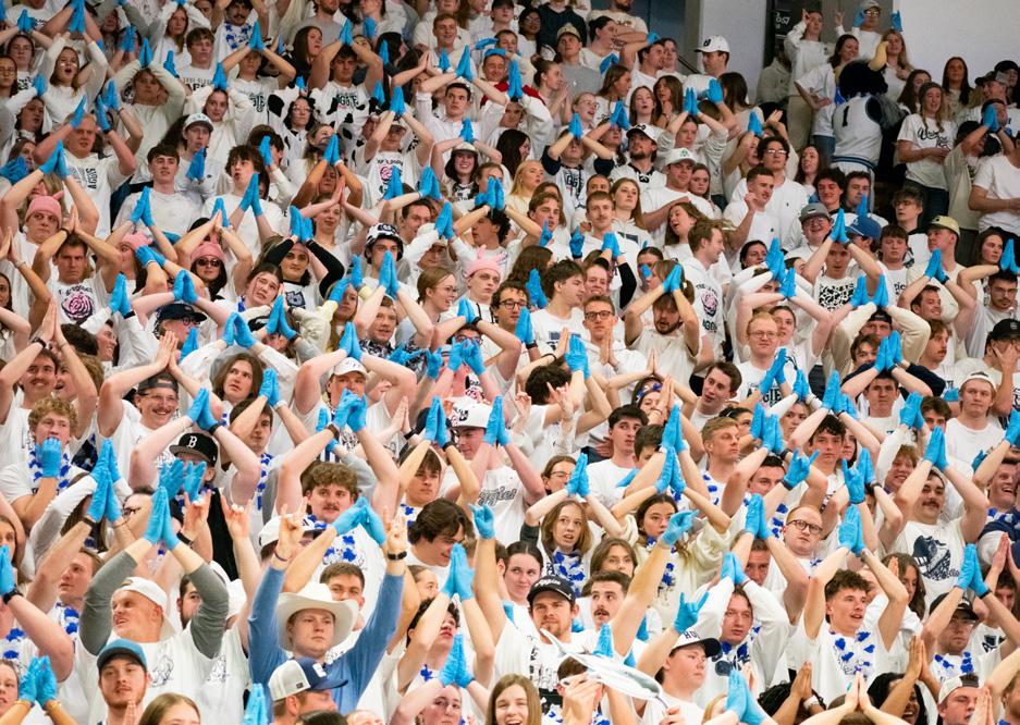 PHOTO BY Elise Gottling Members of the HURD hold their hands up during a USU Men’s Basketball game against Boise State at the Dee Glen Smith Spectrum on Feb. 18.