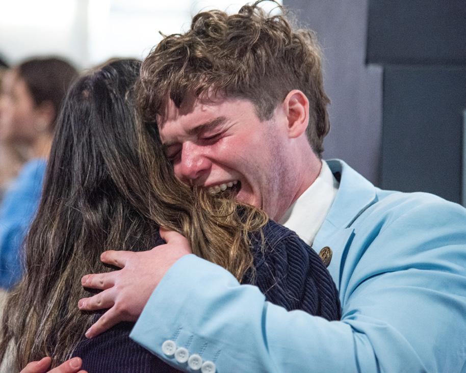 Newly elected USUSA President Max Alder, right, hugs re-elected Clubs & Organizations Executive Director Mia Bean after hearing the elections announcement on Feb. 25 in the TSC Hub