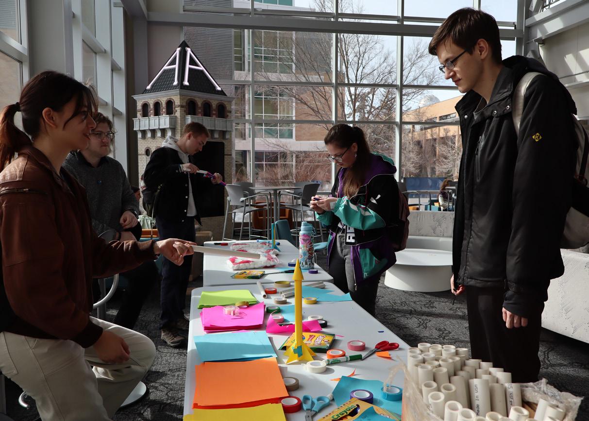 Students make paper rockets at the Engineers Without Borders event in the Engineering Building, as seen on Feb. 23.