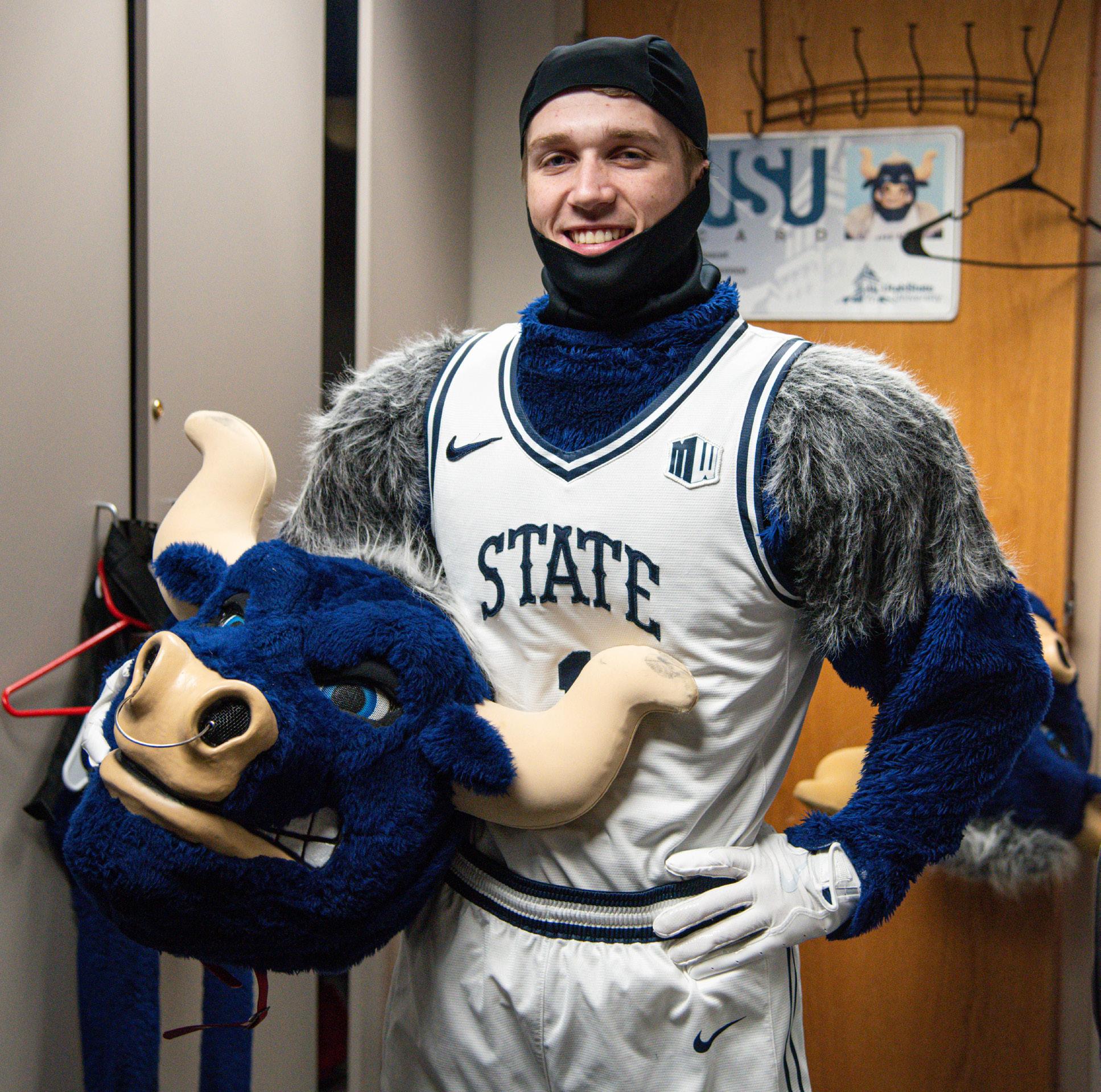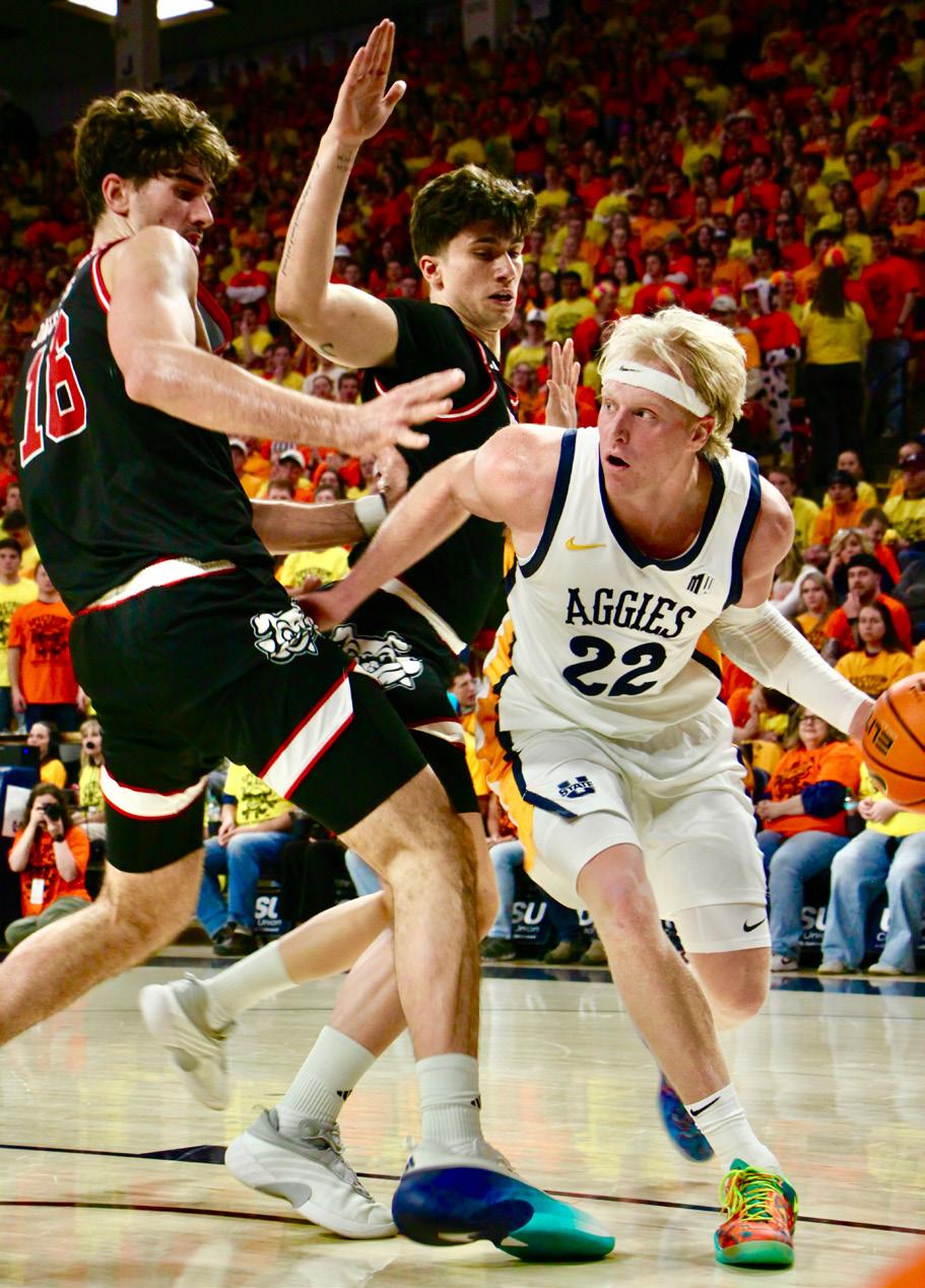 With his wavy, bouncing blonde hair held back by what has become a signature headband, junior forward Karson Templin has grown into a pivotal piece for Utah State University Men’s Basketball. In his third year with the program, Templin has not only played an important role for head coach Jerrod Calhoun’s Aggies, but he’s also become a fan favorite, as evidenced by the frequent, rhythmic chanting of his name by the HURD when he’s on the floor.