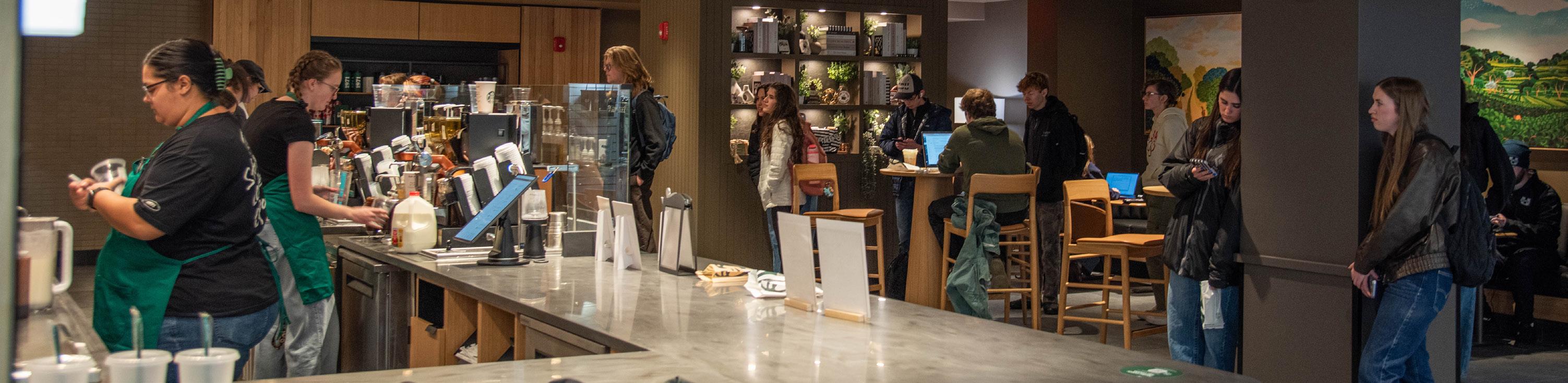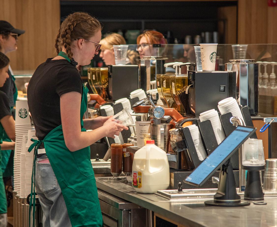 Starbucks employees work their first day in the TSC for the grand opening on Feb. 23.