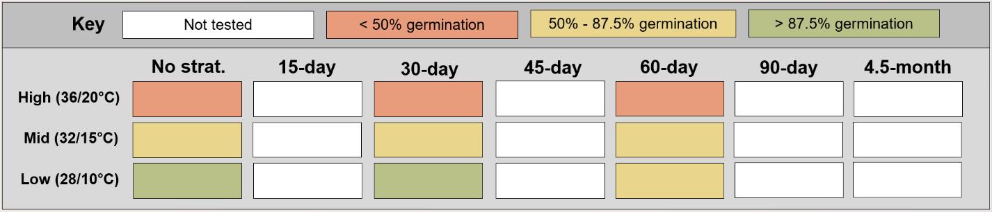 Notes: The alternative protocol will yield similar germination (1%–5% lower) at a similar speed. Dormancy break treatments performed consistently between germination temperature regimes.